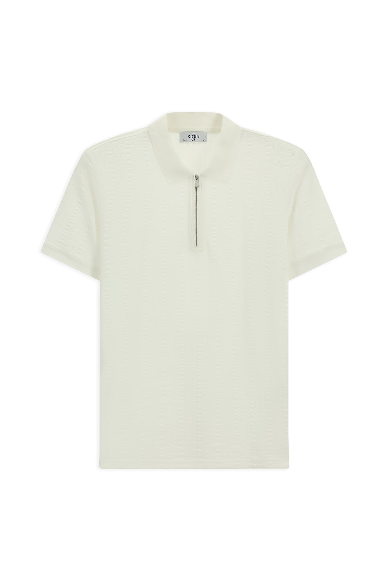 Kırık Beyaz Slim Fit Dar Kesim Pamuk Desenli Fermuarlı Polo Yaka Tişört