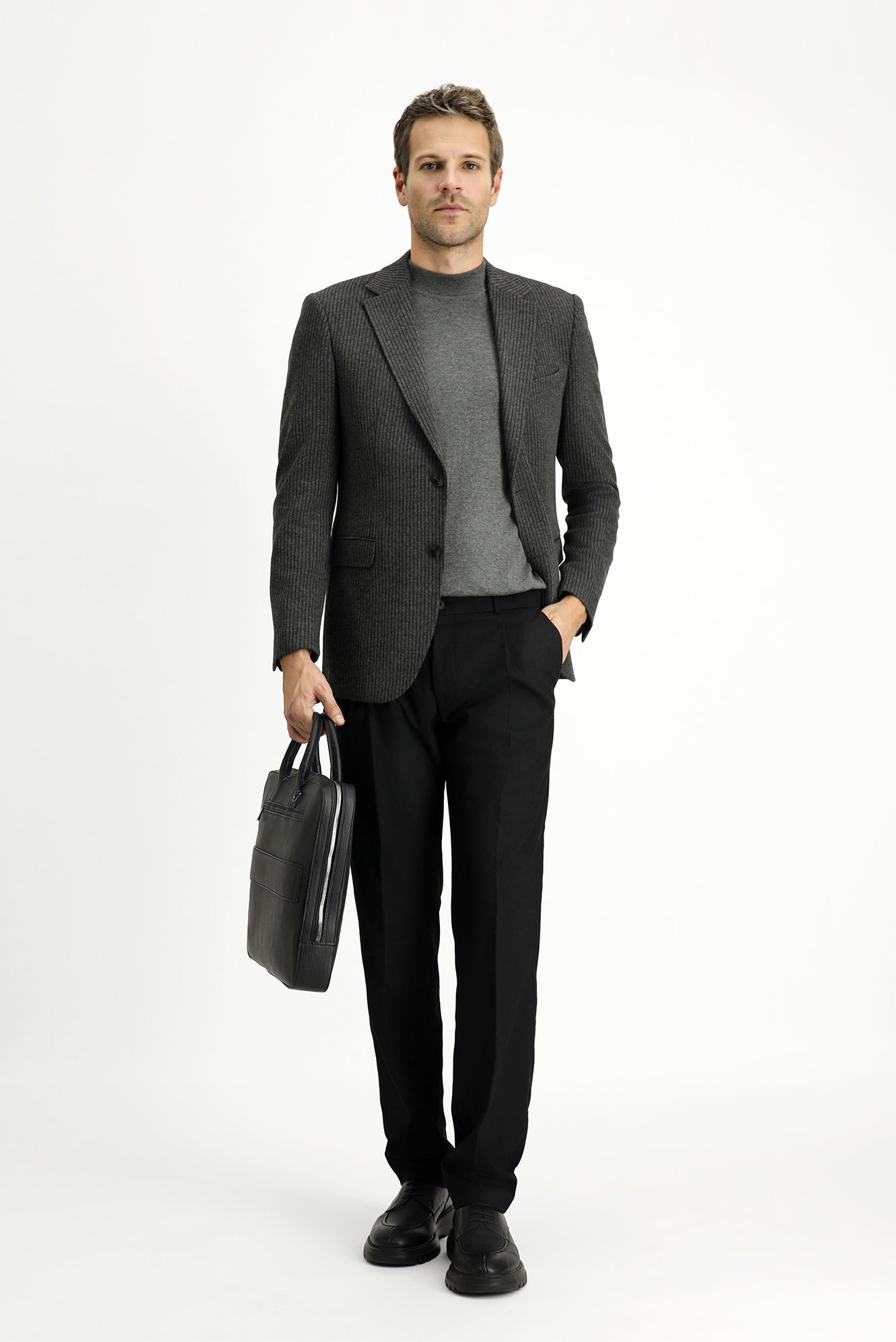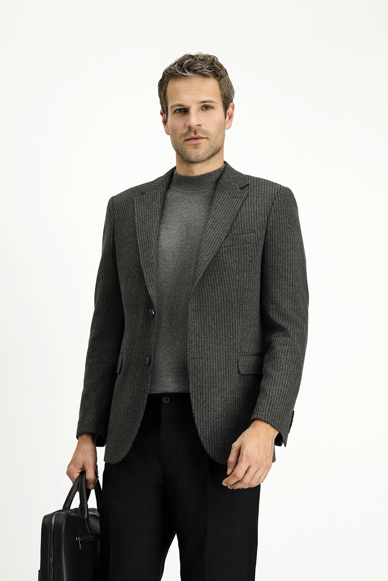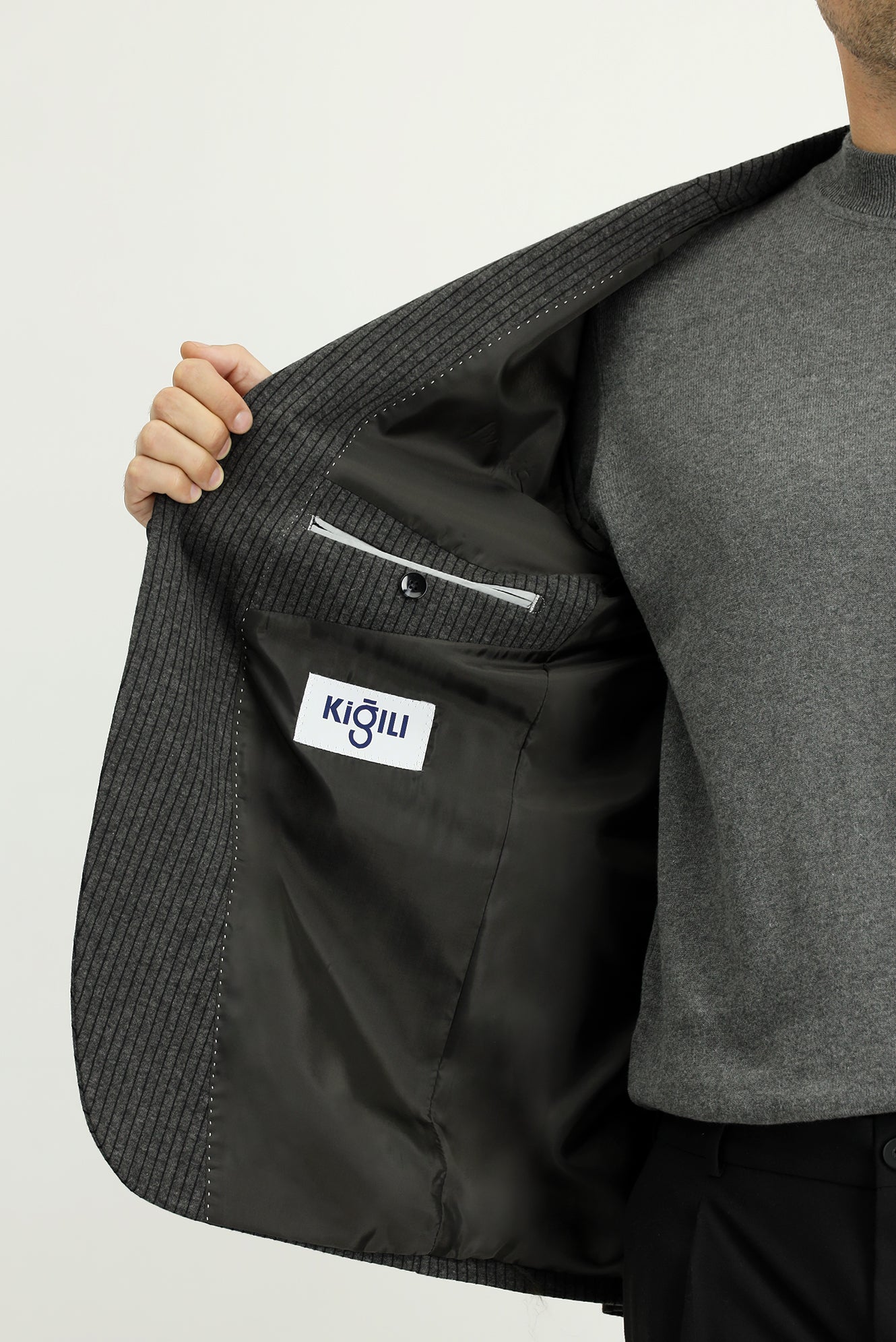 Koyu Antrasit Slim Fit Dar Kesim Klasik Çizgili Pamuklu Örme Ceket