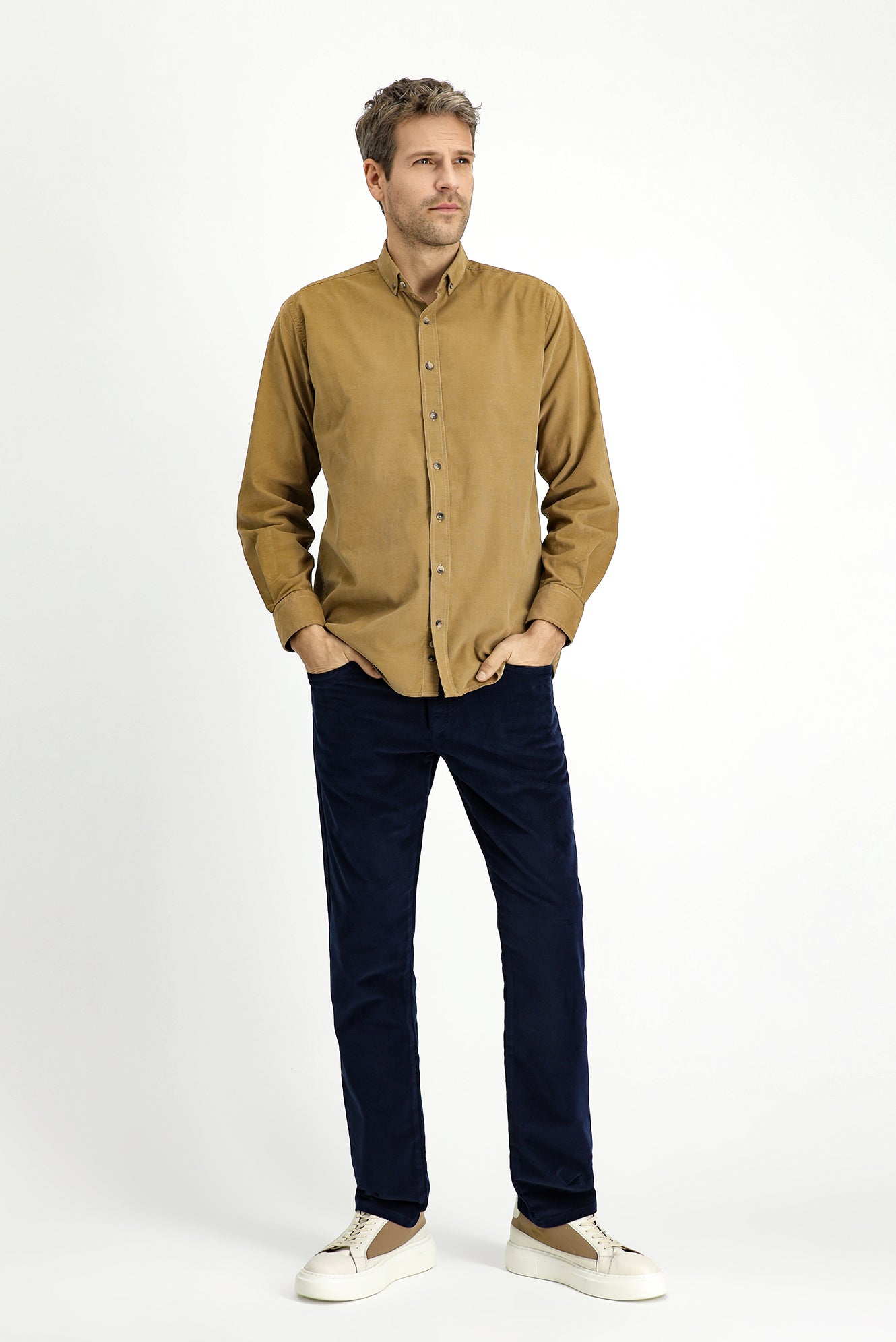 Koyu Bej Uzun Kol Regular Fit Spor Düğmeli Yaka Pamuk Kadife Gömlek