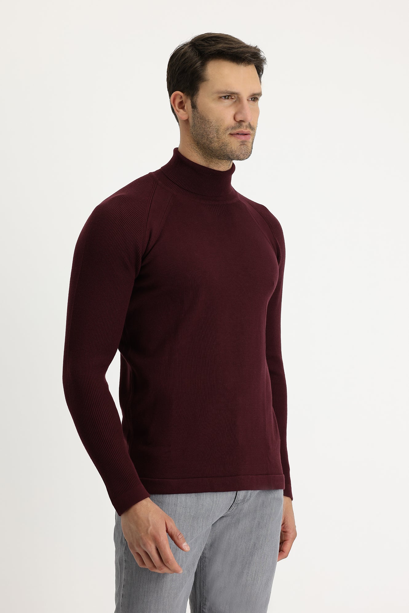 Koyu Bordo Balıkçı Yaka Slim Fit Dar Kesim Desenli Pamuklu Triko Kazak