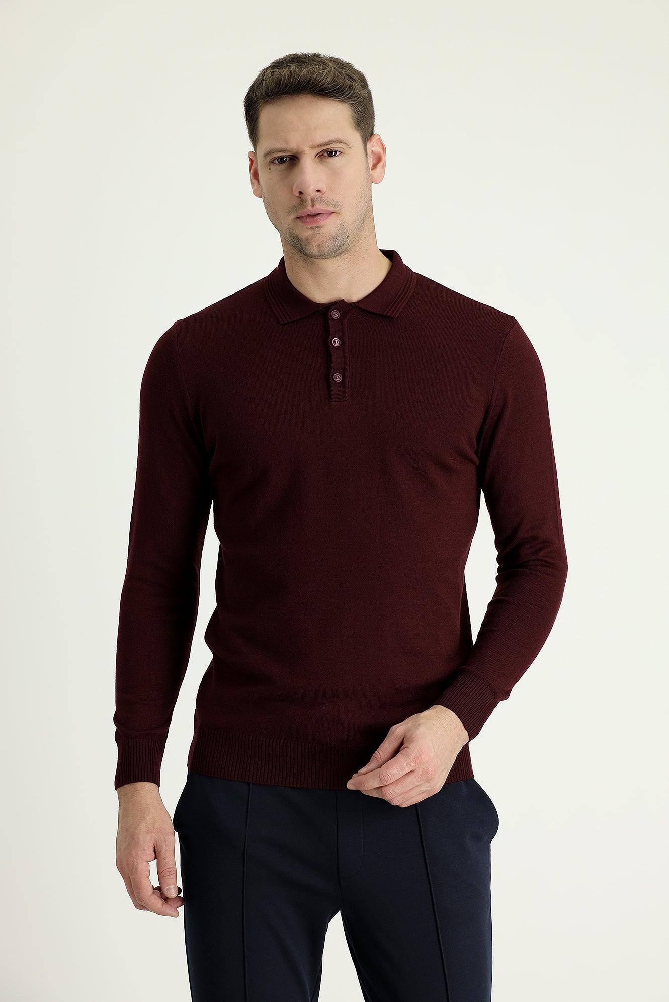 Koyu Bordo Polo Yaka Regular Fit Pamuklu Triko Kazak