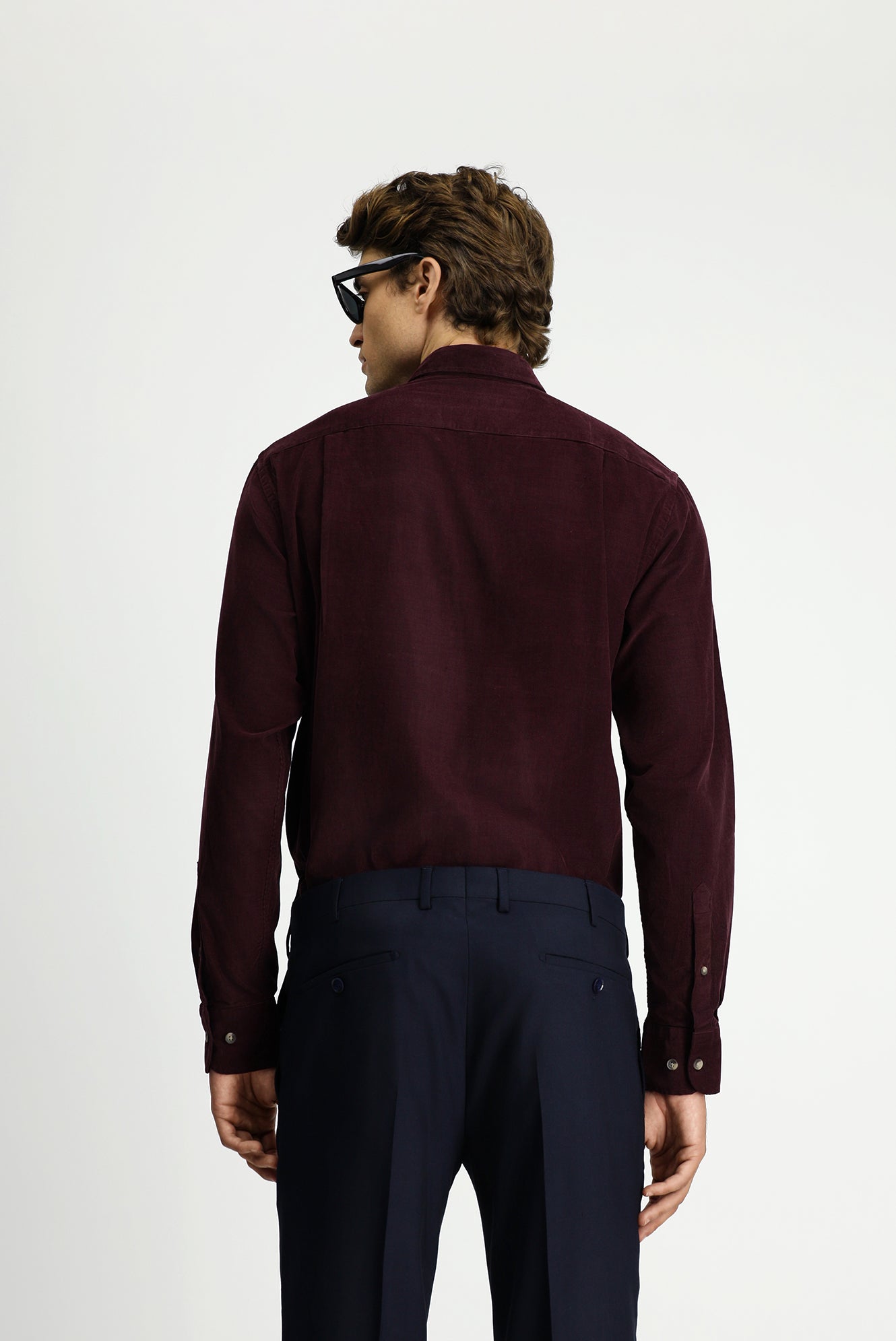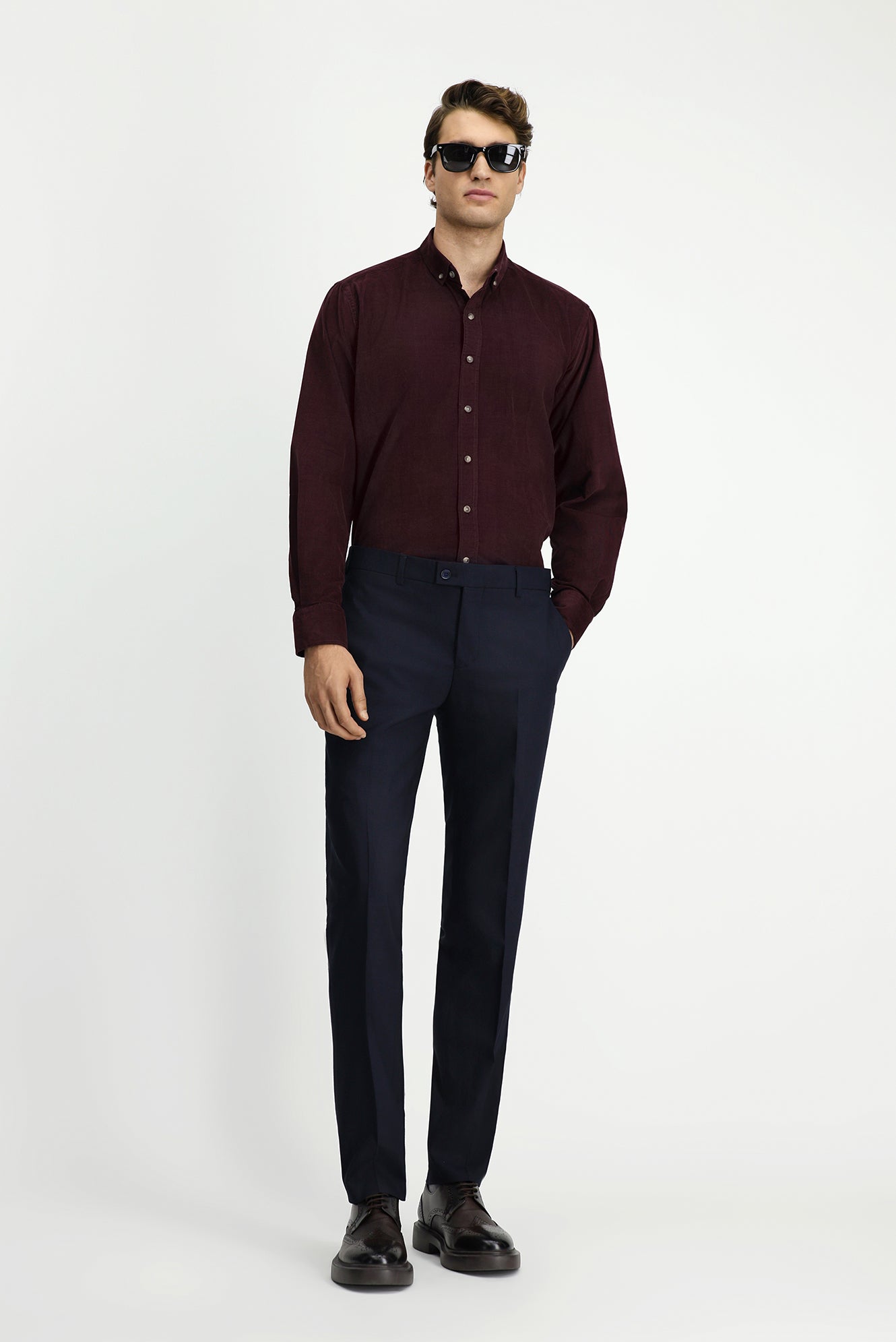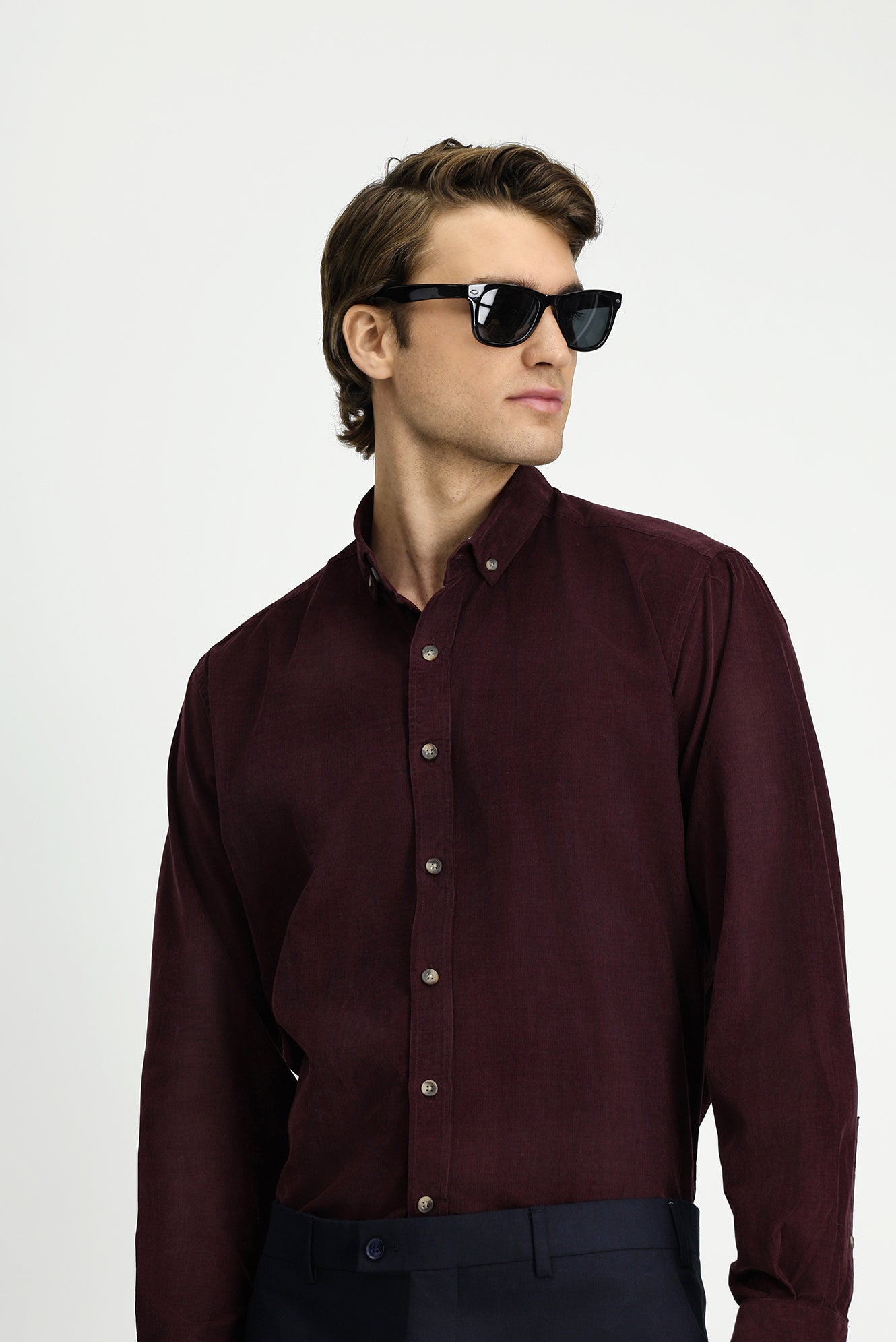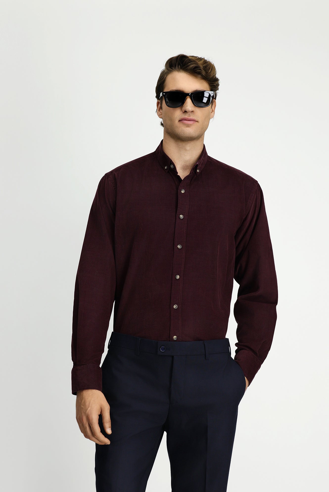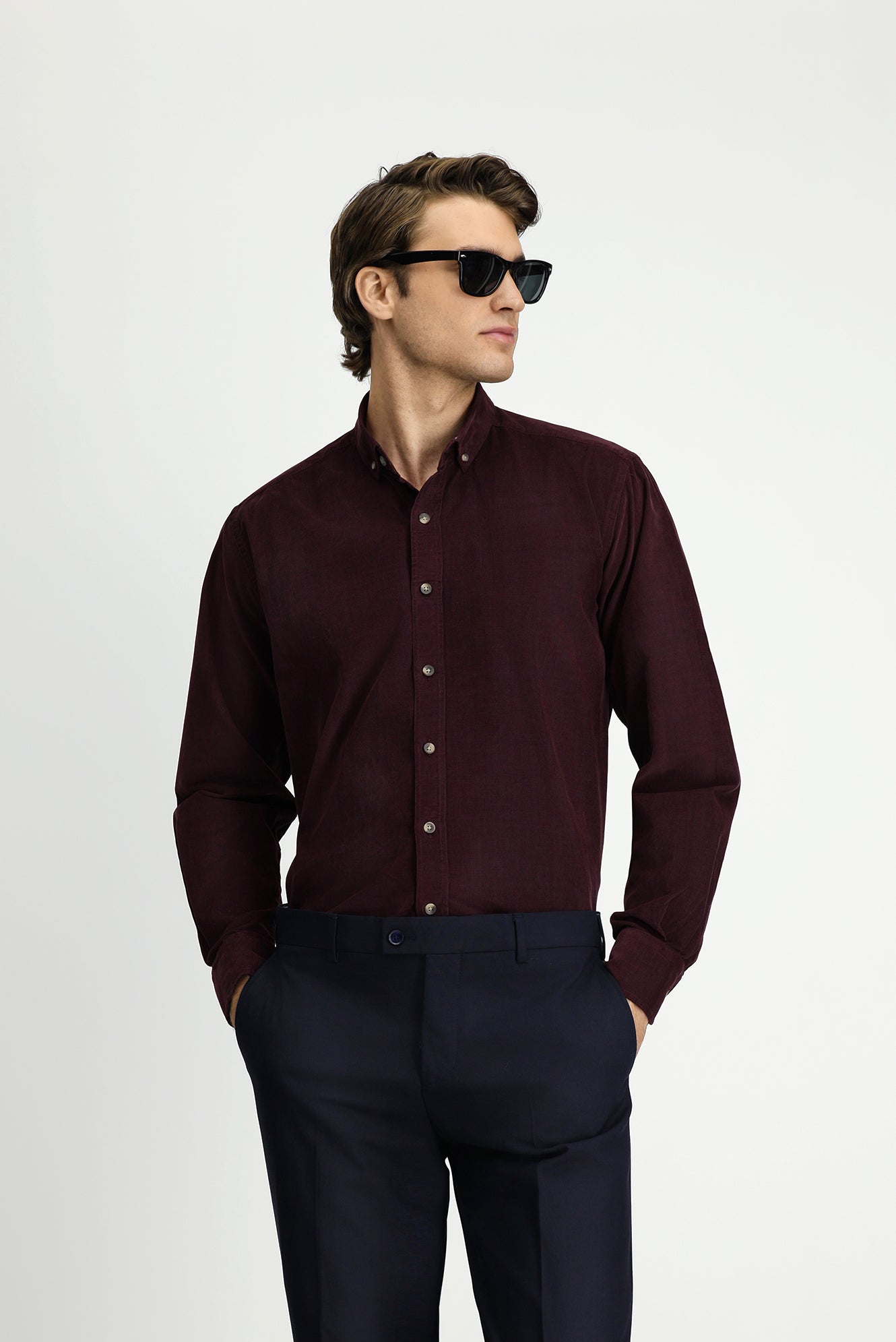 Koyu Bordo Uzun Kol Regular Fit Spor Düğmeli Yaka Pamuk Kadife Gömlek