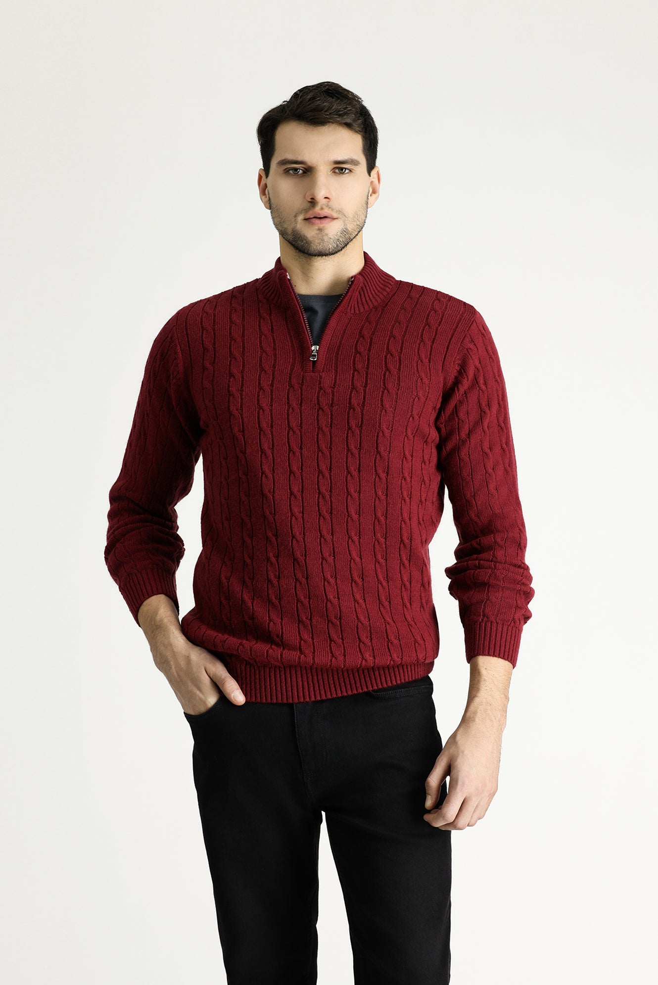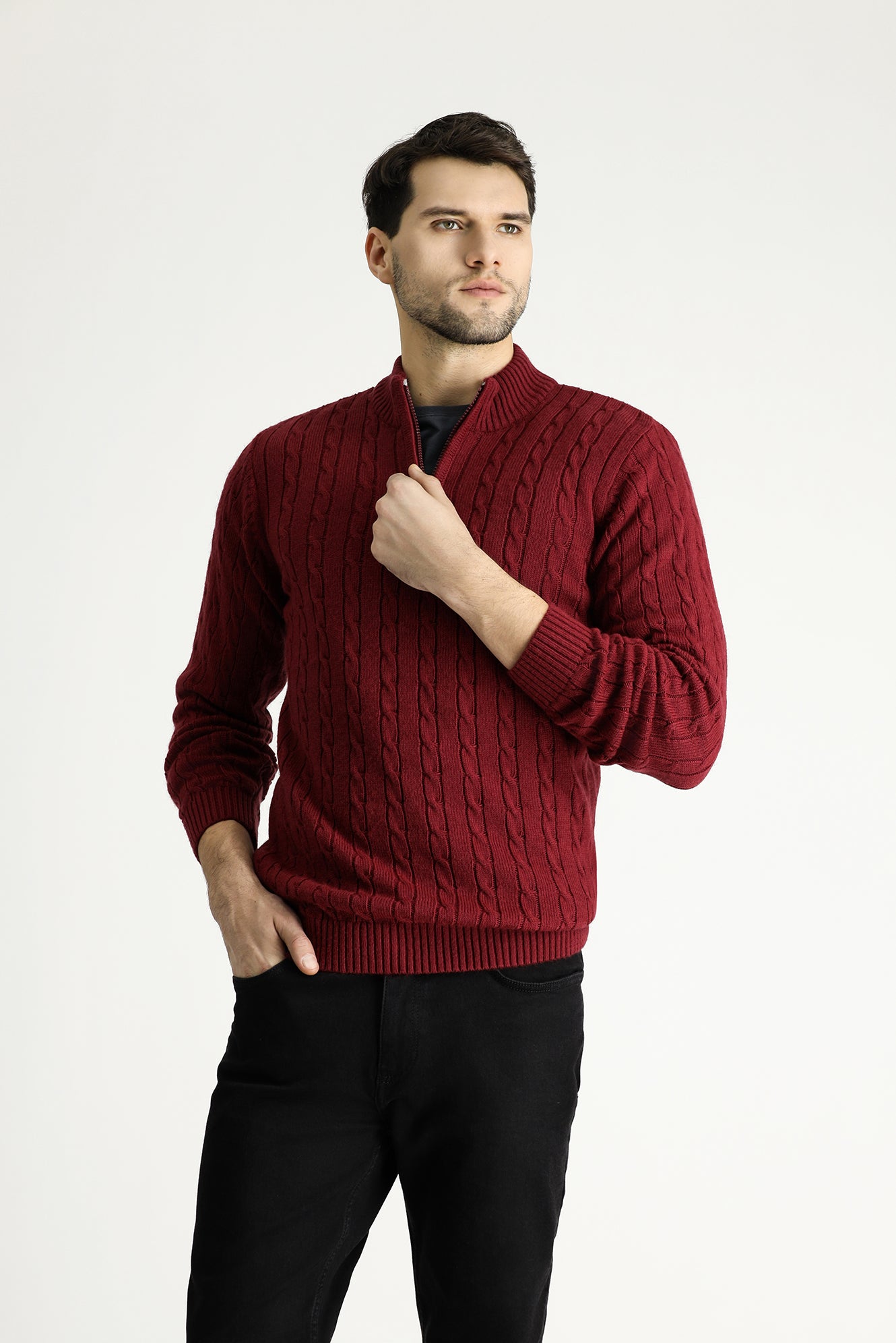 Koyu Bordo Yarım Balıkçı Yaka Regular Fit Fermuarlı Desenli Triko Kazak