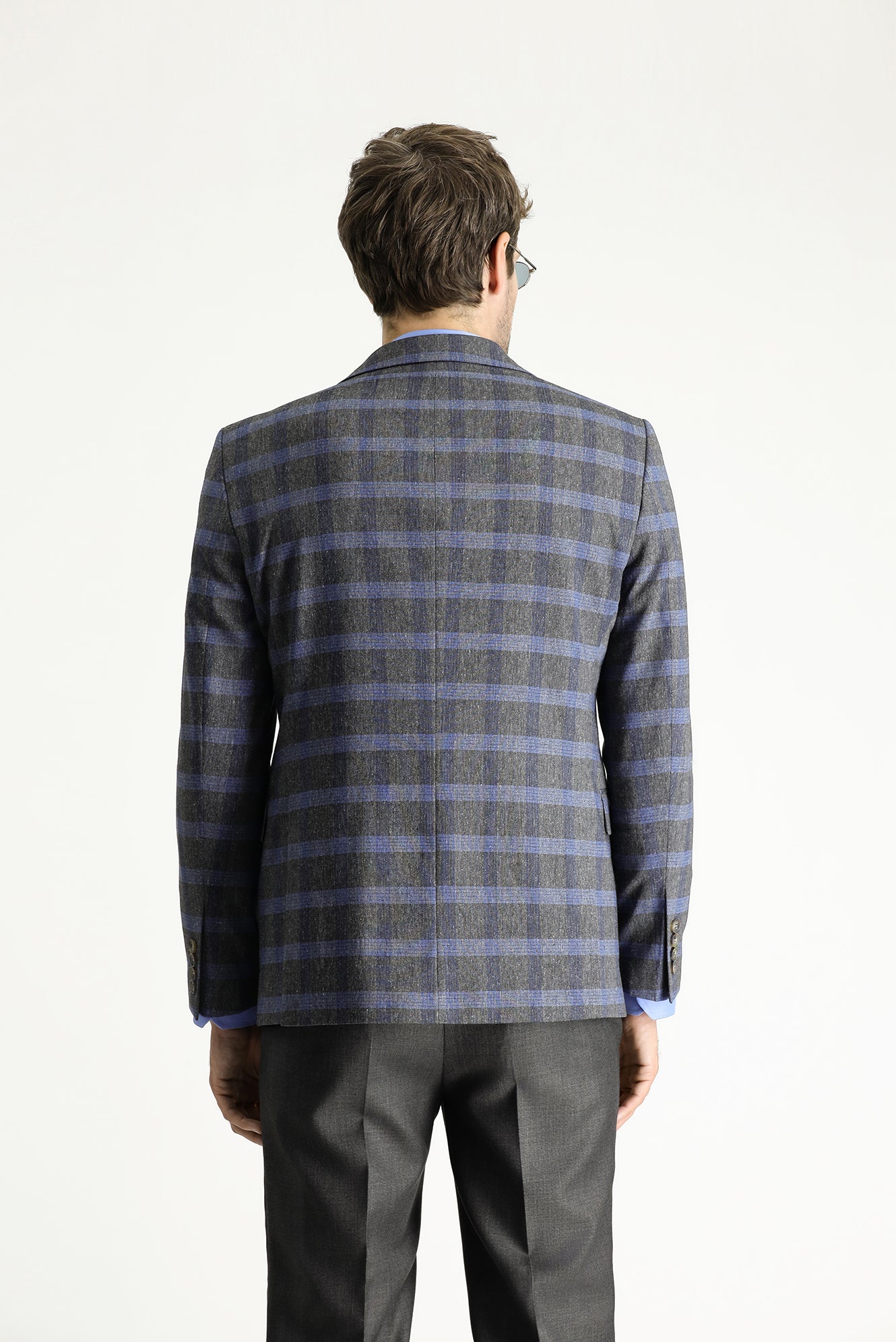 Koyu Füme Slim Fit Dar Kesim Ekose Keten Karışımlı Ceket