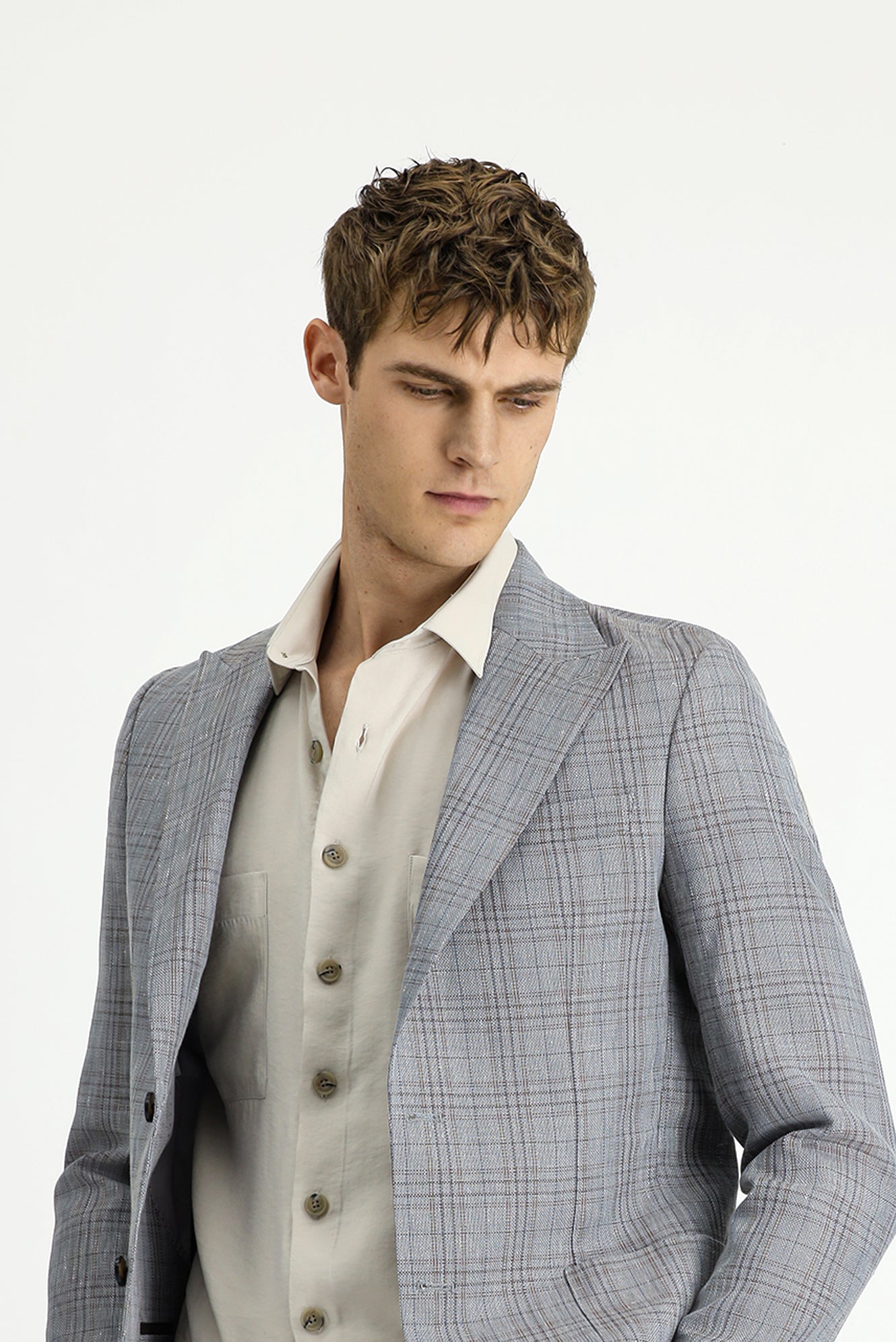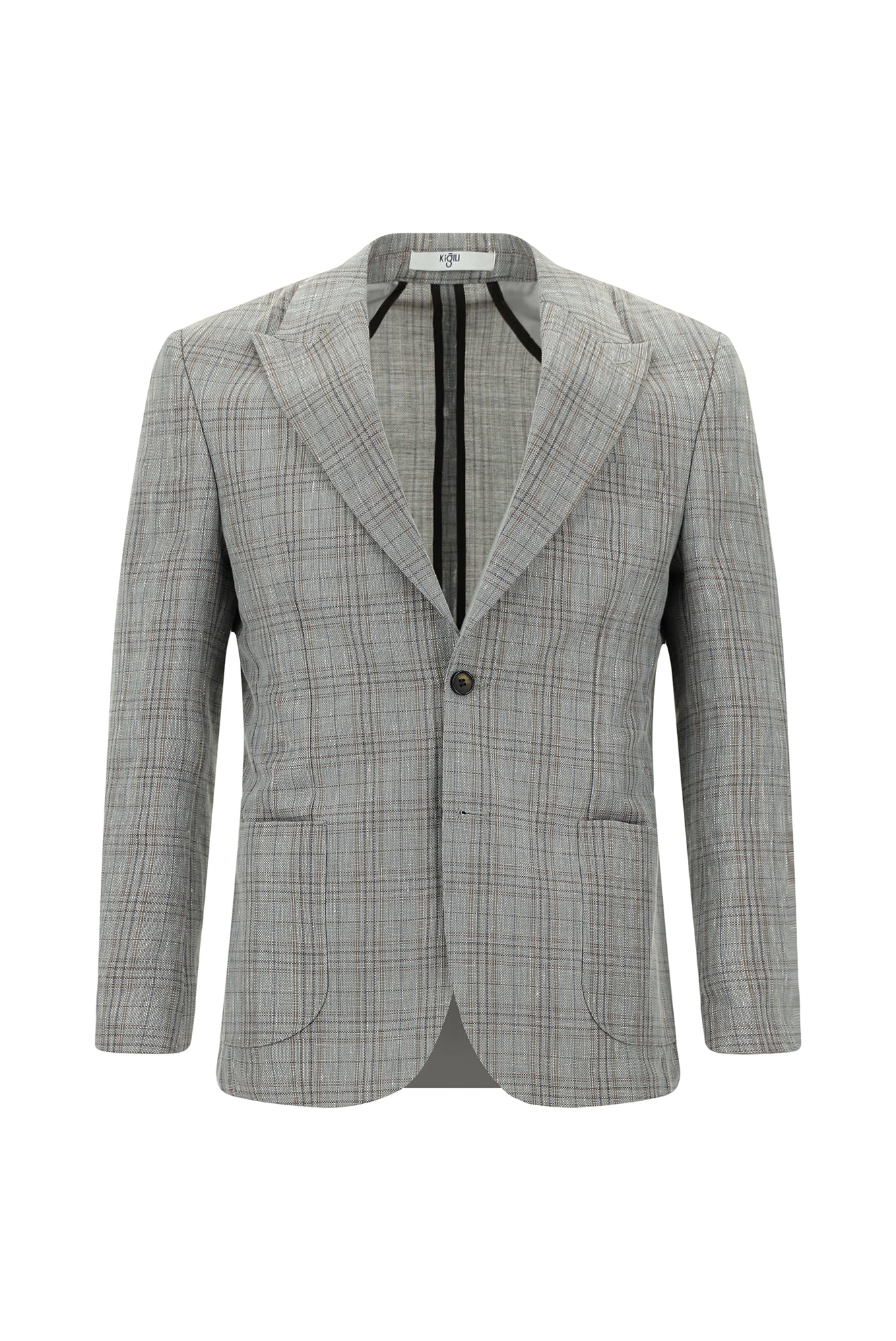 Koyu Füme Slim Fit Dar Kesim Yünlü Keten Karışımlı Ekose Spor Ceket