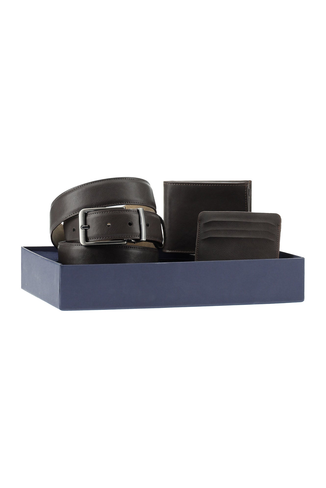 Koyu Kahve Düz 3'lü Kemer & Cüzdan & Kartlık Hediye Kutulu Set