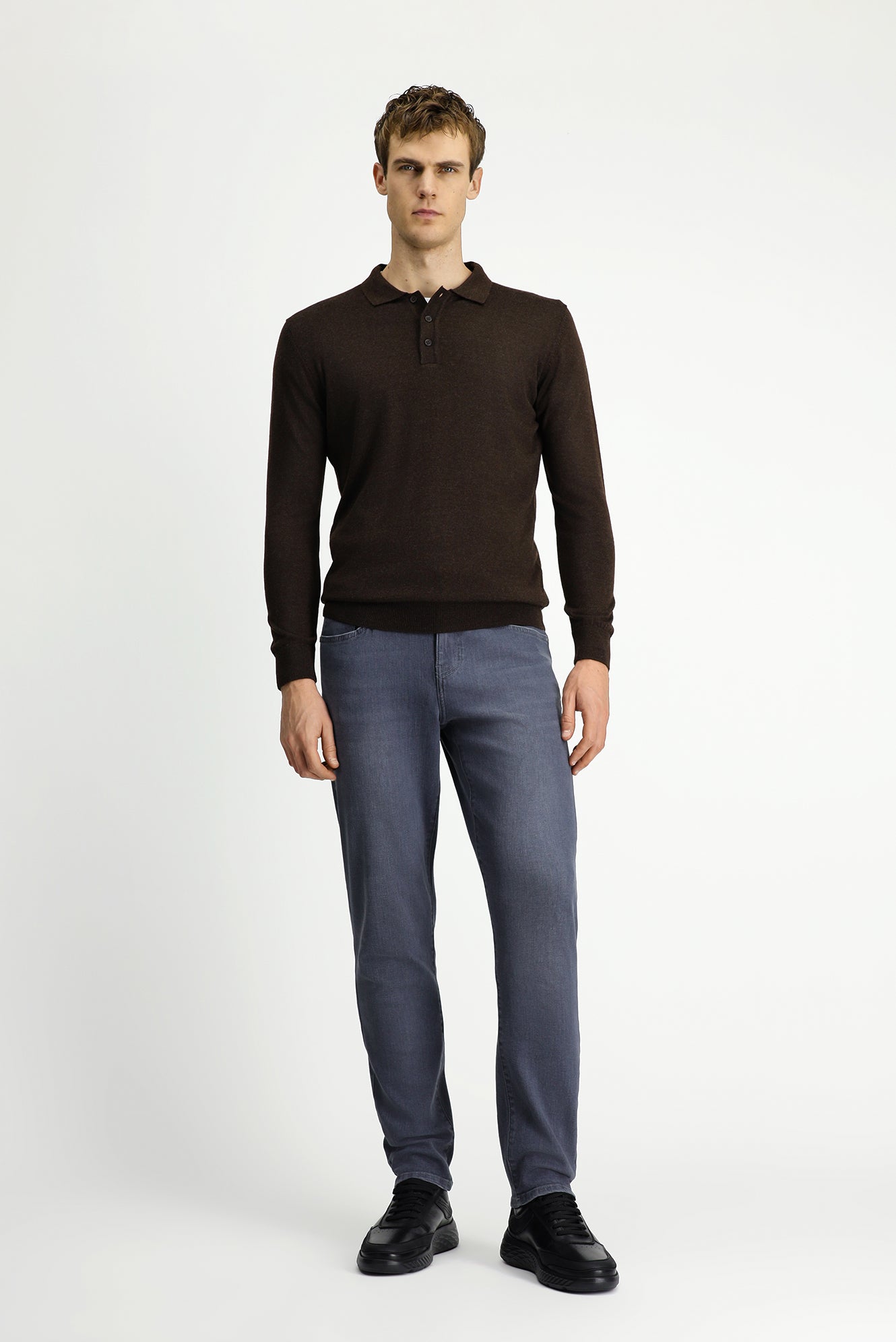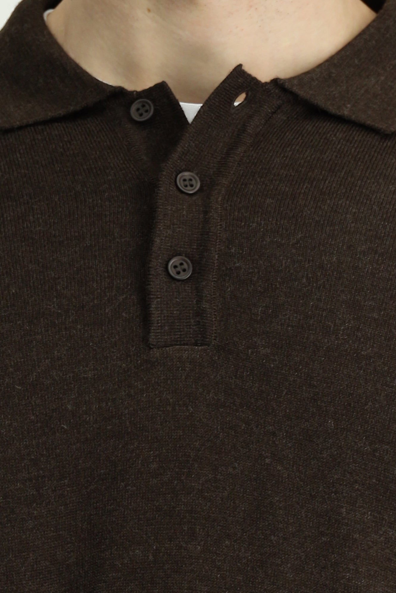 Koyu Kahve Melanj Polo Yaka Düğmeli Regular Fit Sıcak Tutan Yünlü Triko Kazak