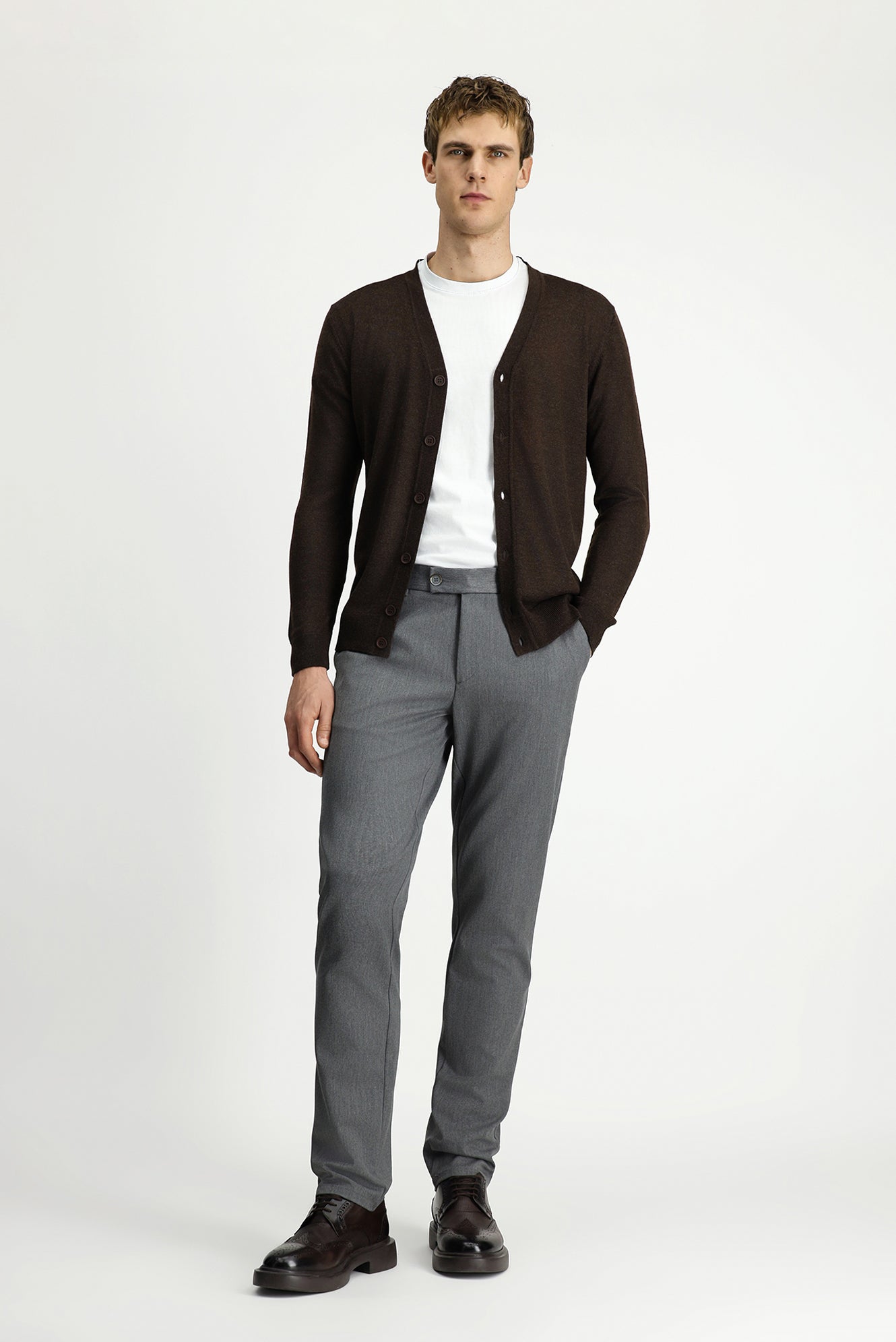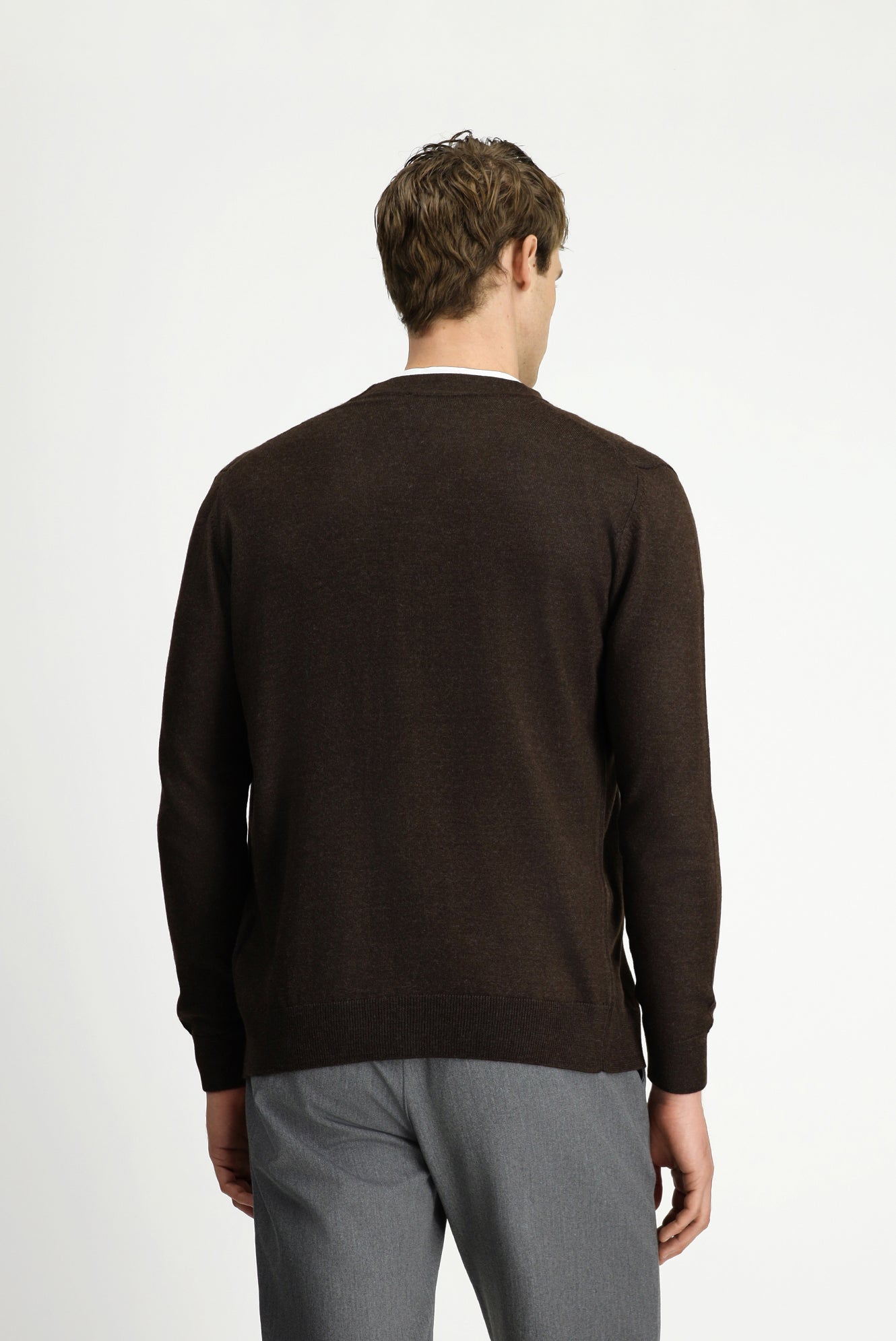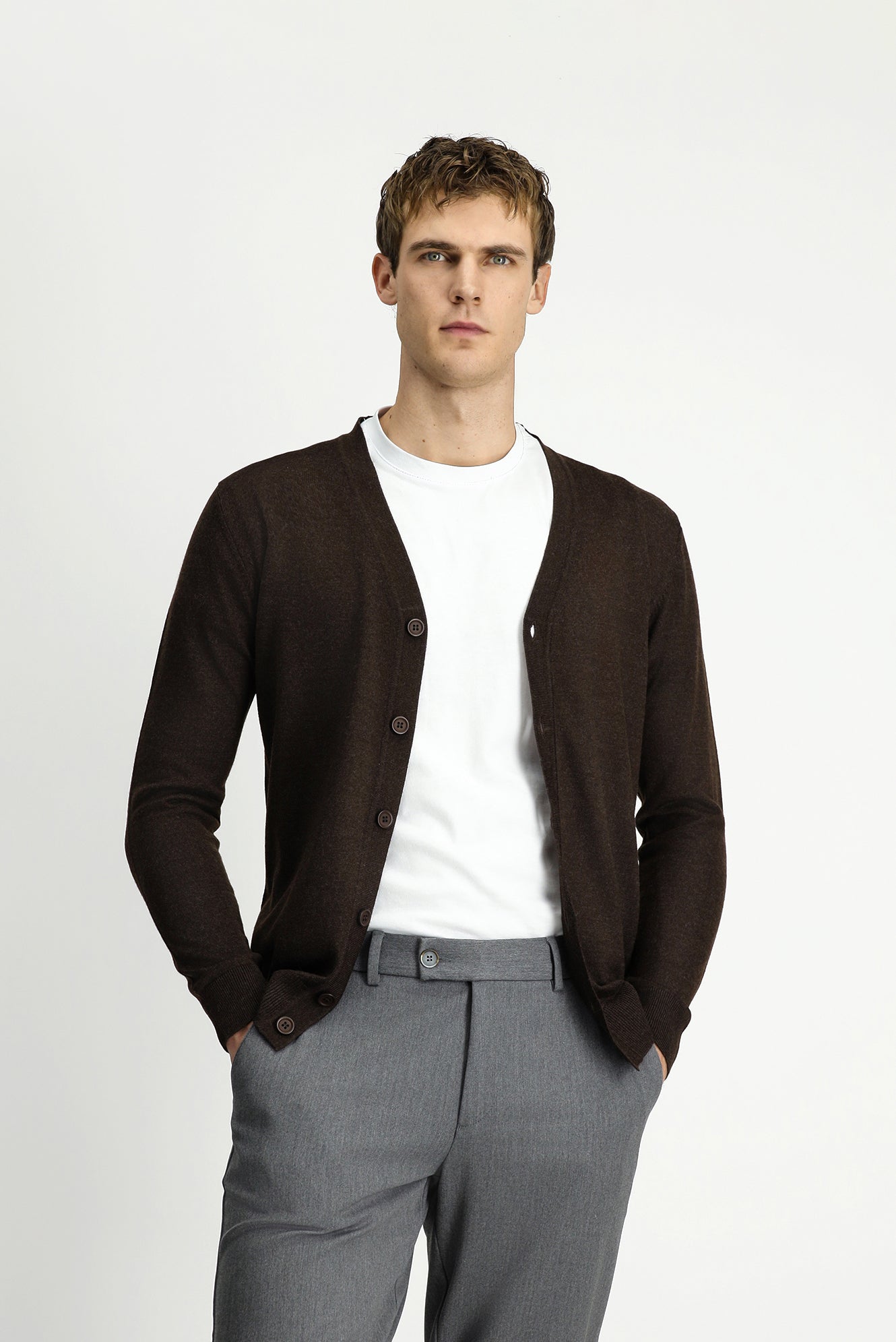 Koyu Kahve Melanj V Yaka Düğmeli Yünlü Örme Triko Hırka