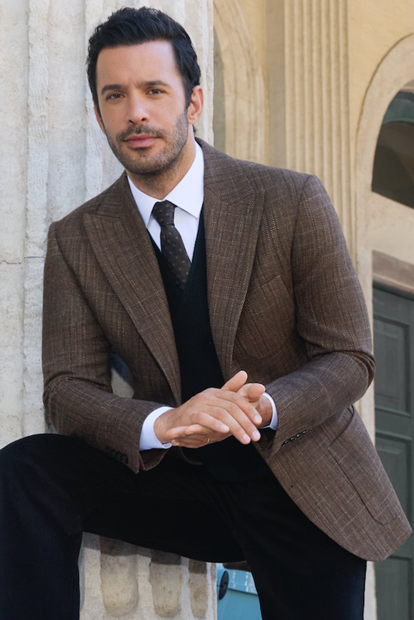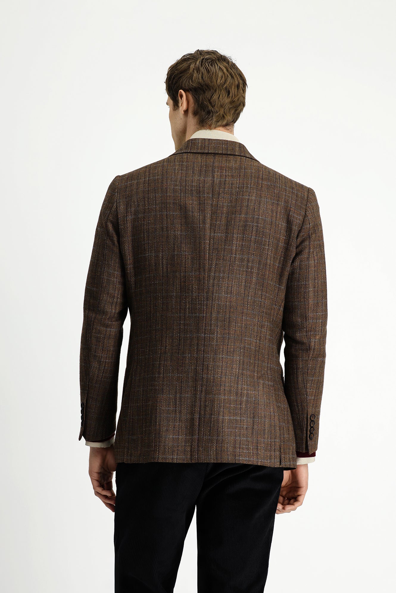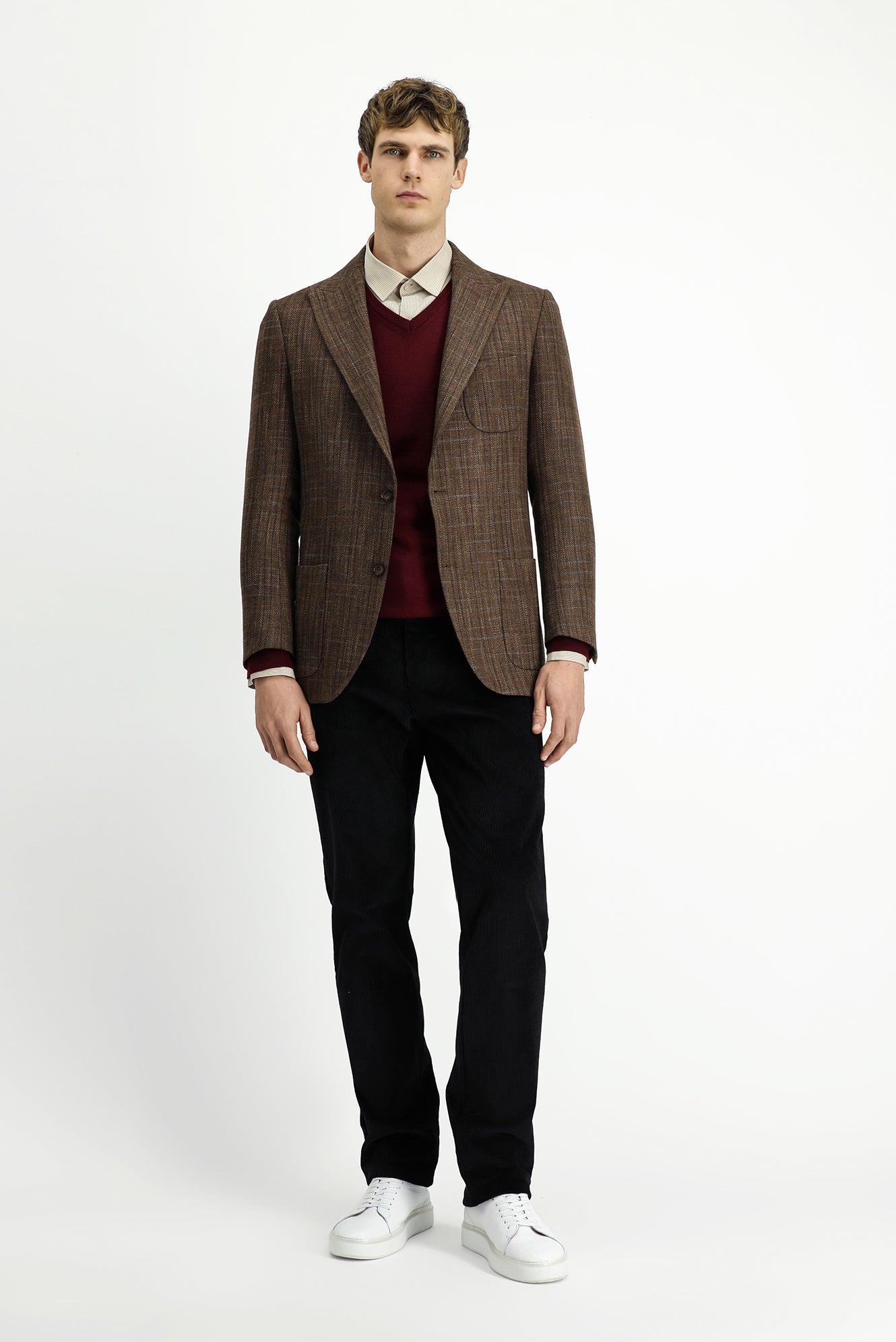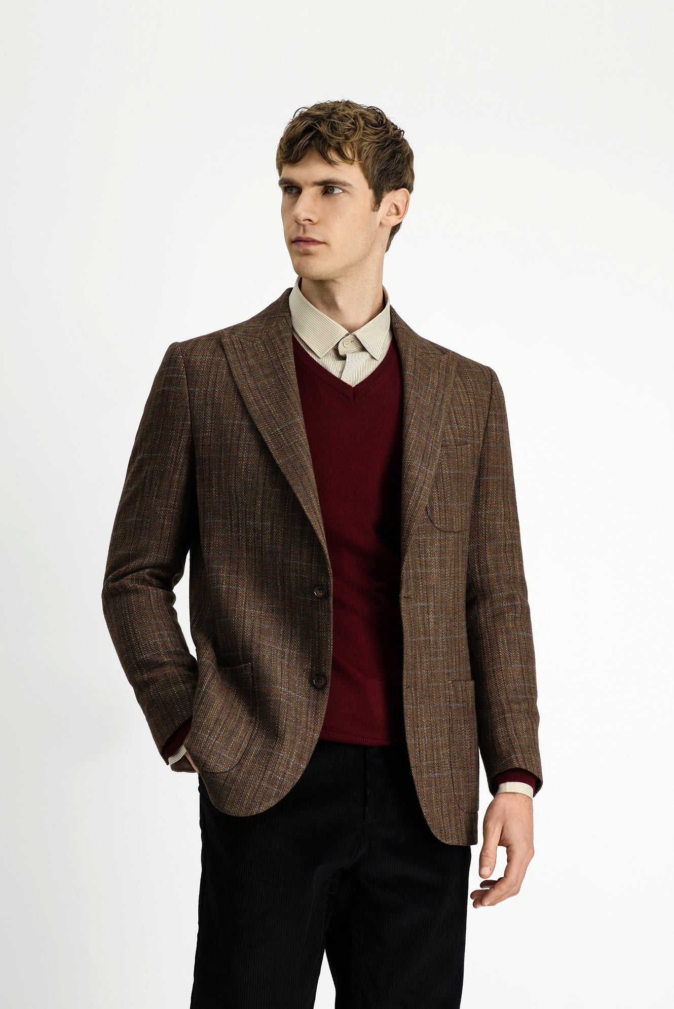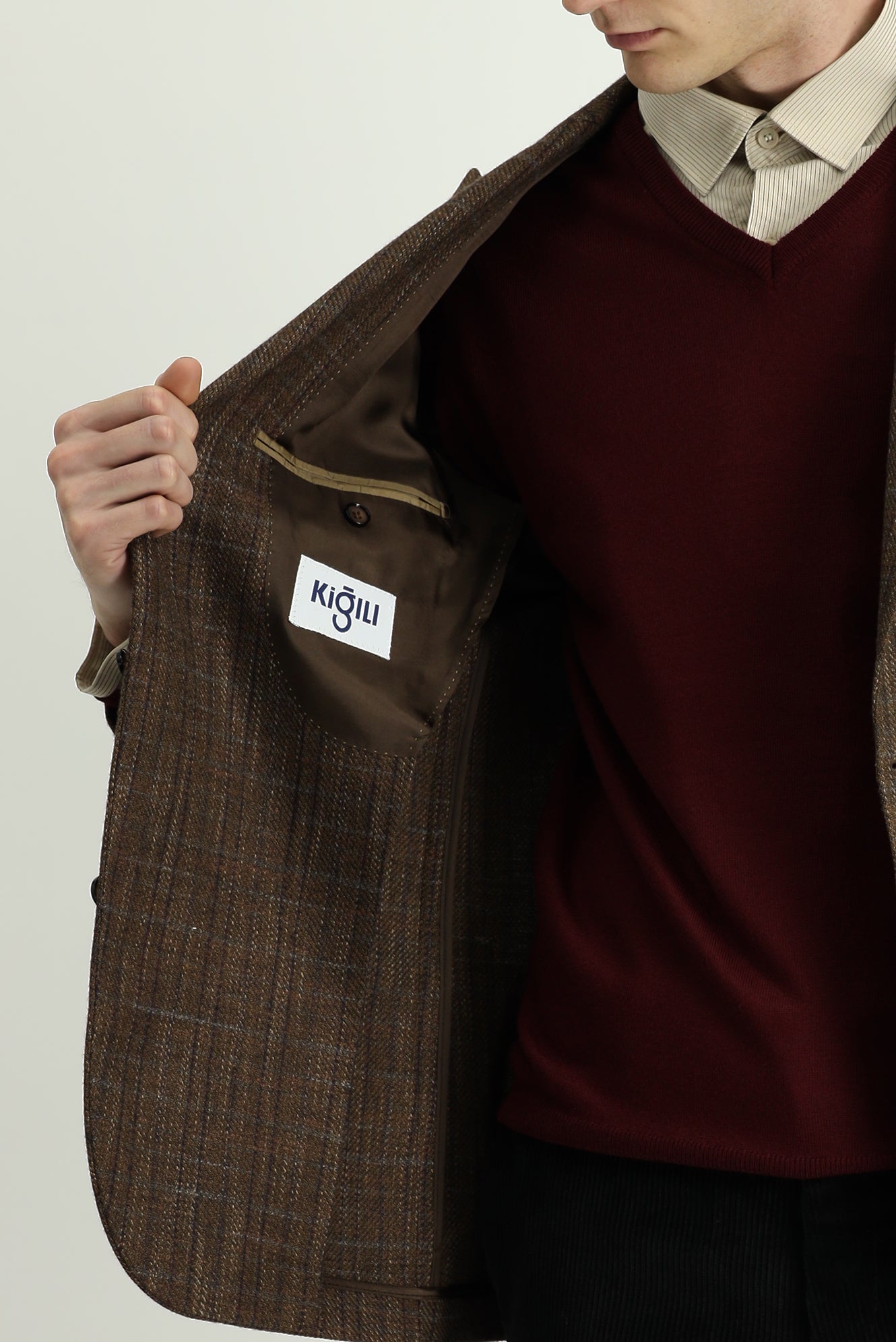 Koyu Kahve 6 Drop Regular Fit Standart Kesim Yünlü Ekose Spor Yarım Astar Torba Cep Sivri Yaka Ceket