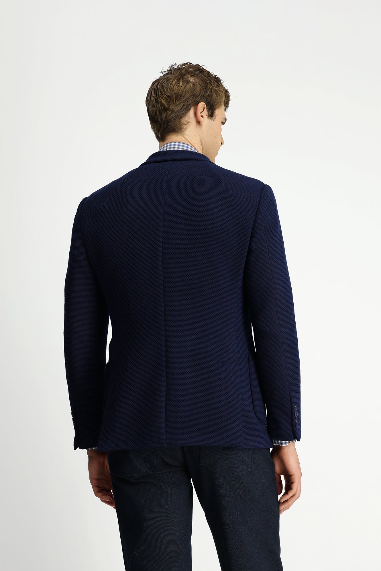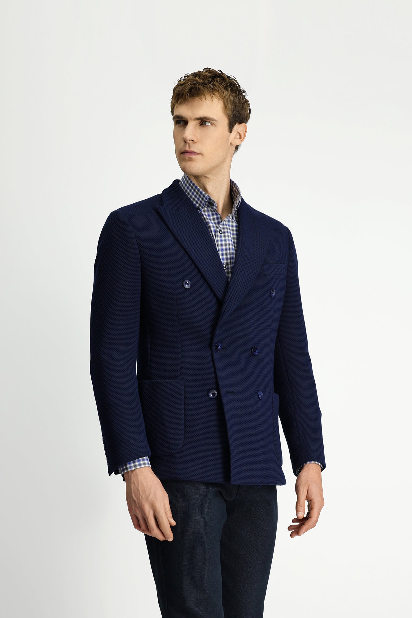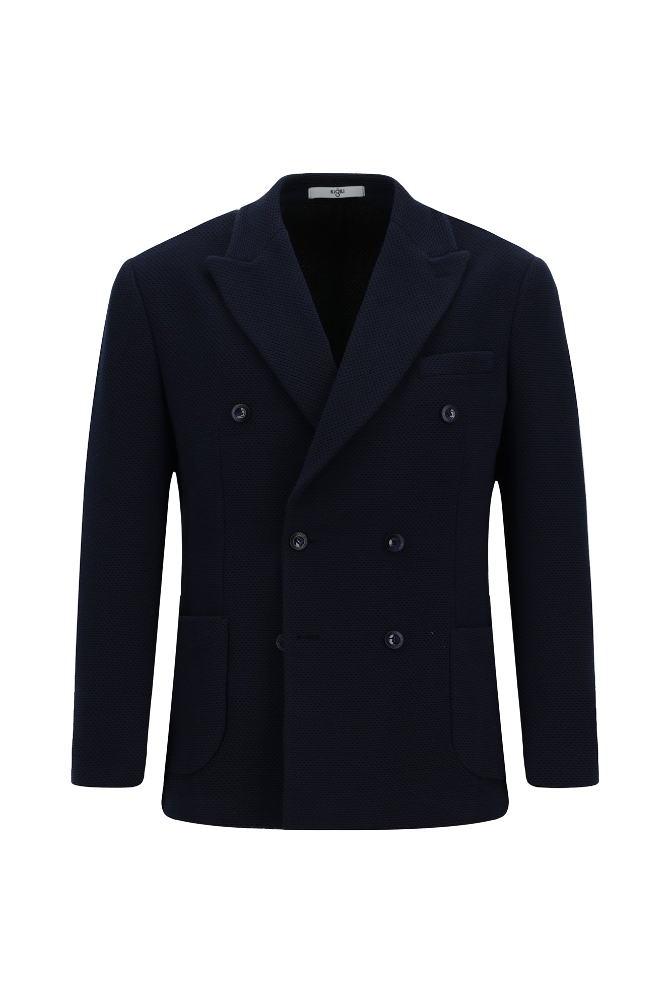 Koyu Lacivert Regular Fit Likralı Desenli Örme Kruvaze Ceket