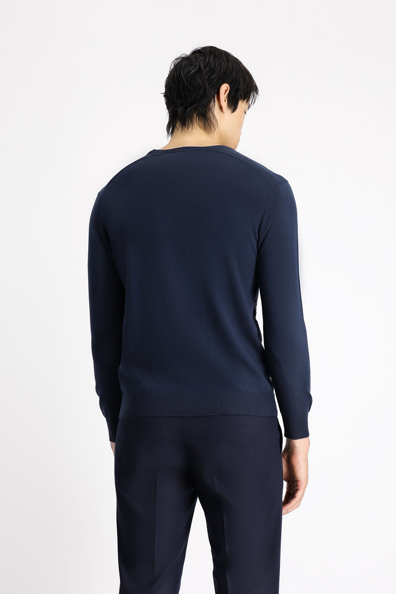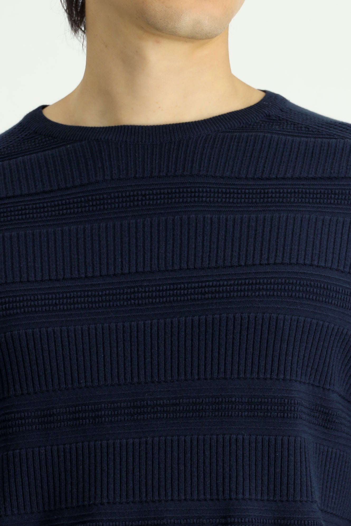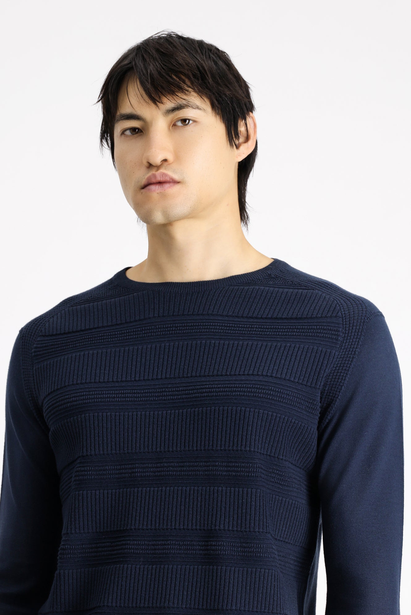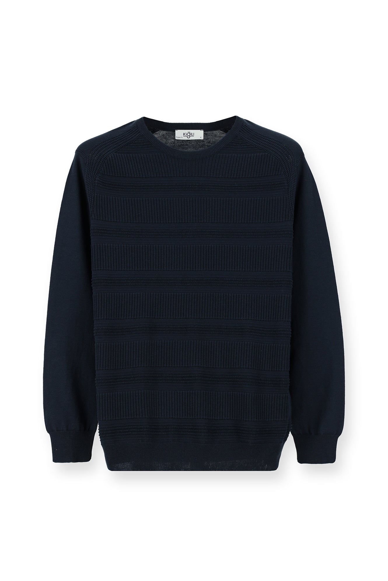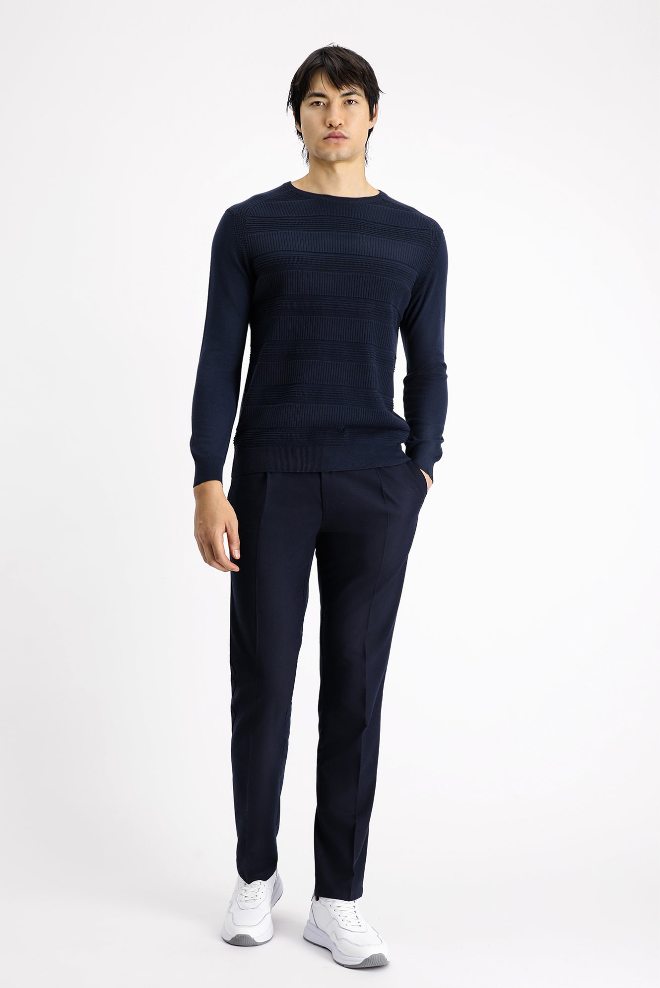 Koyu Lacivert Bisiklet Yaka Regular Fit Çizgili Pamuklu Triko Kazak