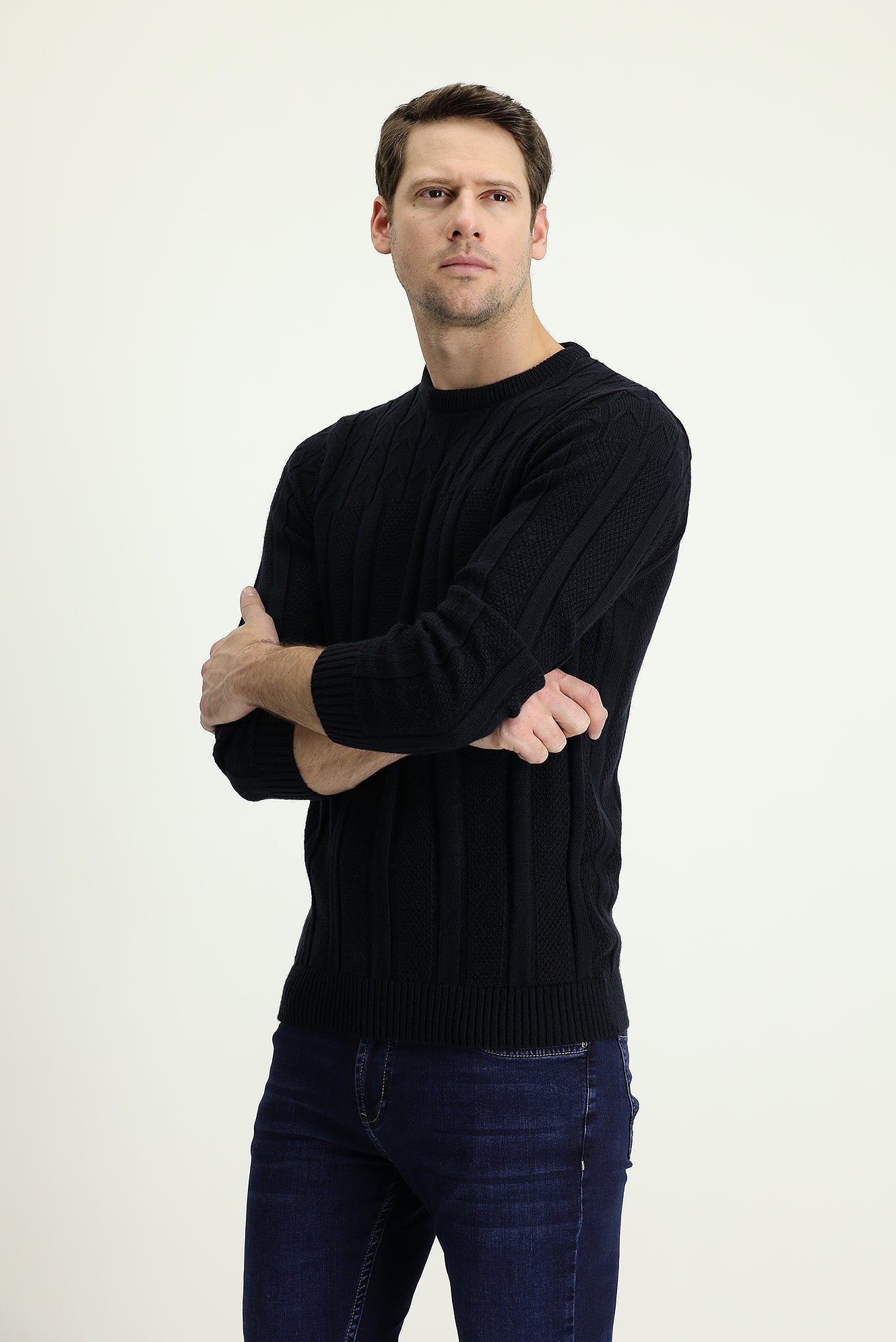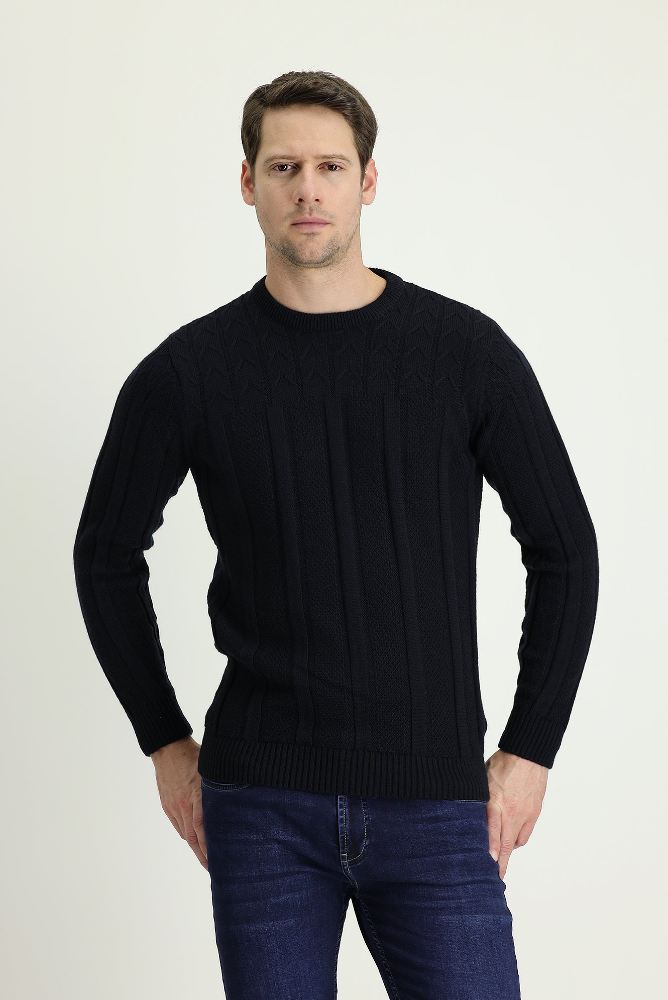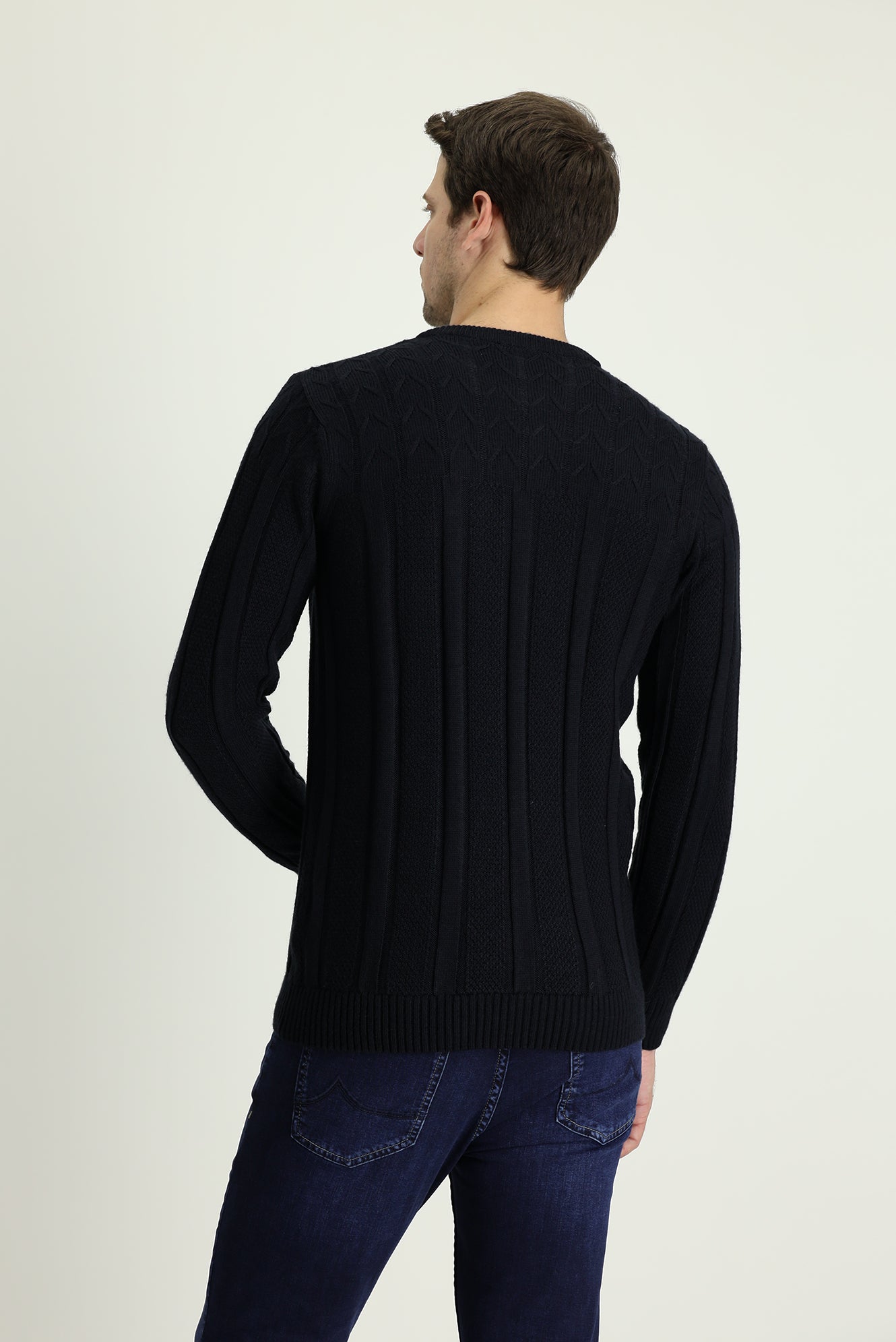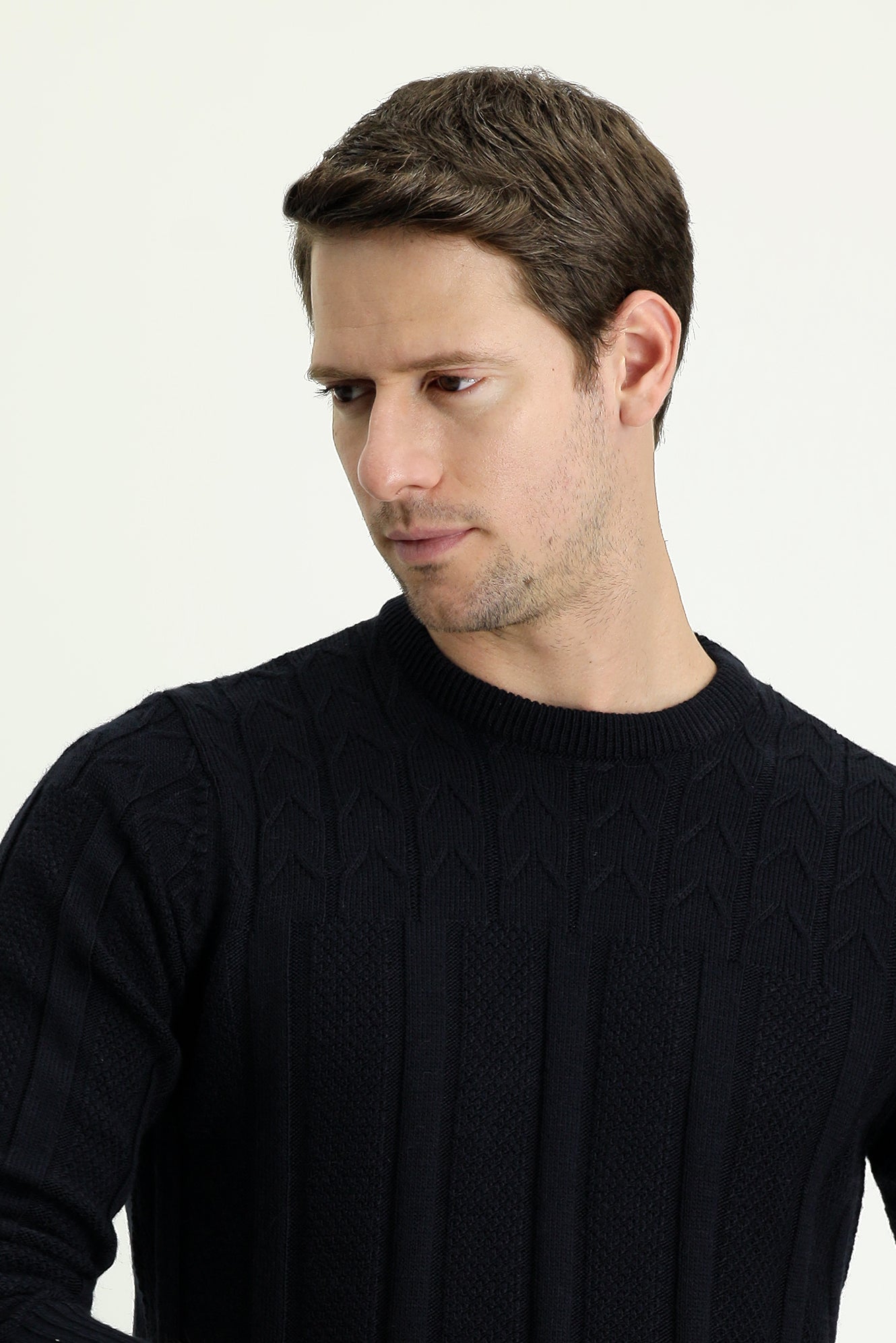 Koyu Lacivert Bisiklet Yaka Regular Fit Desenli Triko Kazak