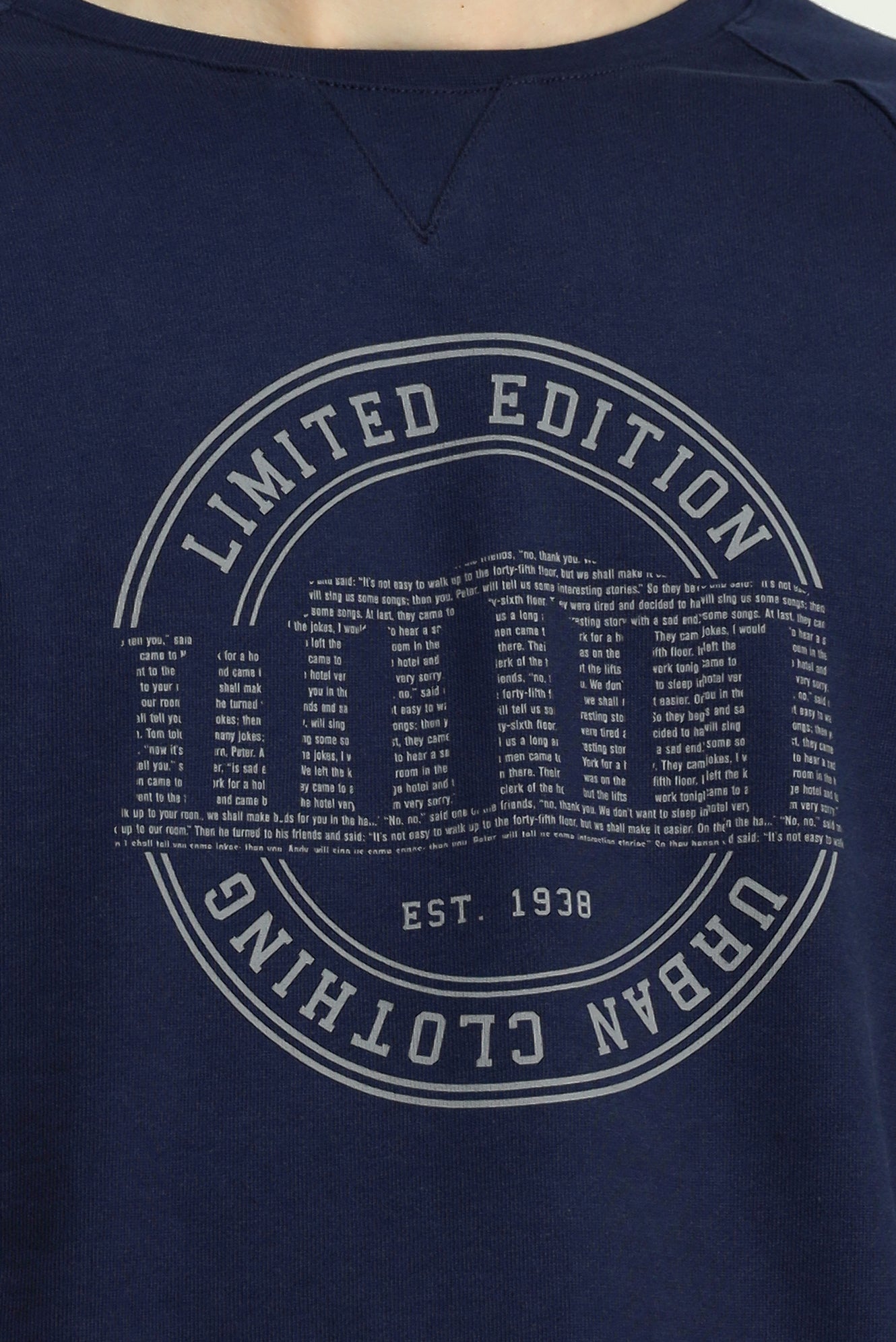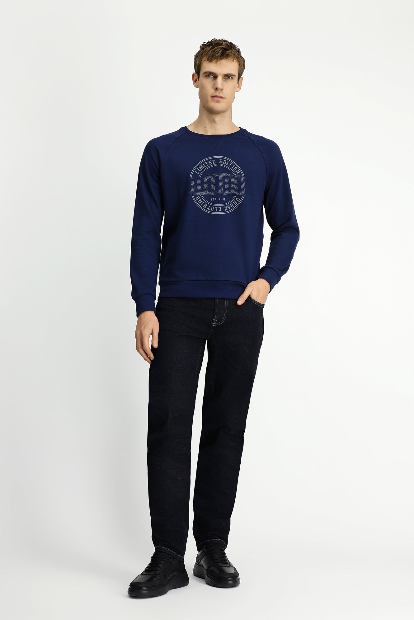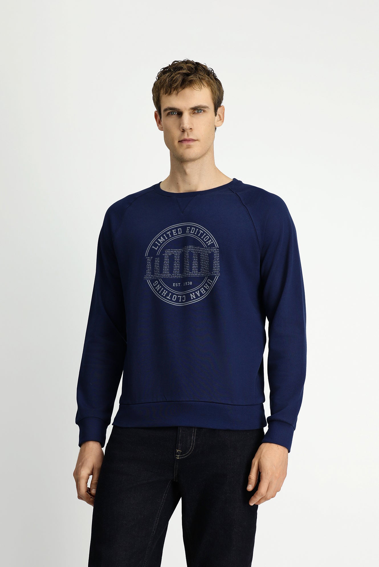 Koyu Lacivert Bisiklet Yaka Regular Fit Baskılı Pamuk Sweatshirt