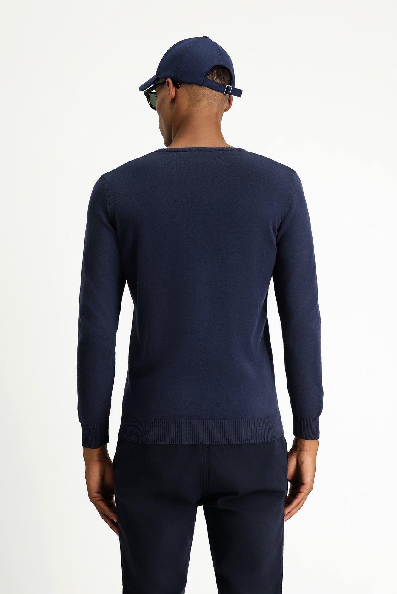 Koyu Lacivert Bisiklet Yaka Regular Fit Pamuklu Kaşmirli Triko Kazak