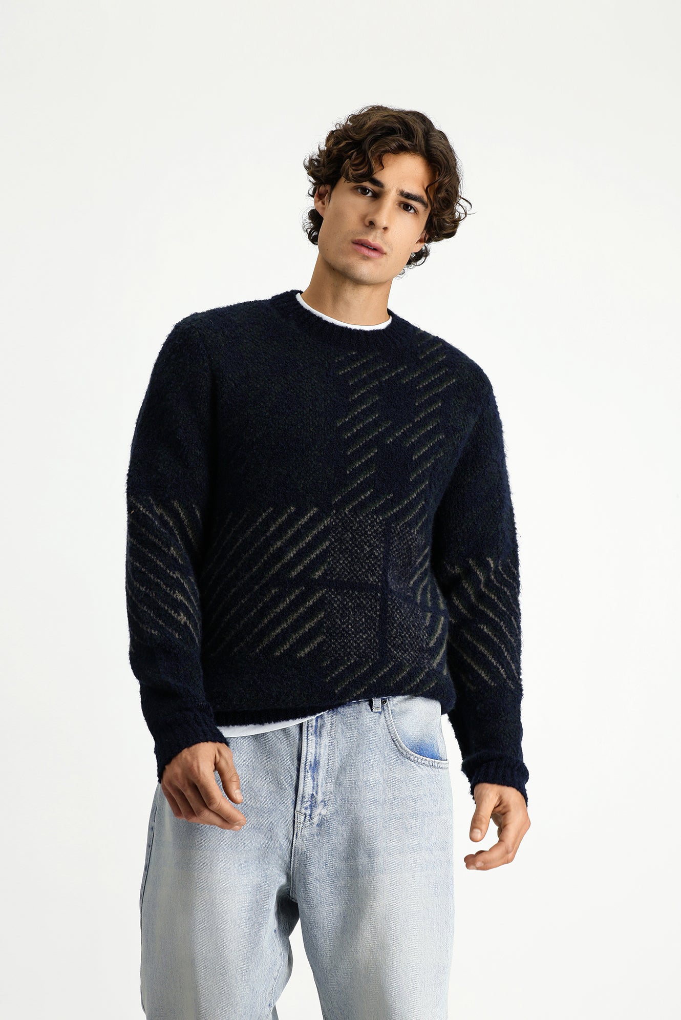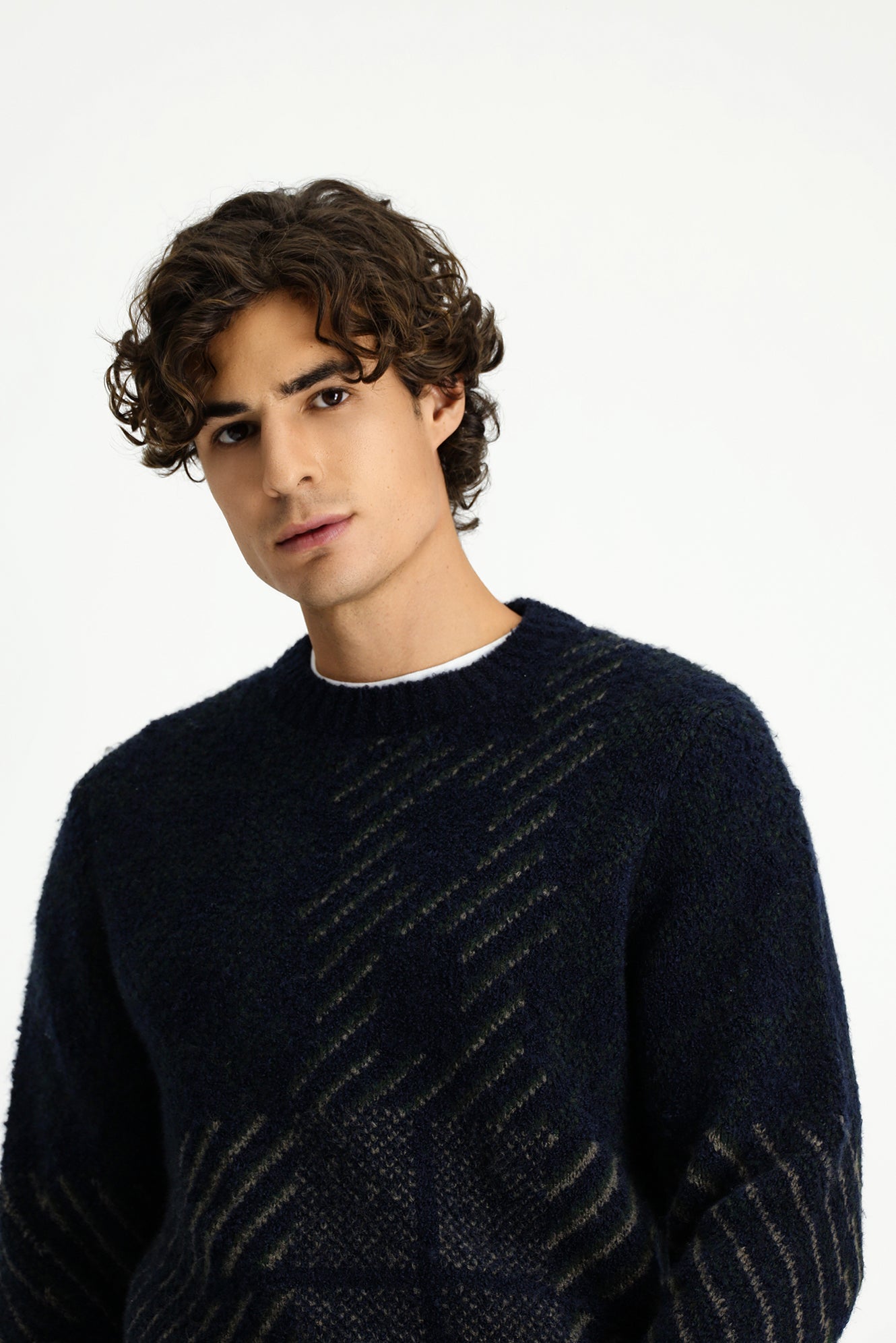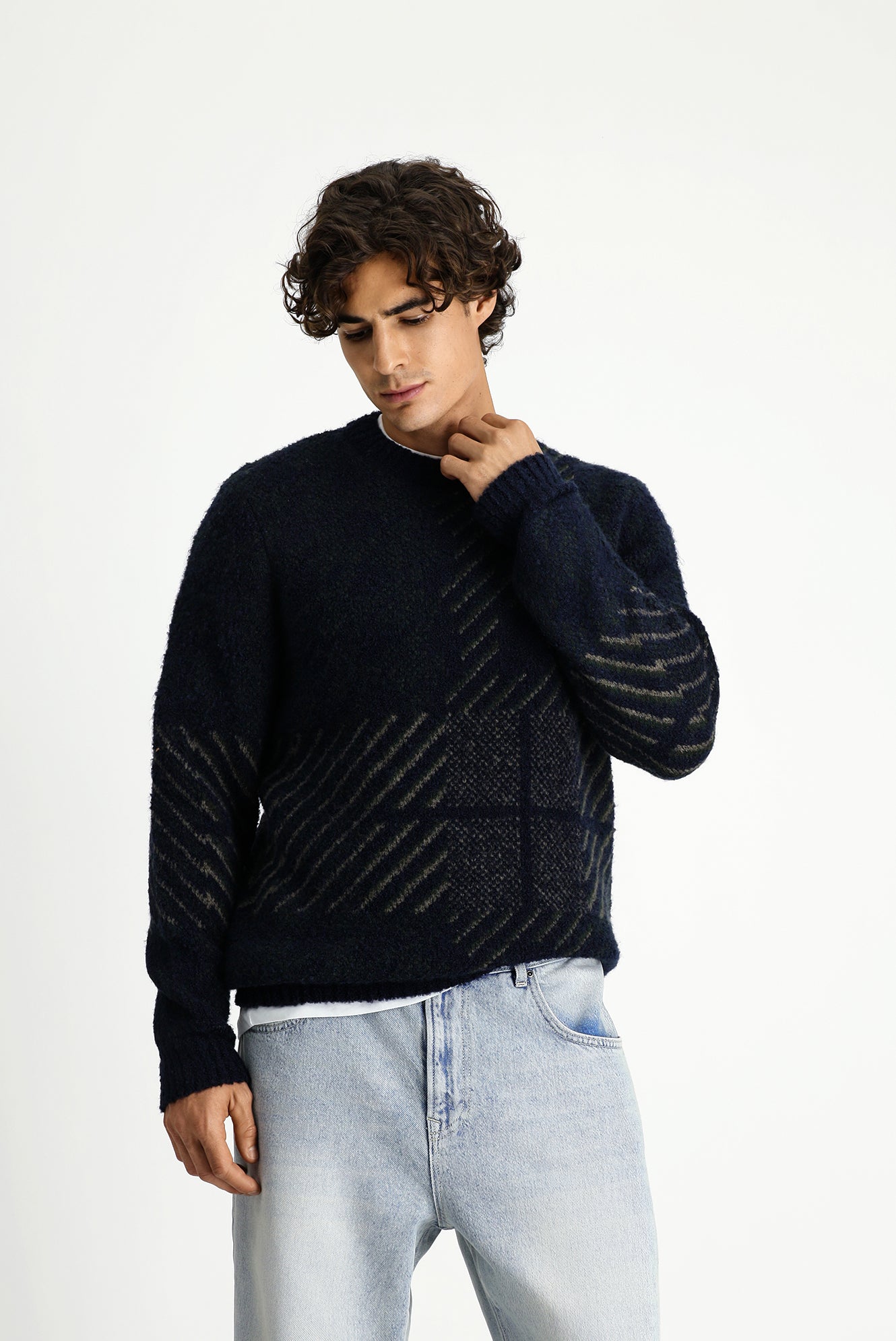 Koyu Lacivert Bisiklet Yaka Regular Fit Desenli Triko Kazak