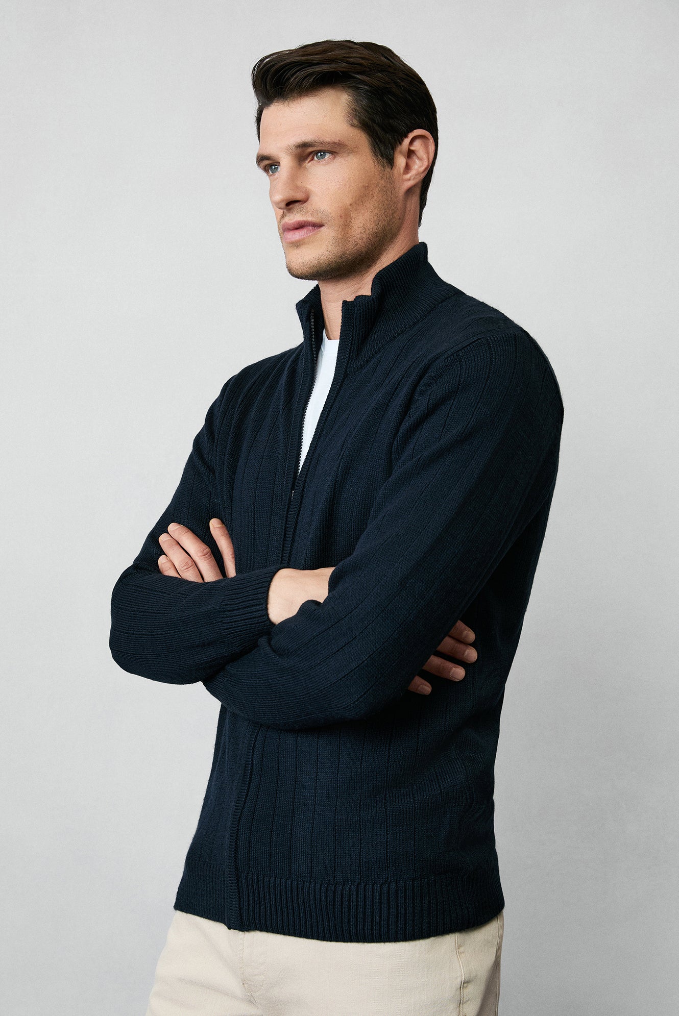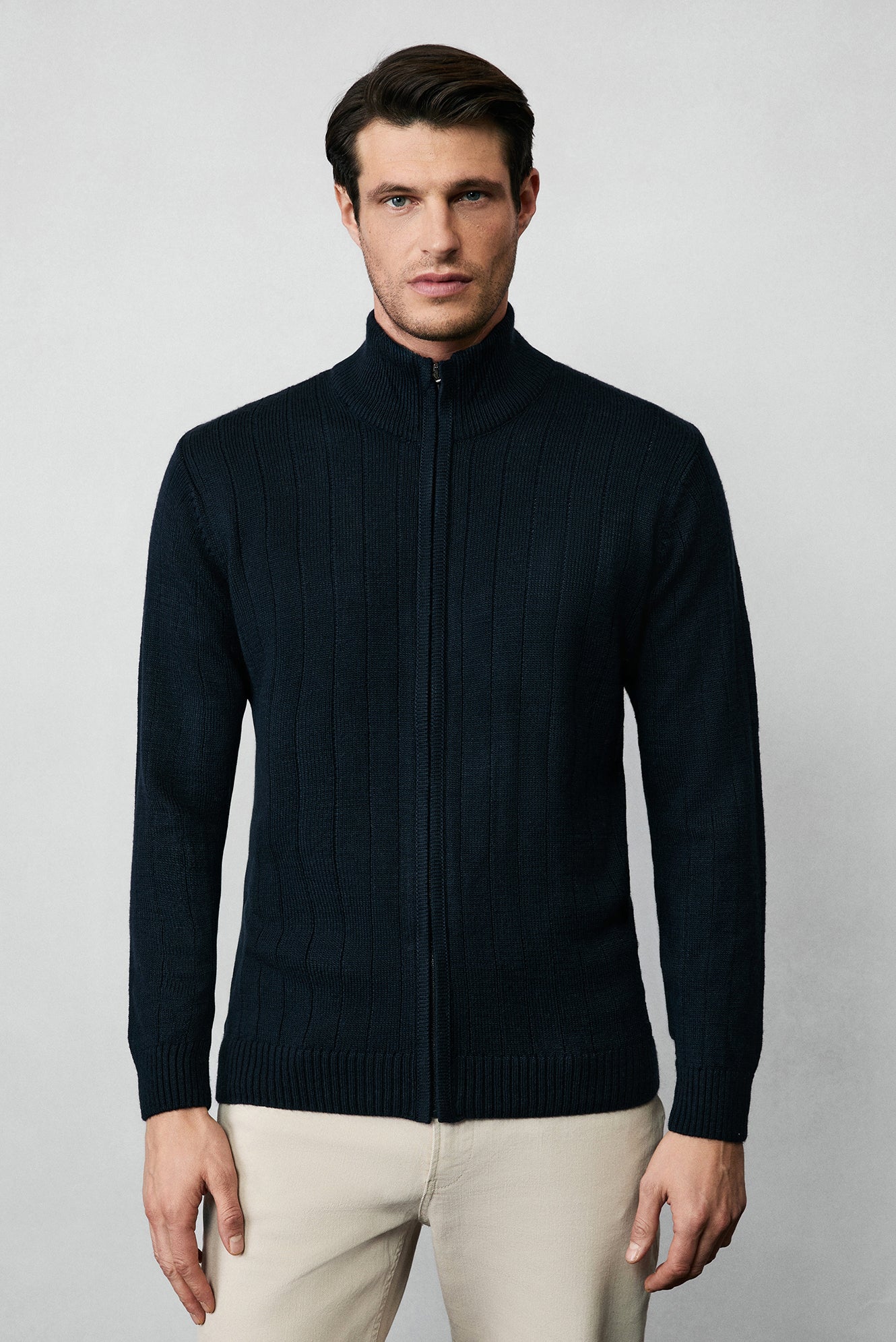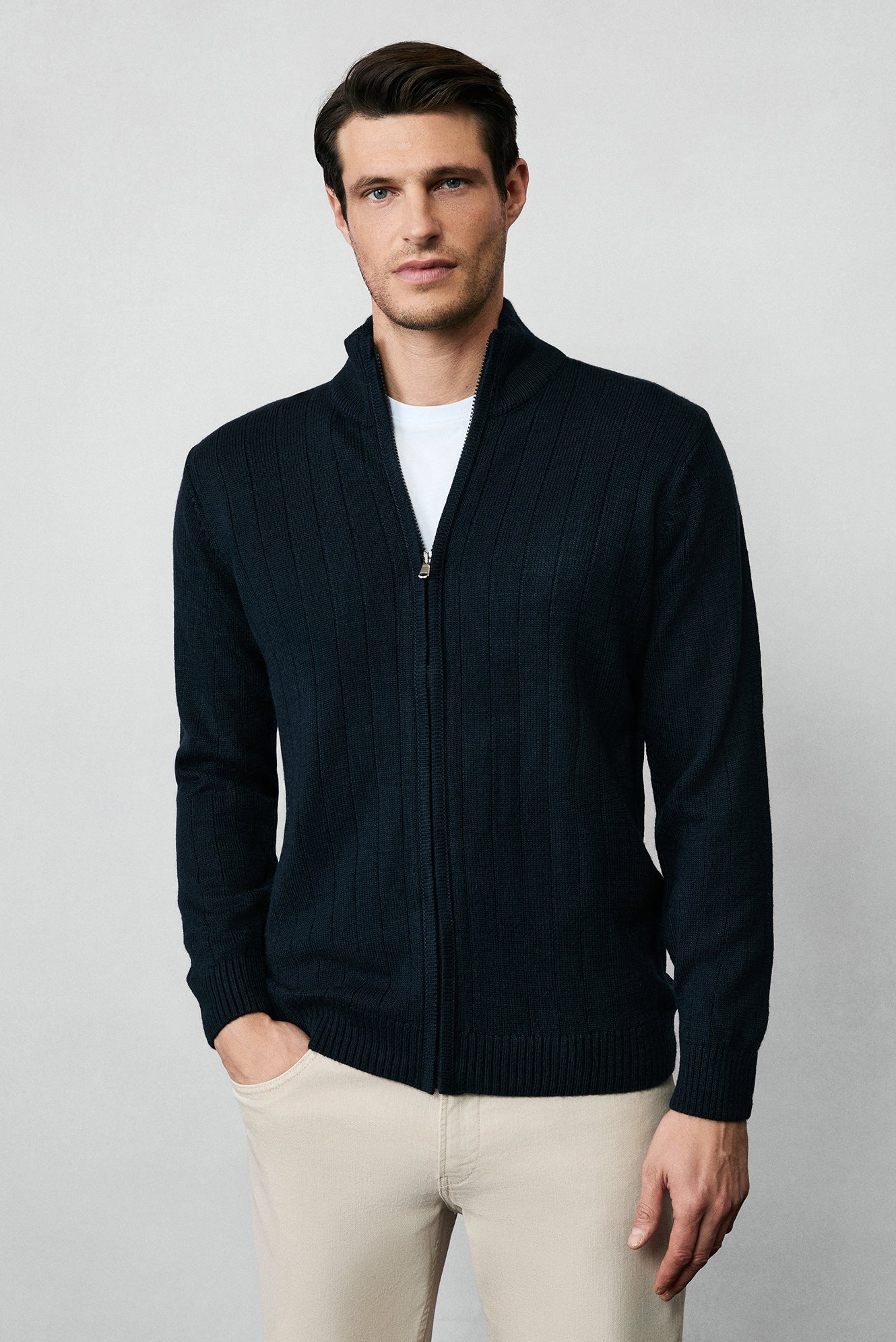 Koyu Lacivert Dik Yaka Fermuarlı Regular Fit Çizgili Triko Hırka