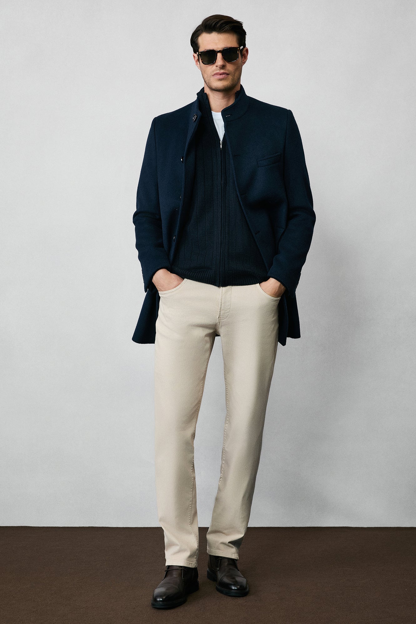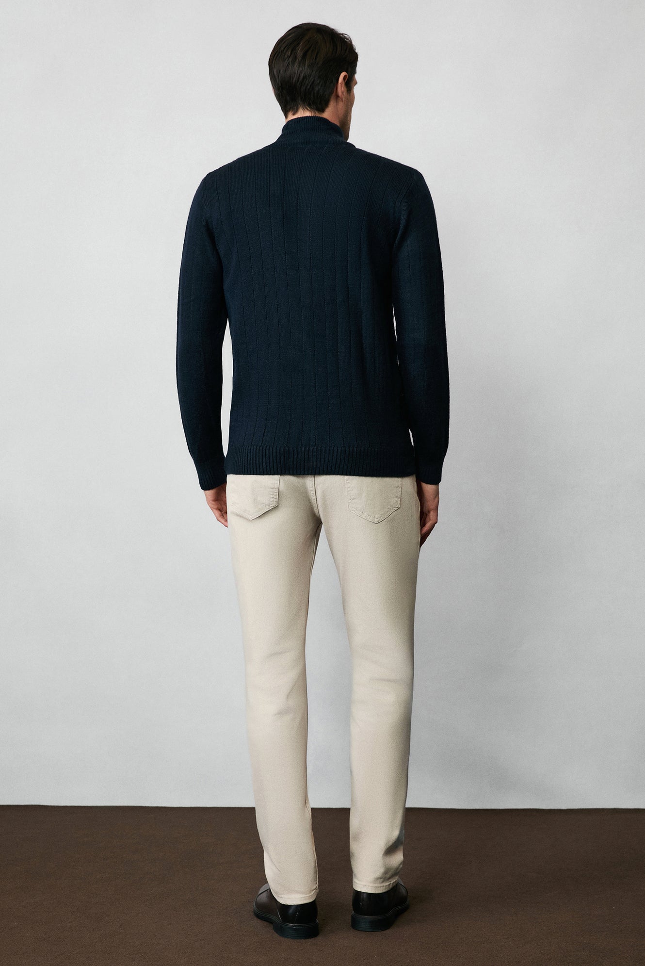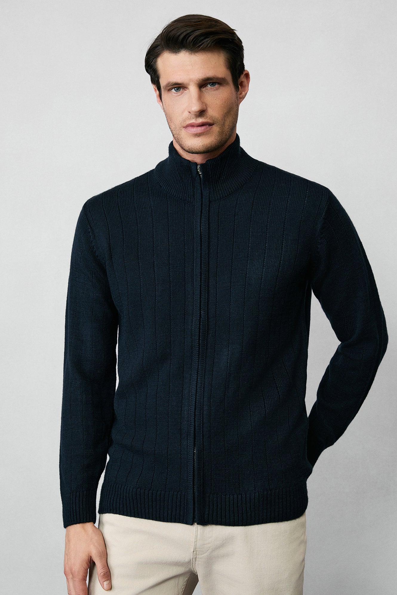Koyu Lacivert Dik Yaka Fermuarlı Regular Fit Çizgili Triko Hırka