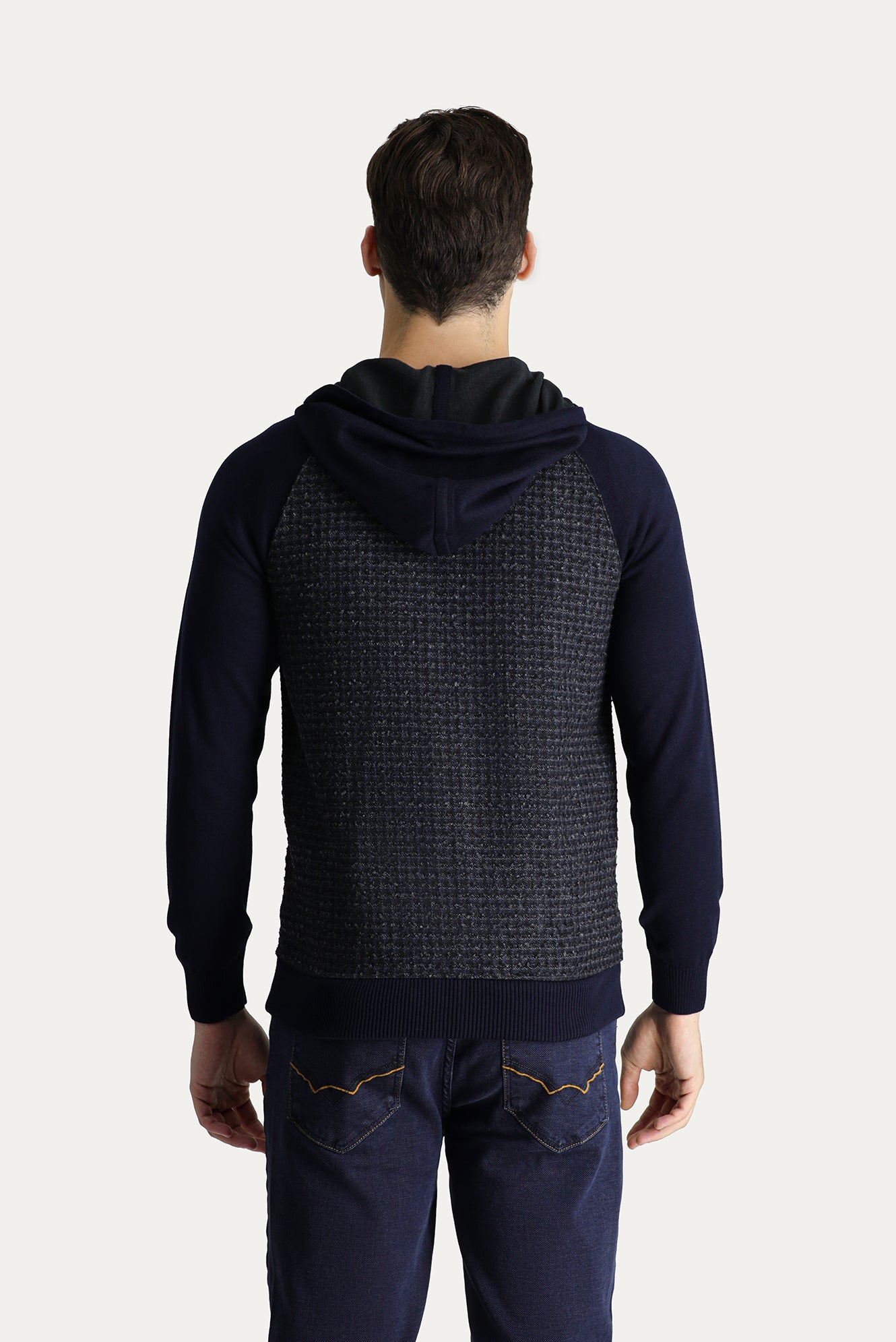 Koyu Lacivert Kapüşonlu Fermuarlı Pamuklu Triko Hırka