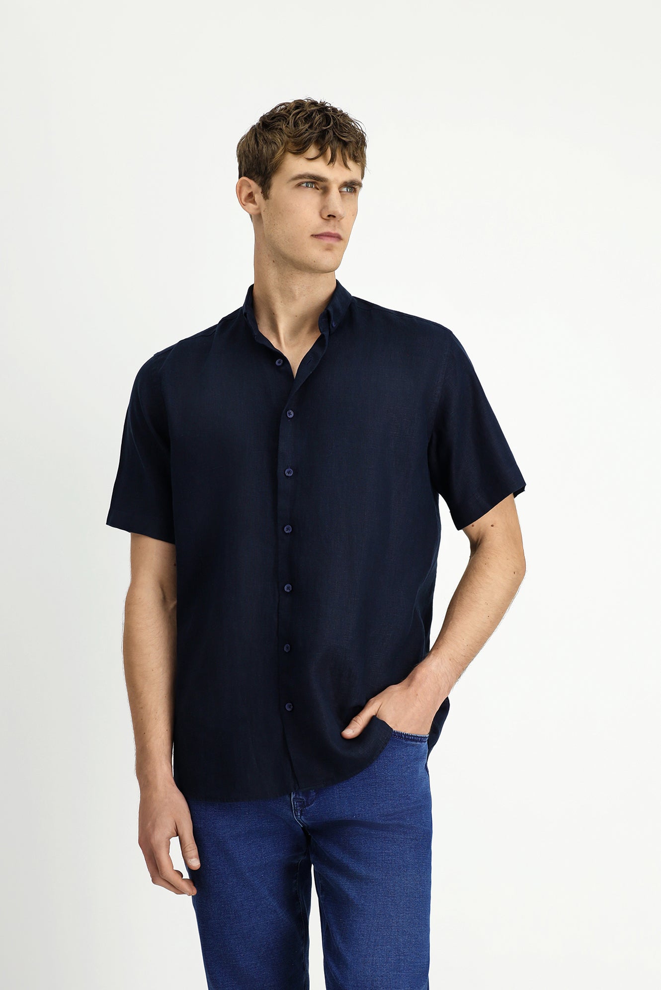 Koyu Lacivert Kısa Kol Regular Fit Düğmeli Yaka Keten Gömlek