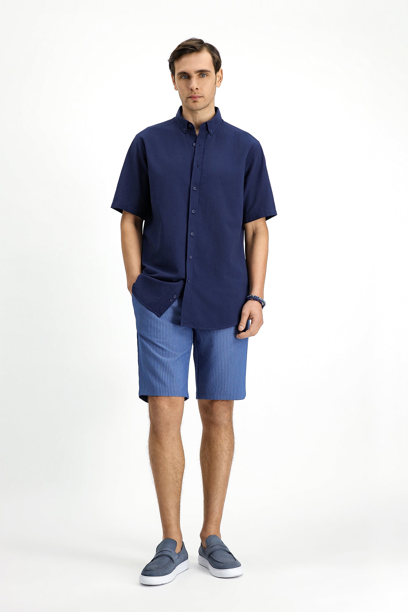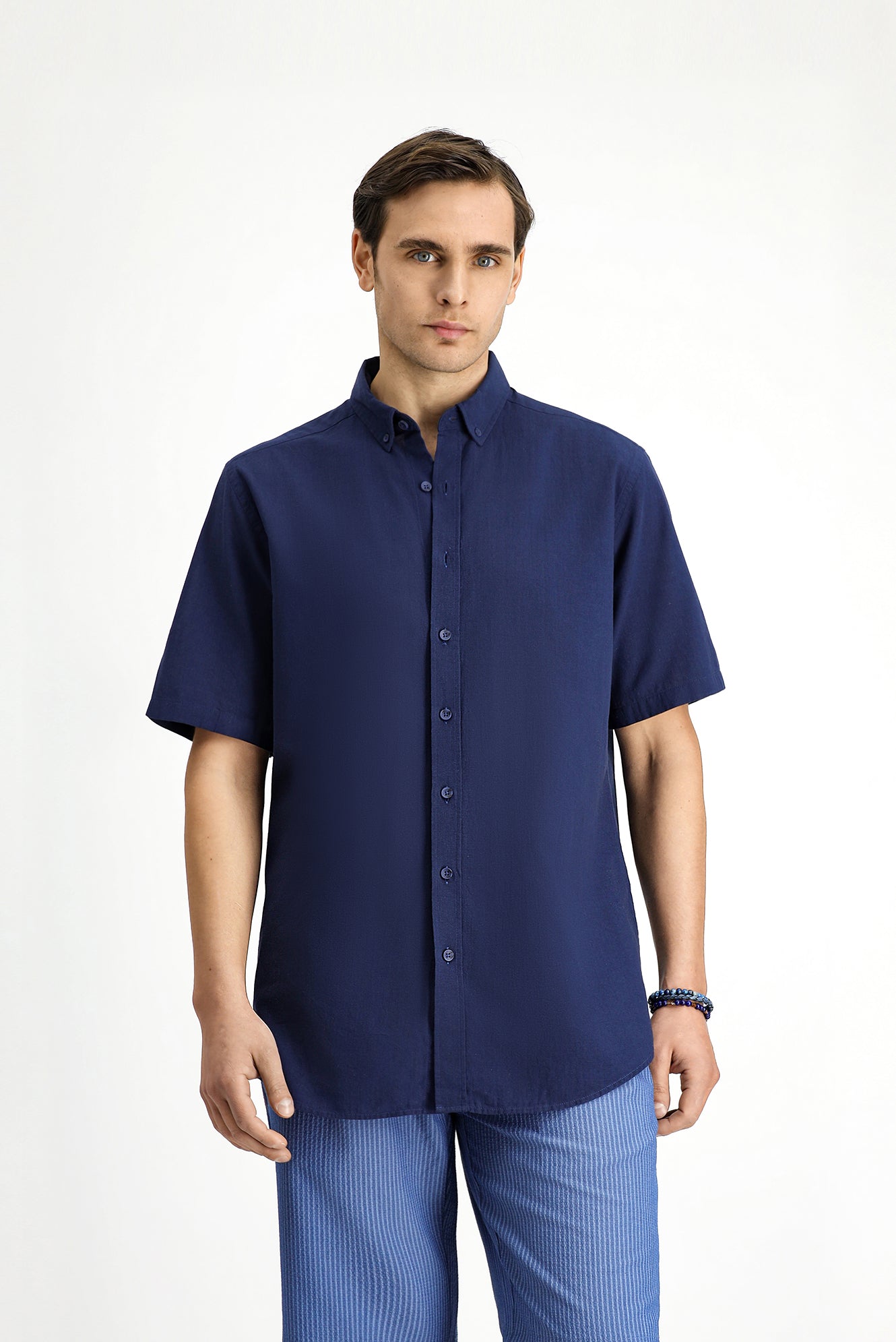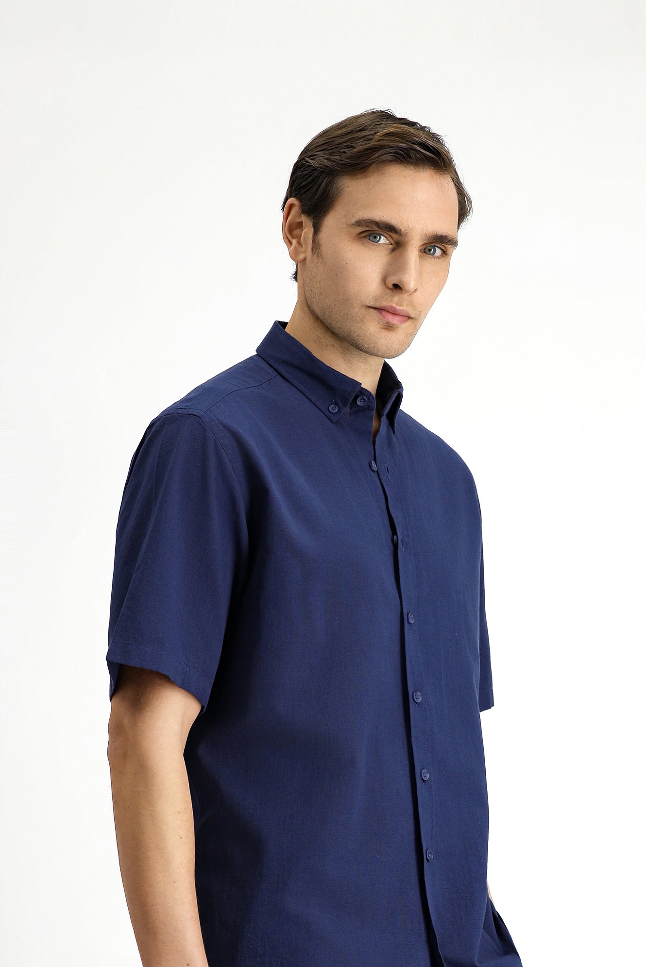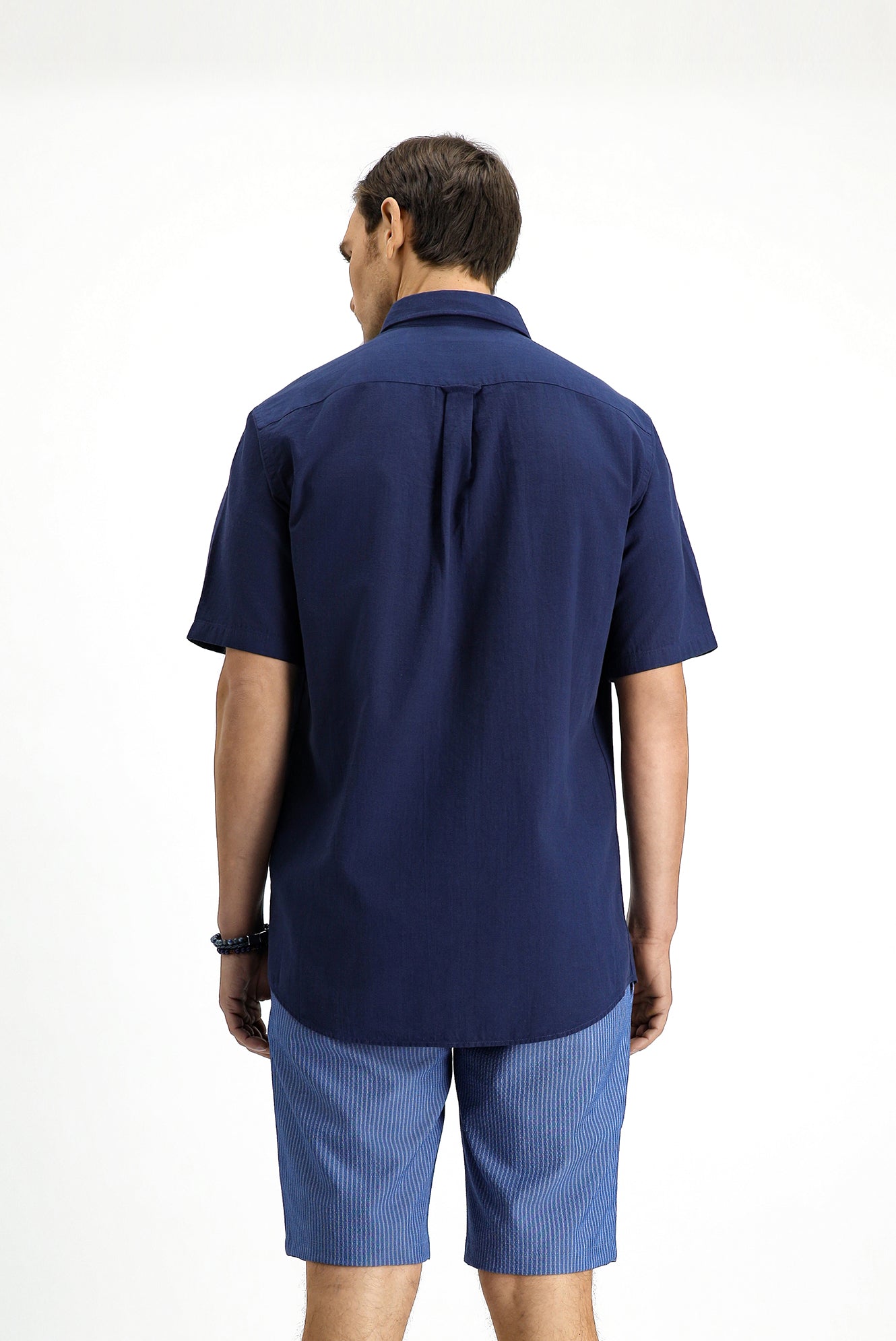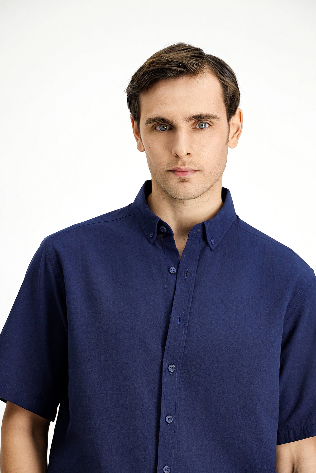 Koyu Lacivert Kısa Kol Regular Fit Düğmeli Yaka Pamuk Gömlek