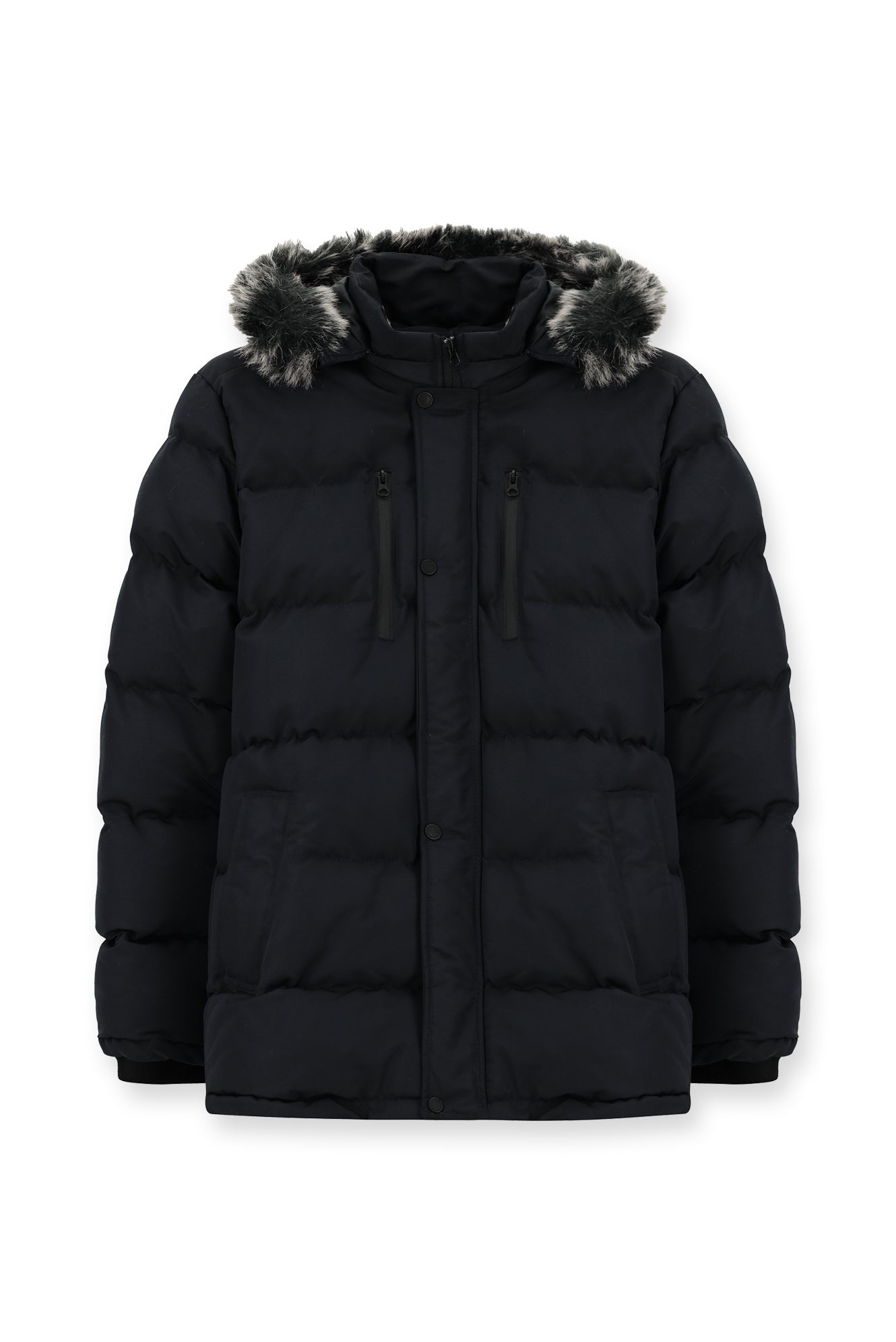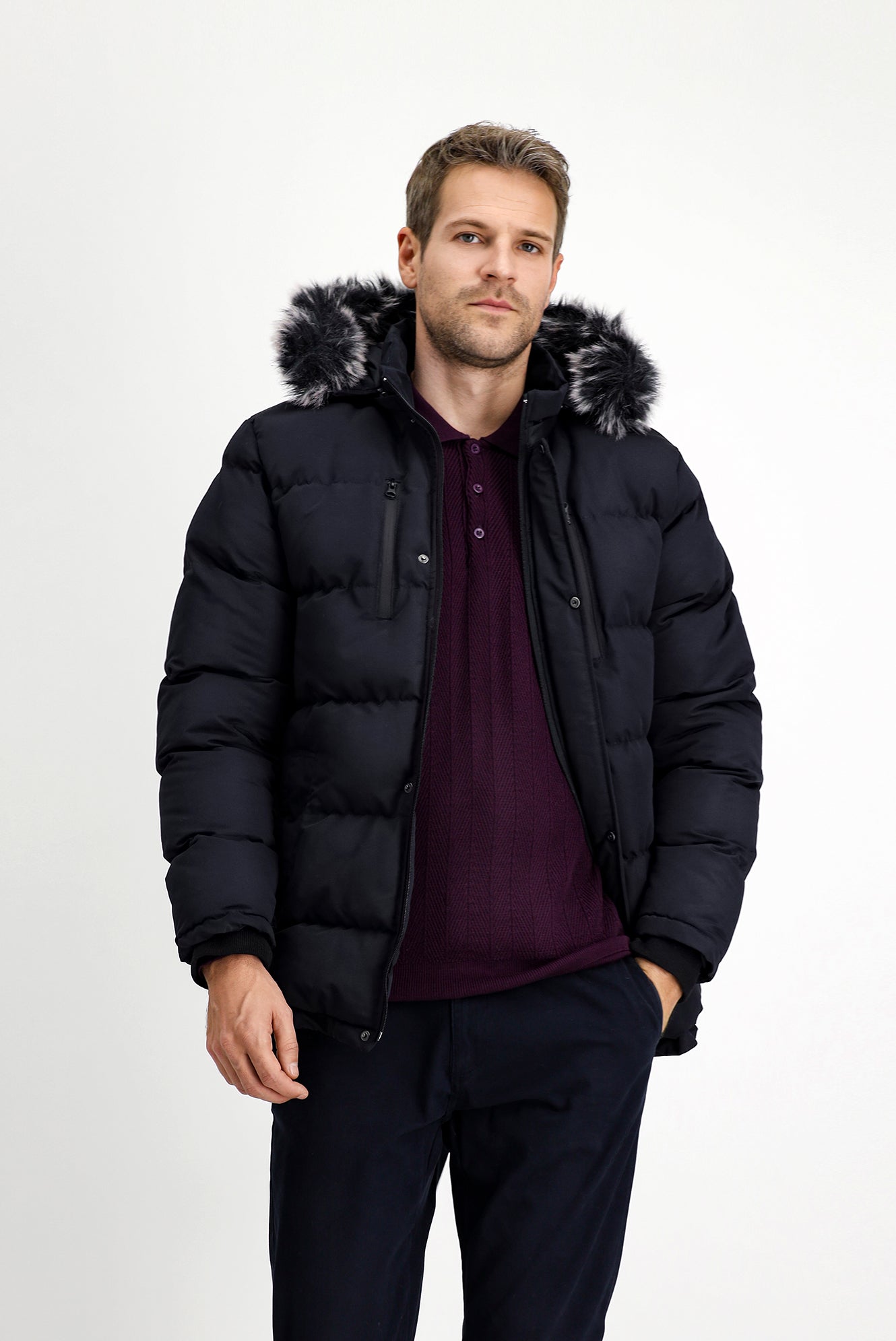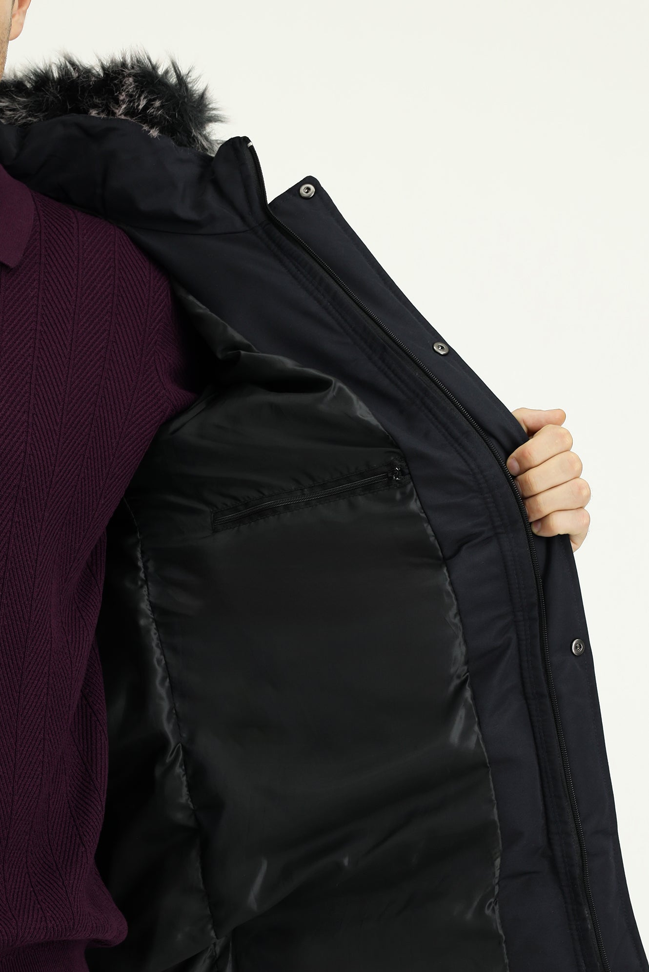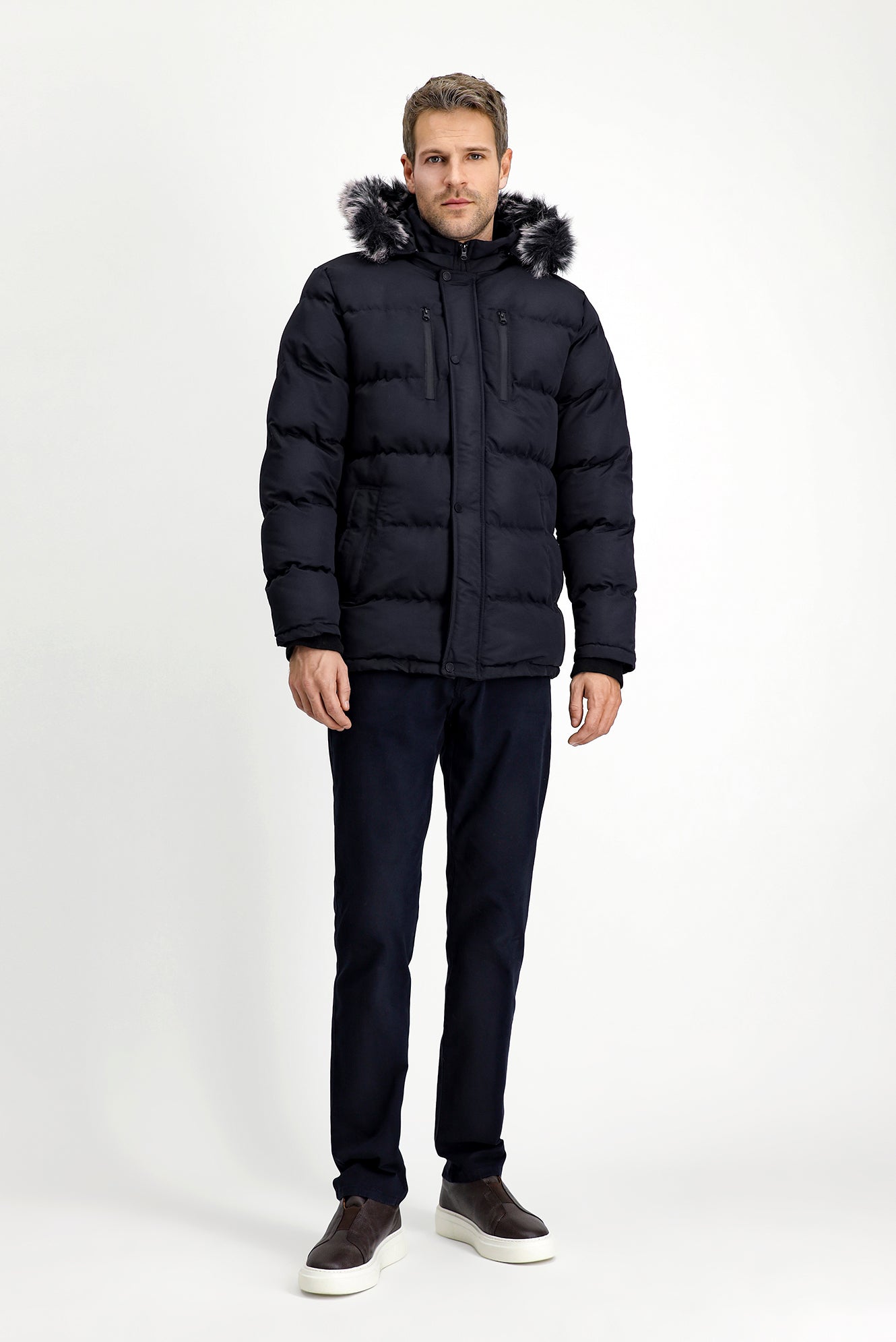 Koyu Lacivert Kürklü Kapüşonlu Spor Şişme Kaban