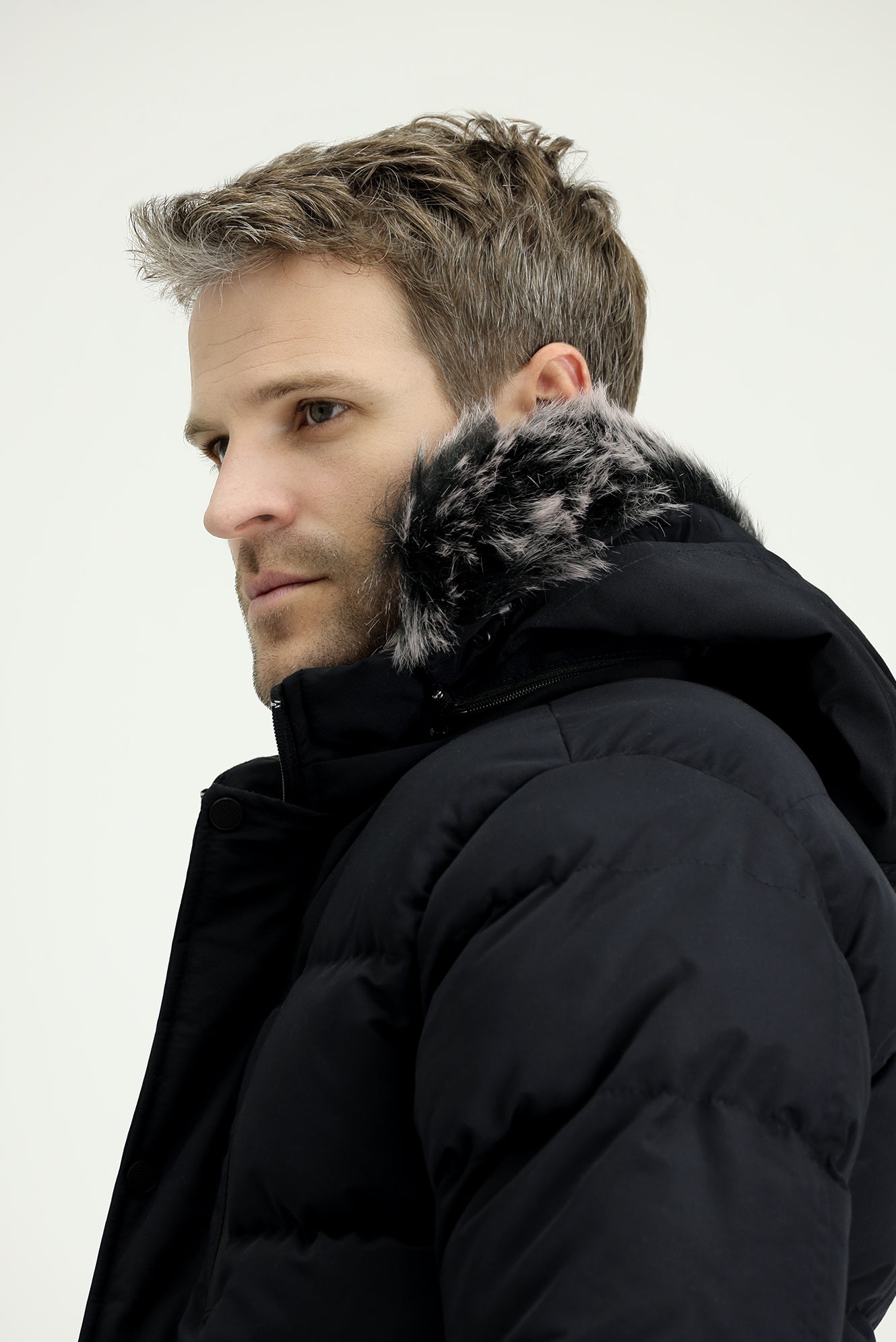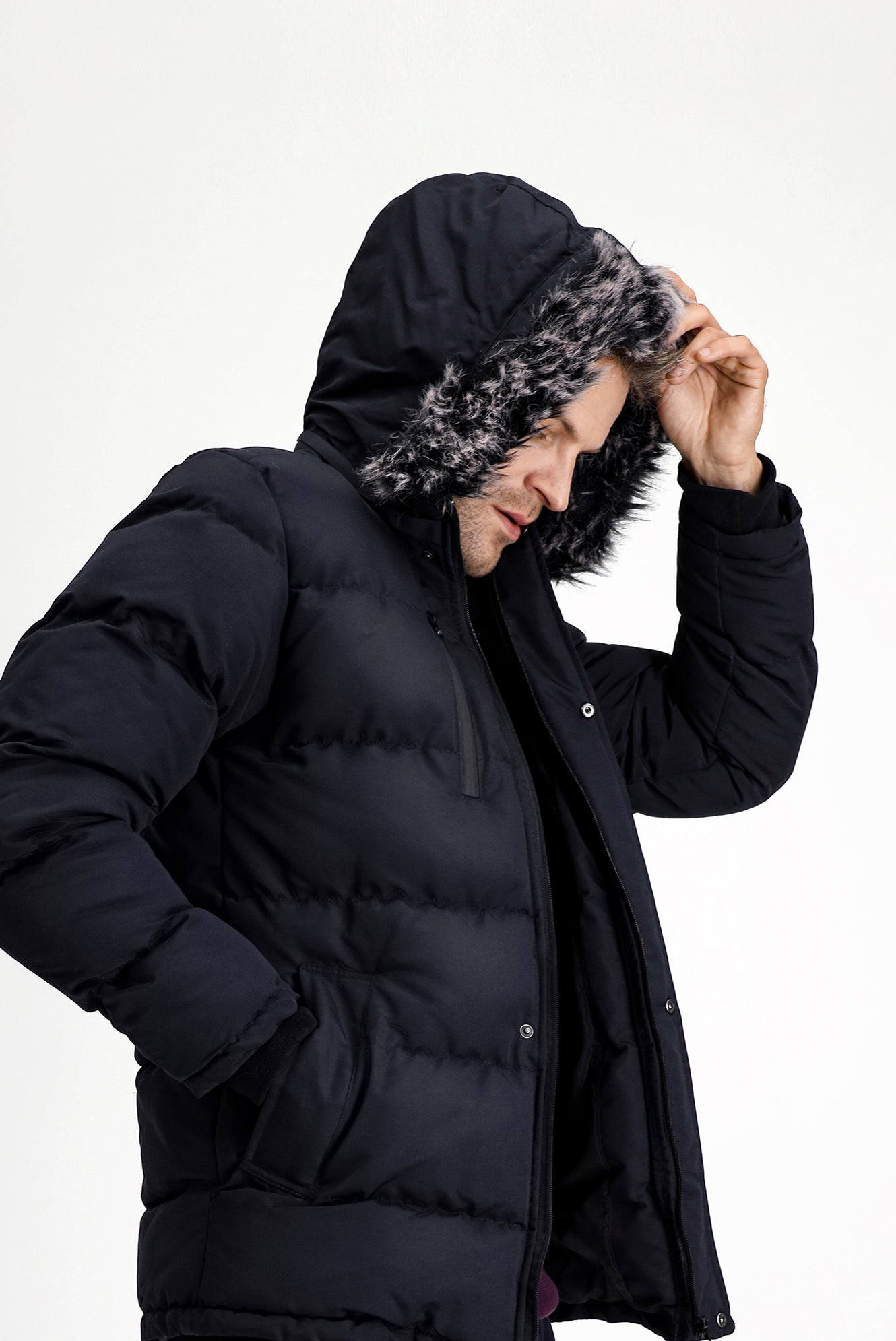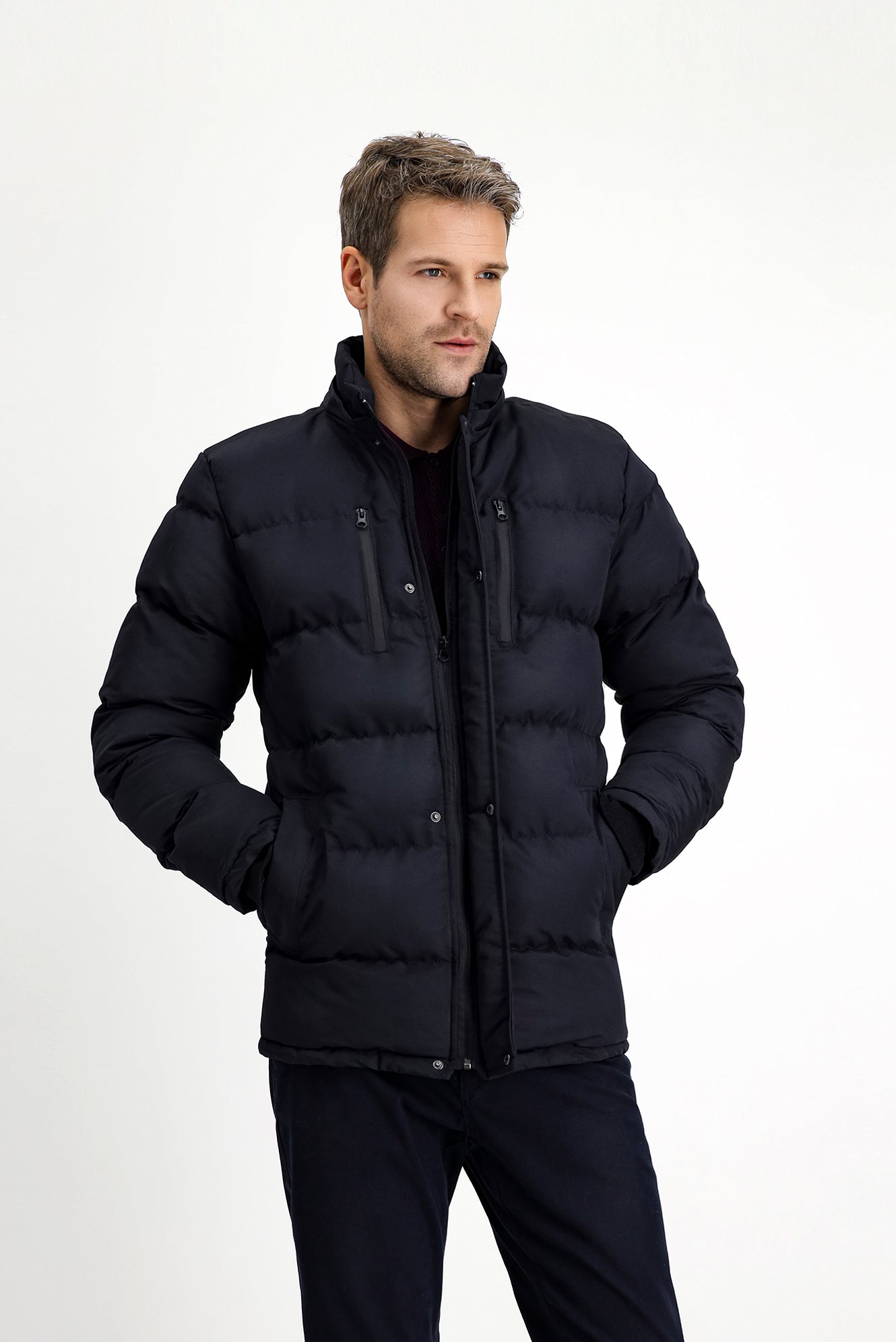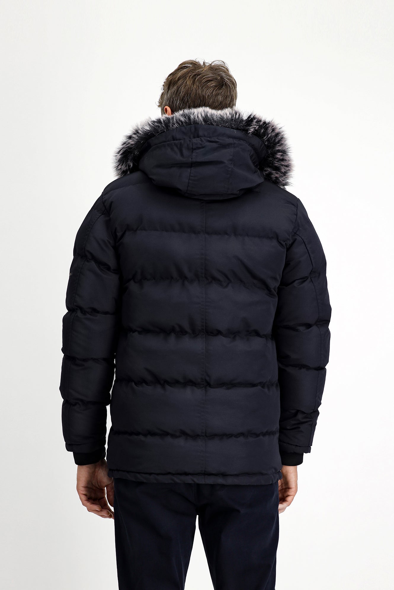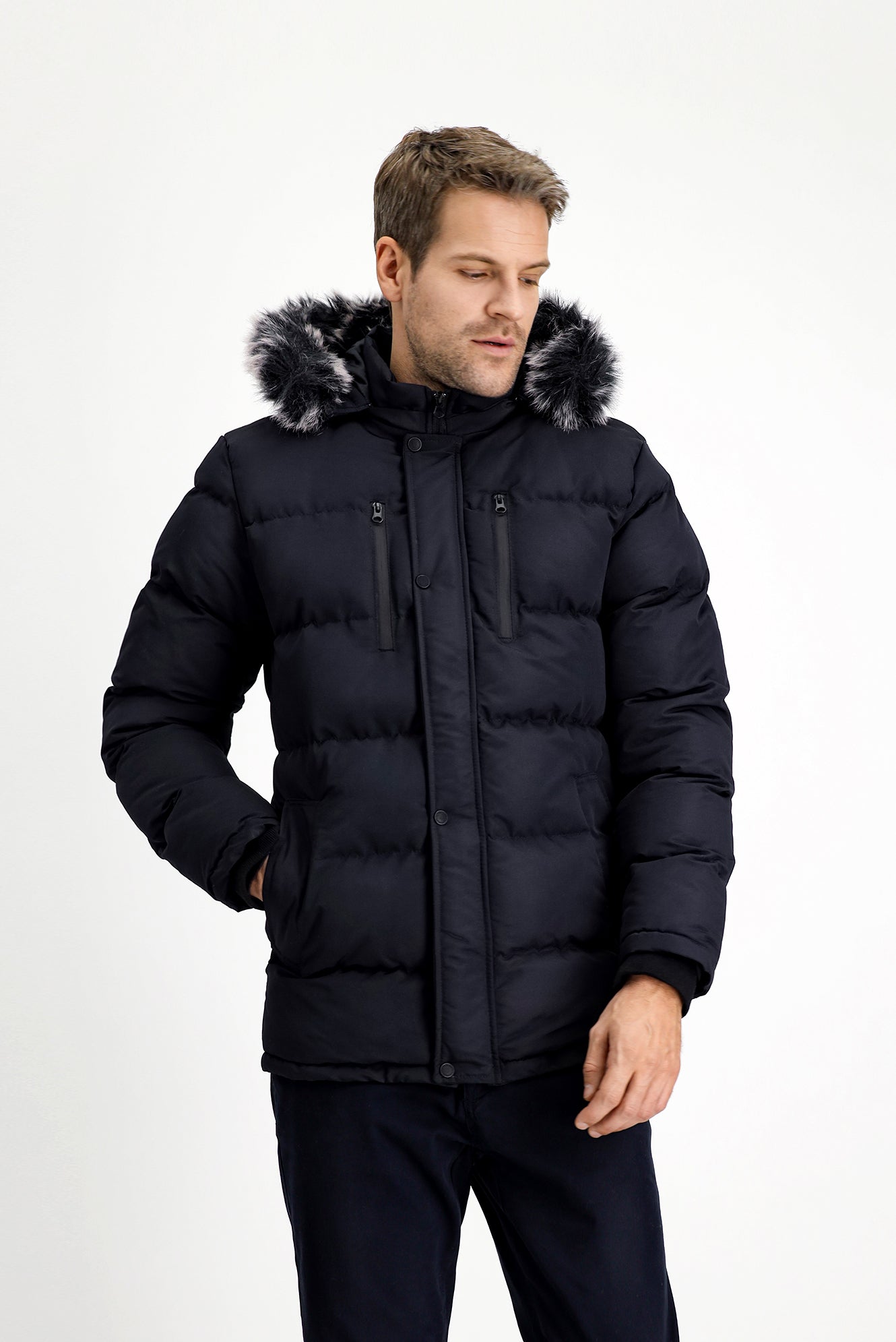 Koyu Lacivert Kürklü Kapüşonlu Spor Şişme Kaban