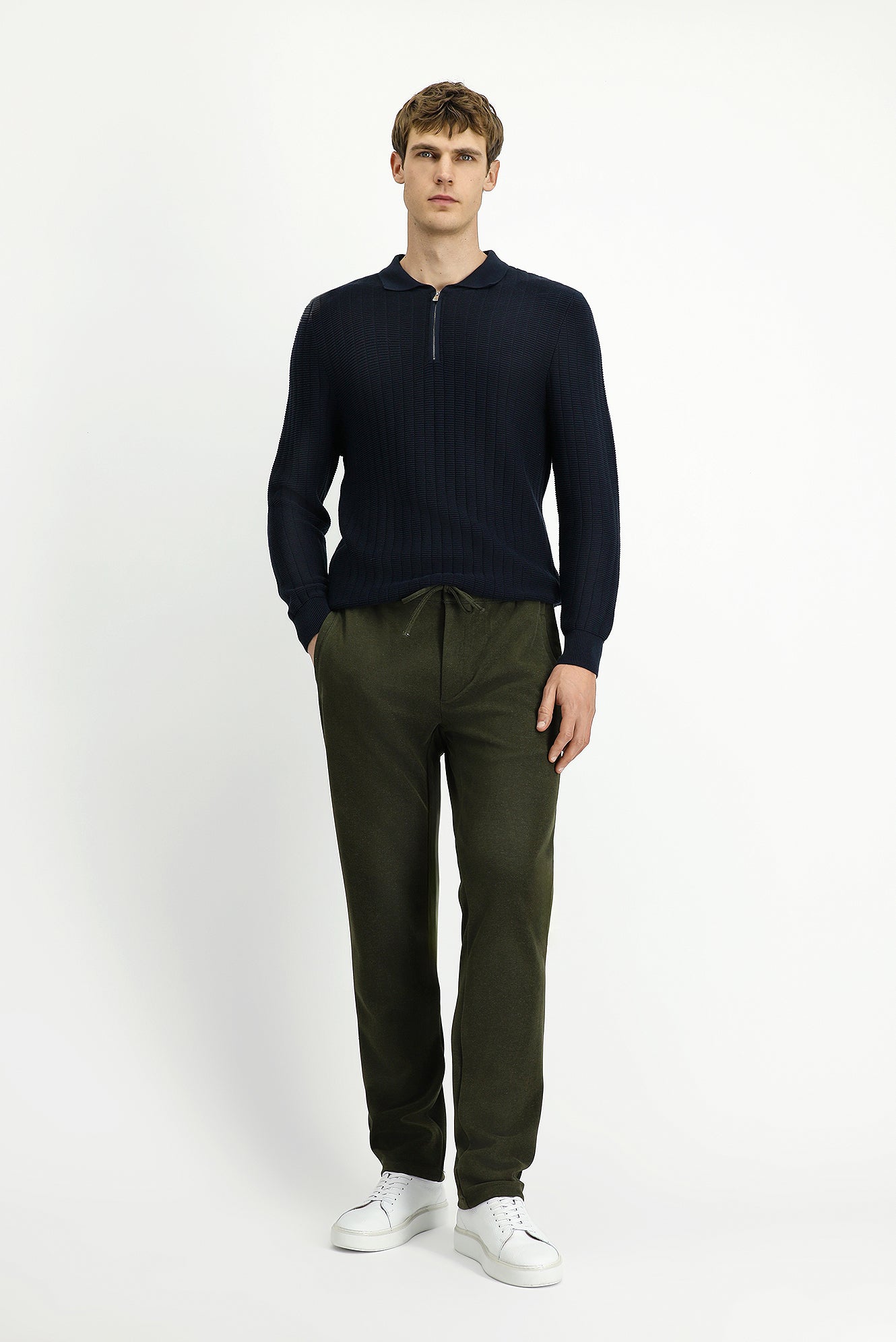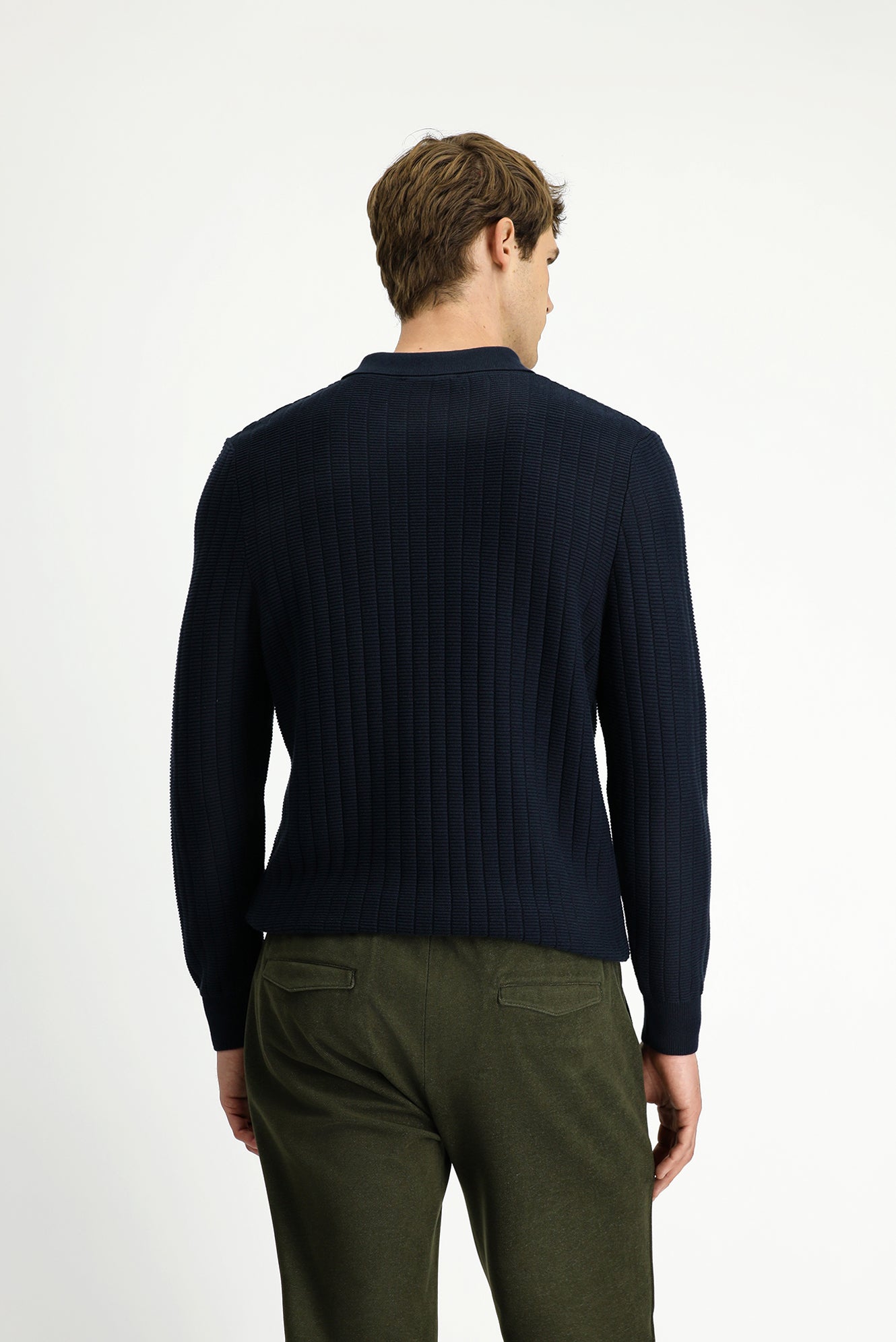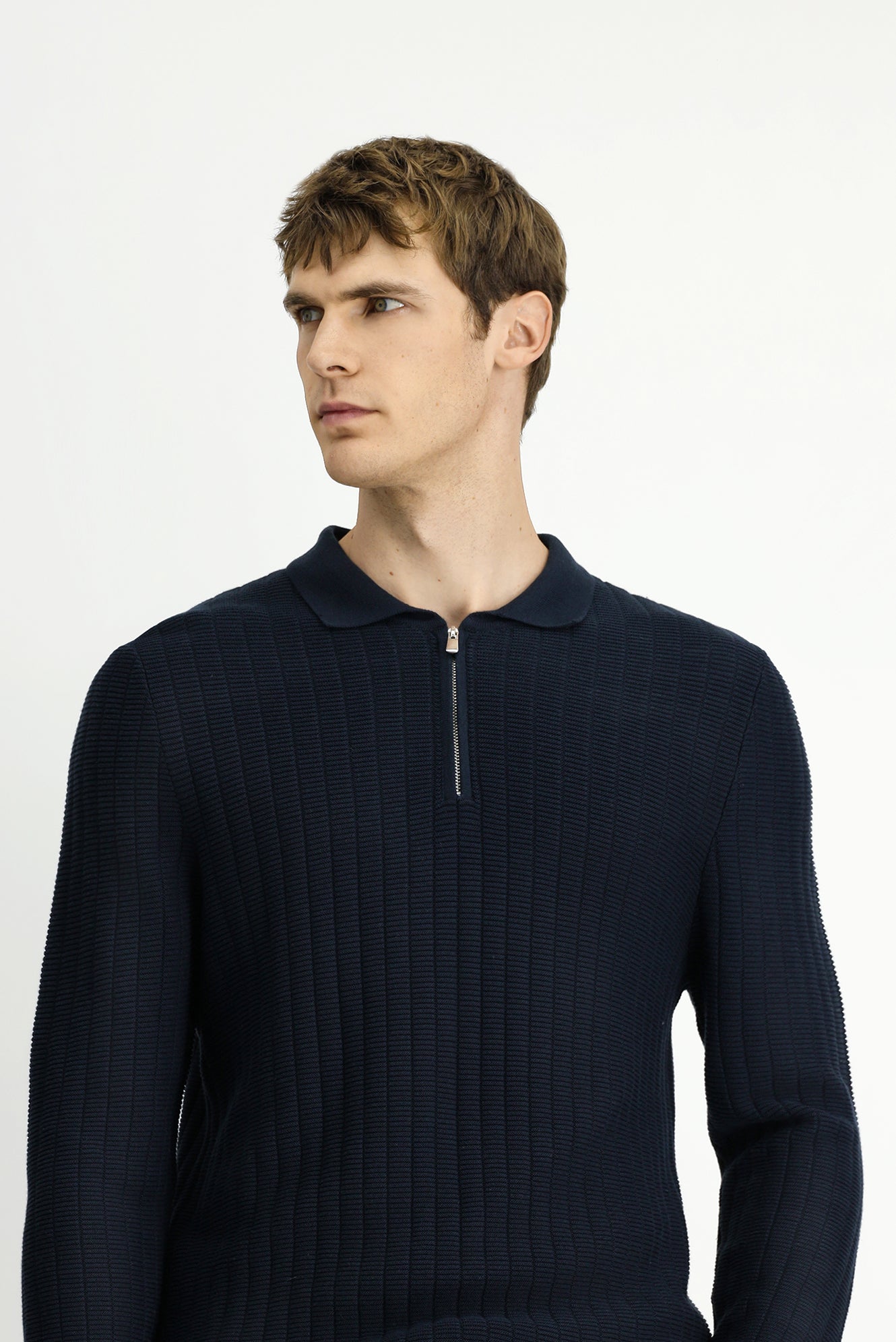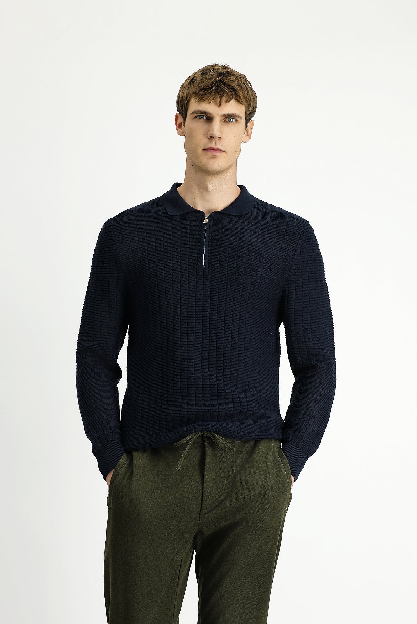 Koyu Lacivert Polo Yaka Regular Fit Desenli Fermuarlı Pamuklu Triko Kazak