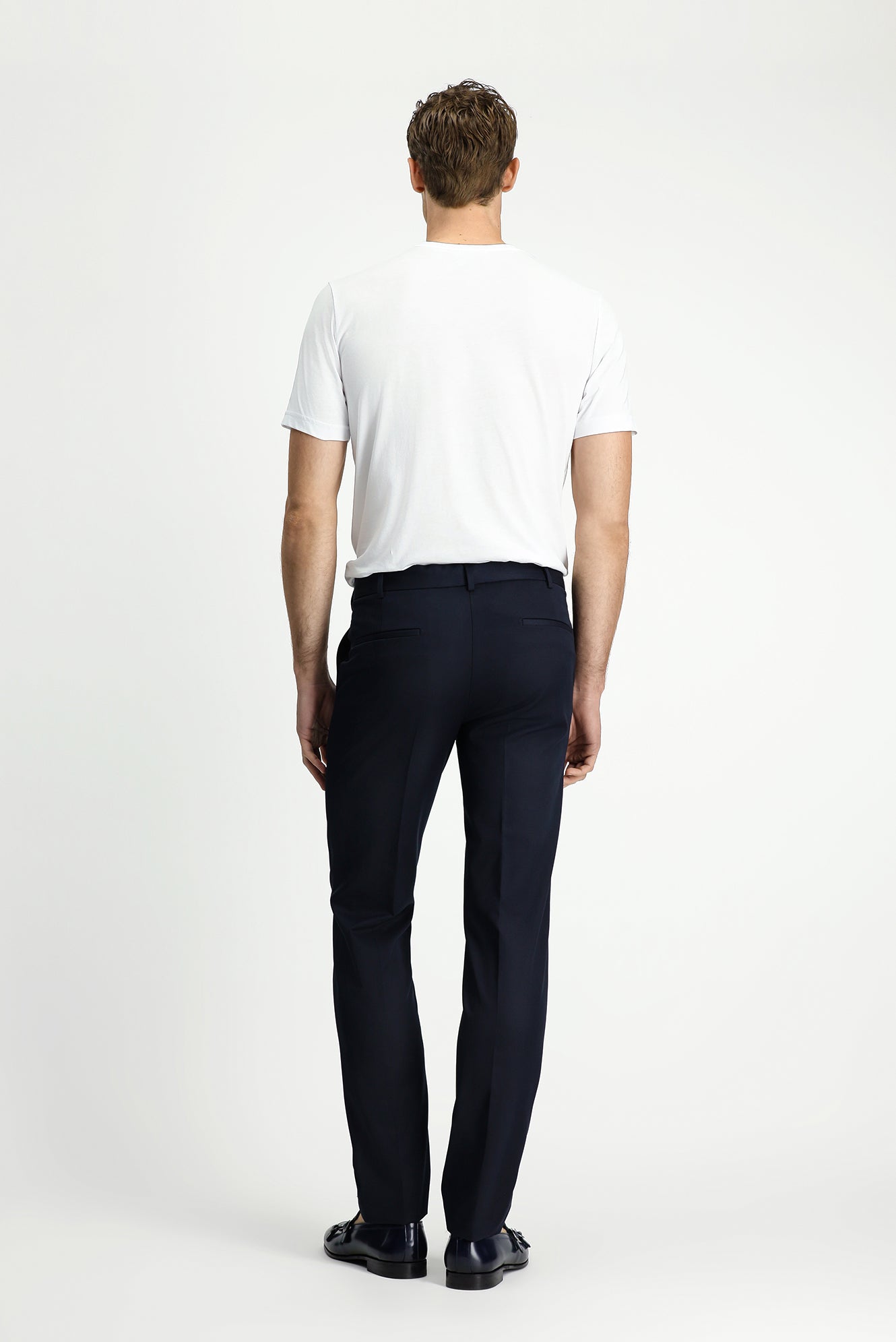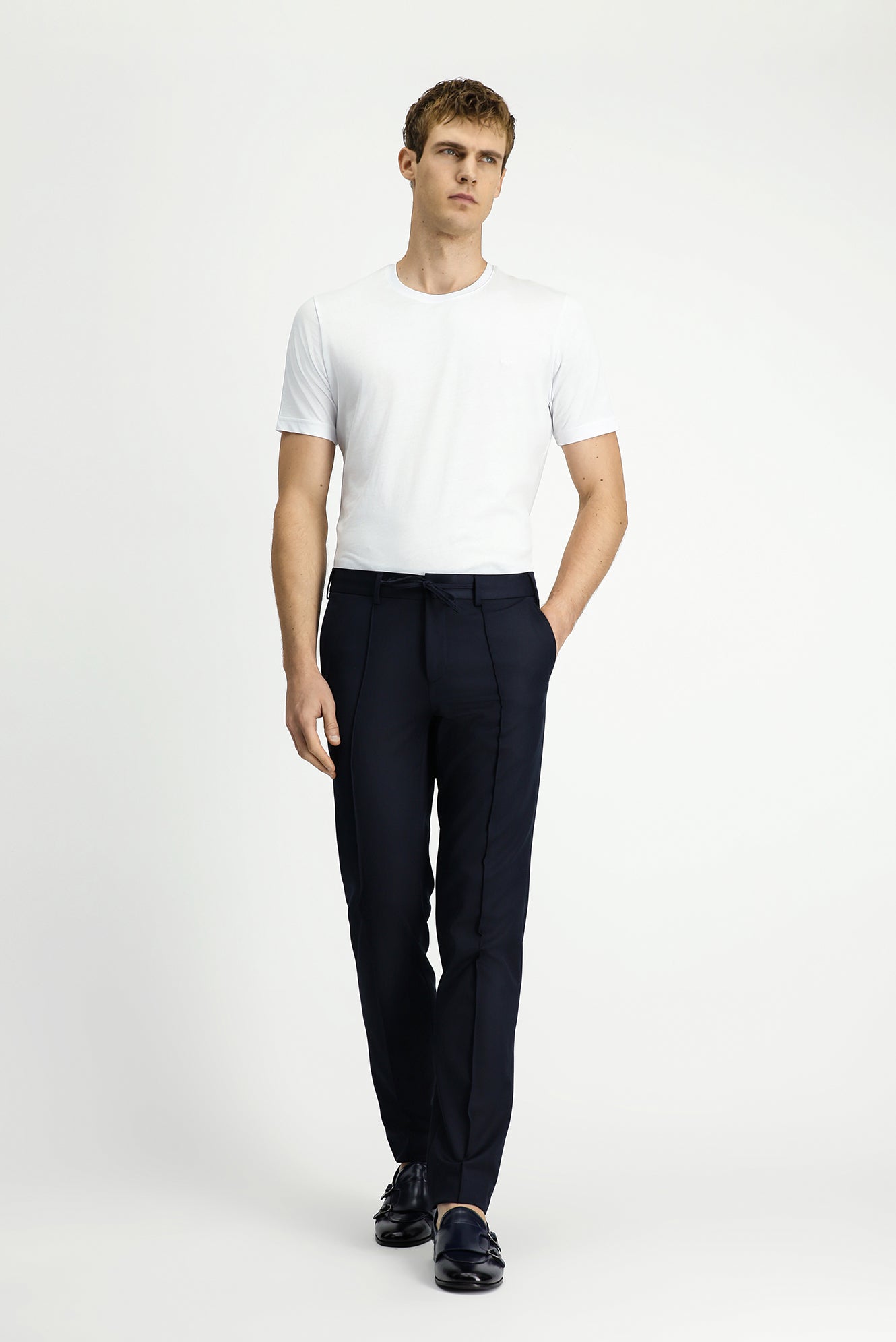 Koyu Lacivert Slim Fit Dar Kesim Nervürlü Beli İpli Klasik Kumaş Pantolon