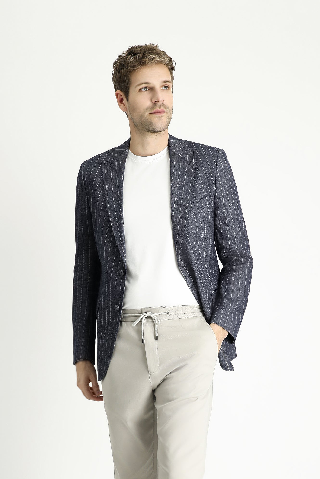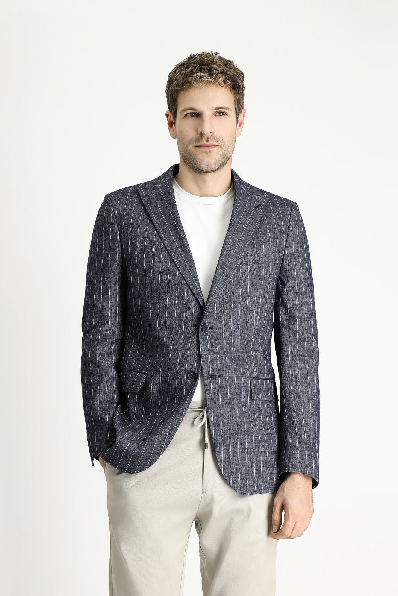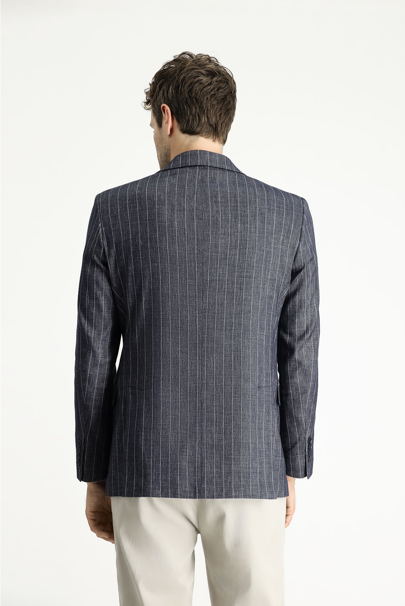 Koyu Lacivert Regular Fit Çizgili Keten Karışımlı Ceket