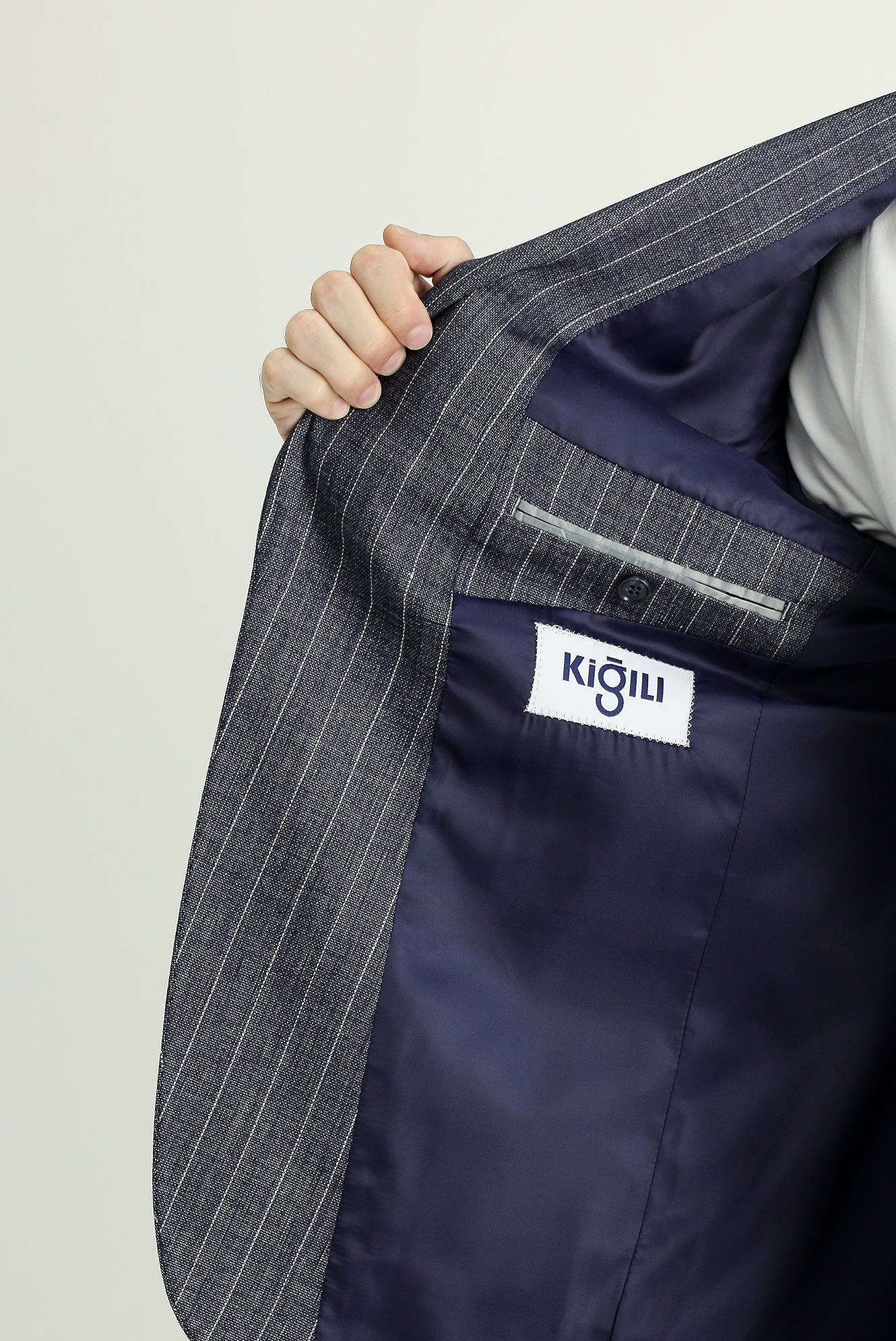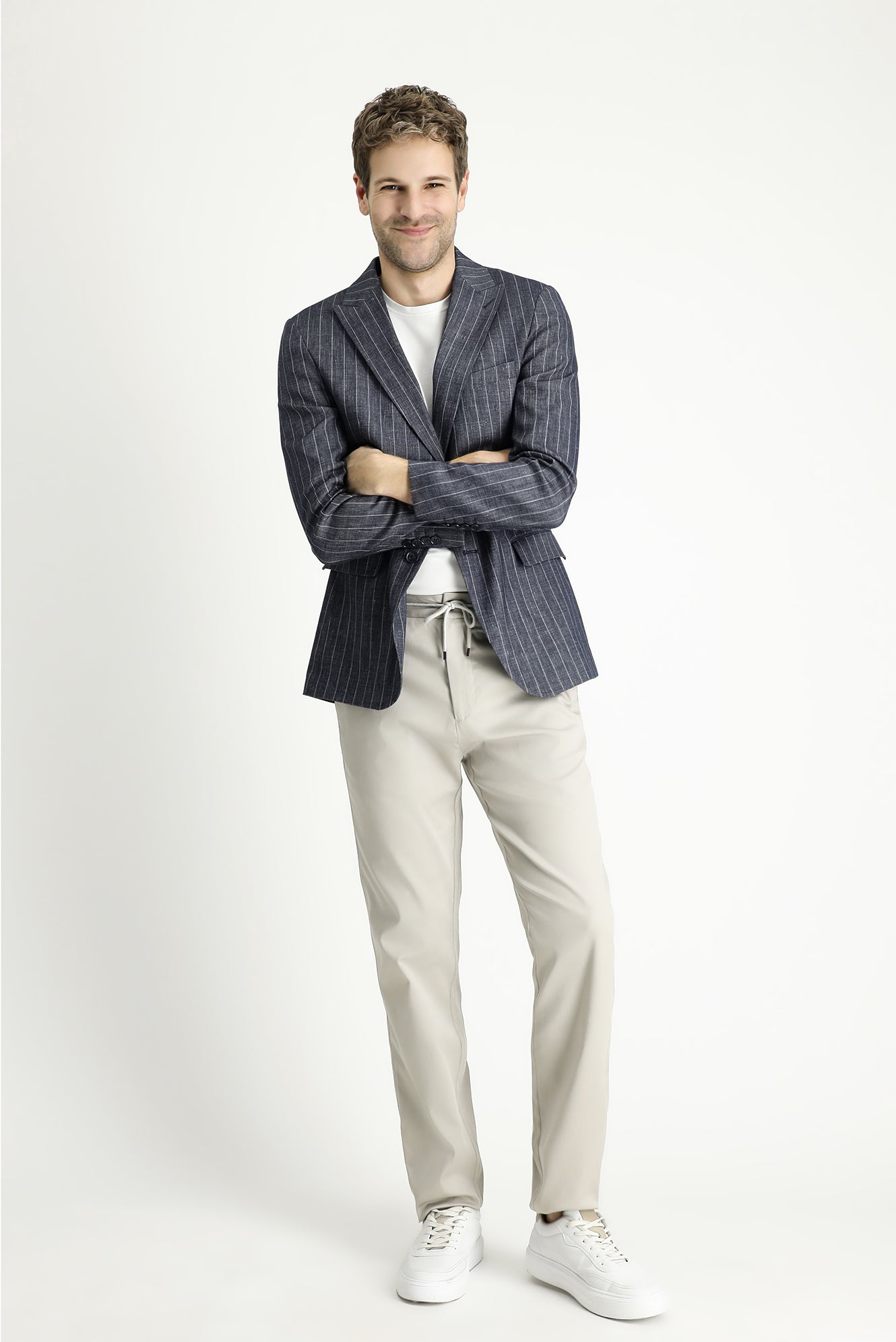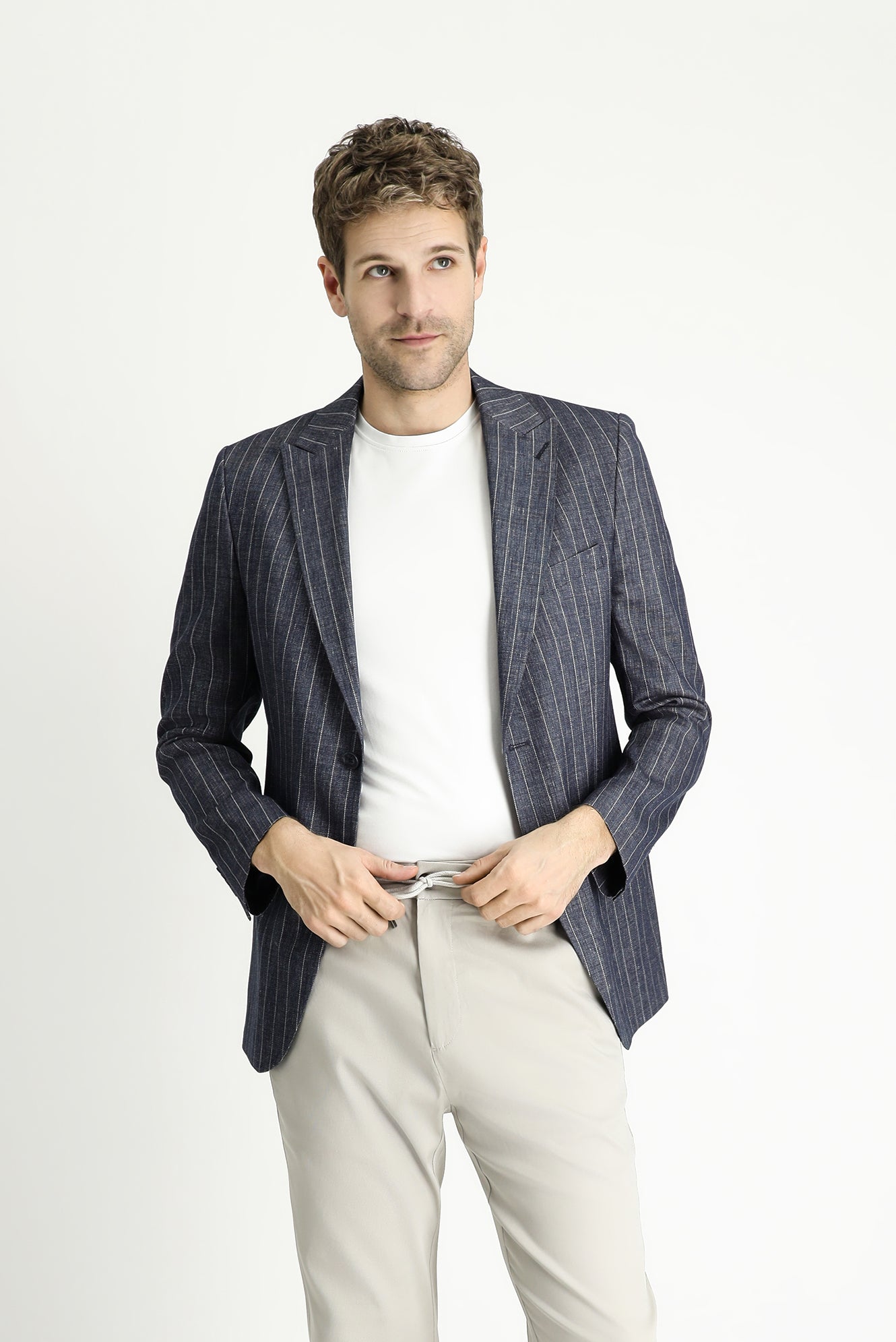 Koyu Lacivert Regular Fit Çizgili Keten Karışımlı Ceket