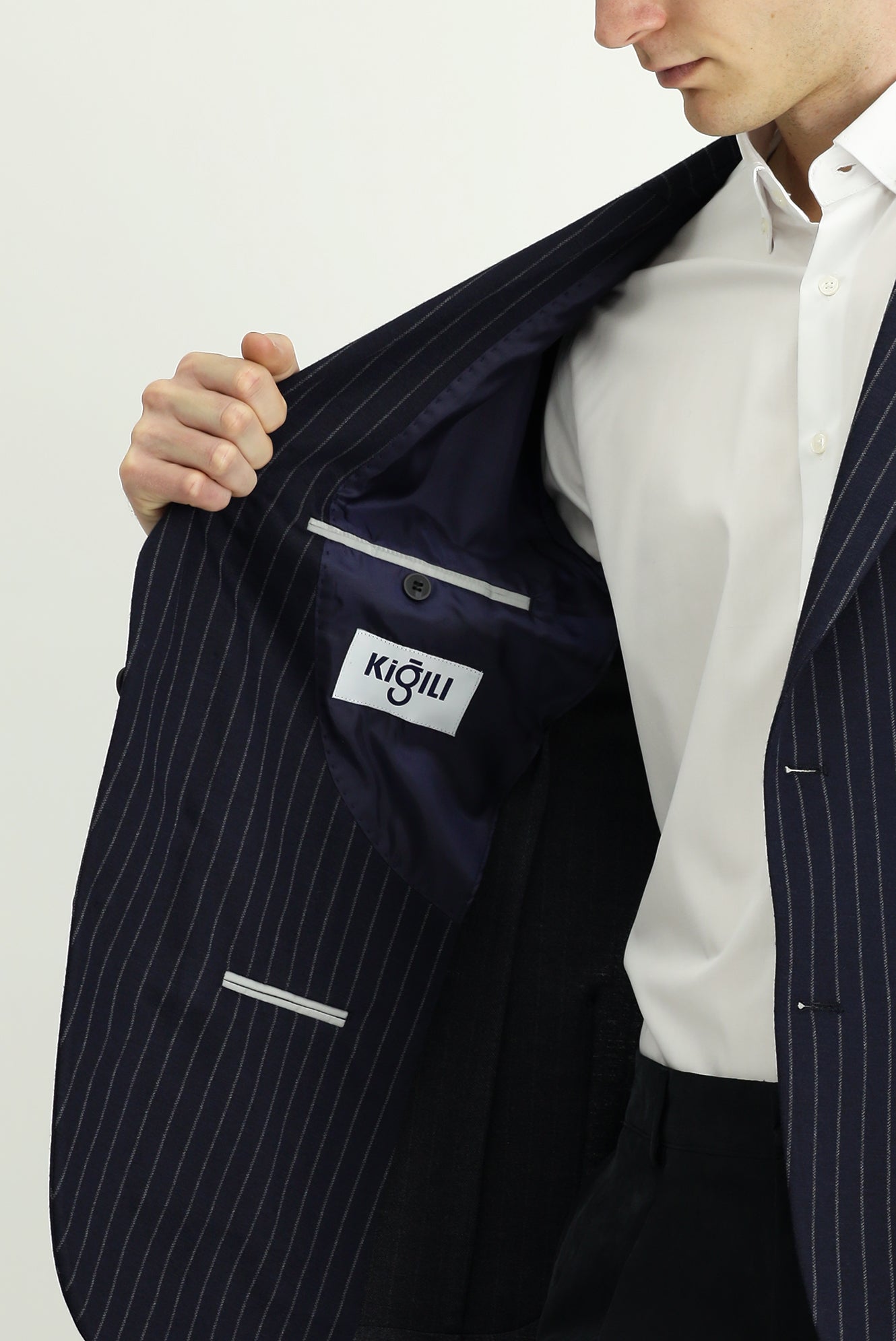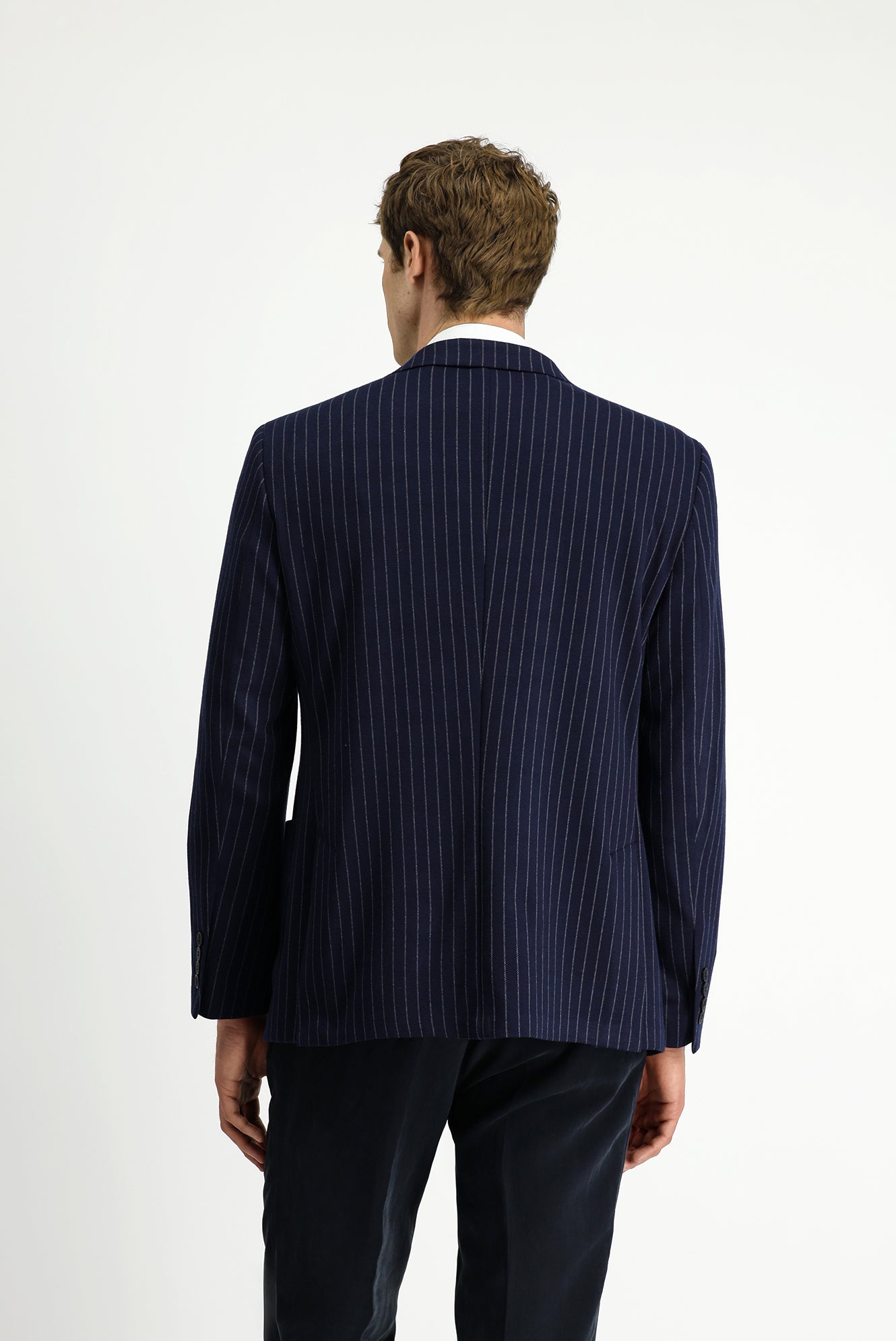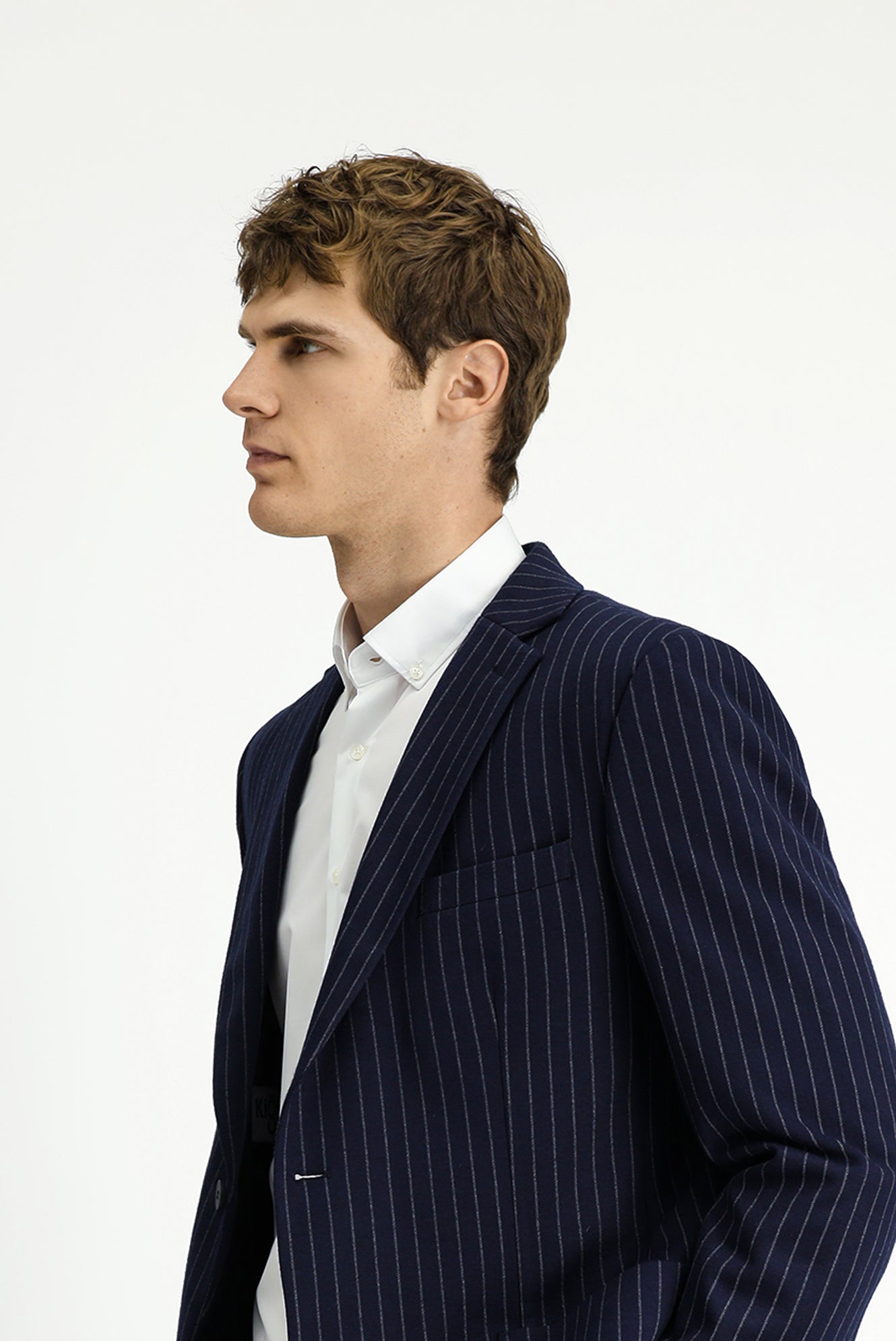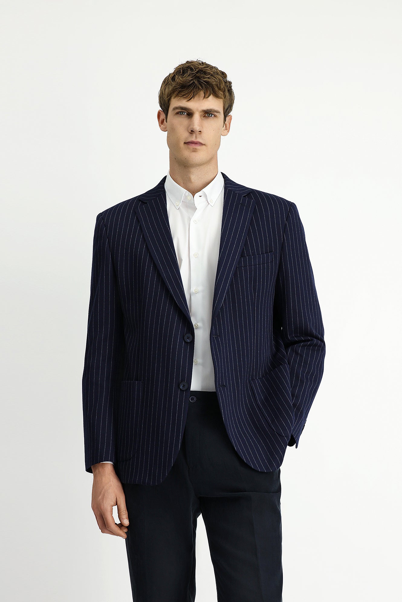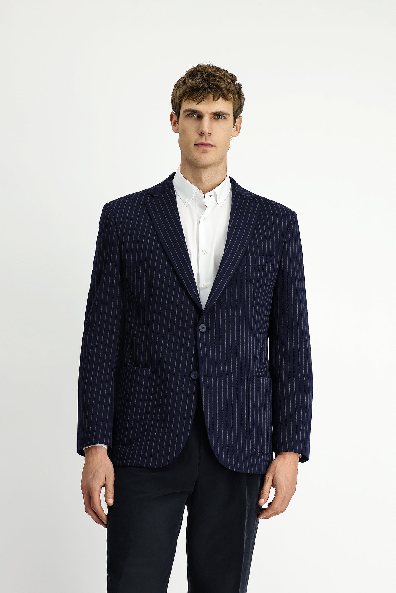 Koyu Lacivert Relaxed Fit Rahat Kesim Çizgili Örme Kruvaze Ceket