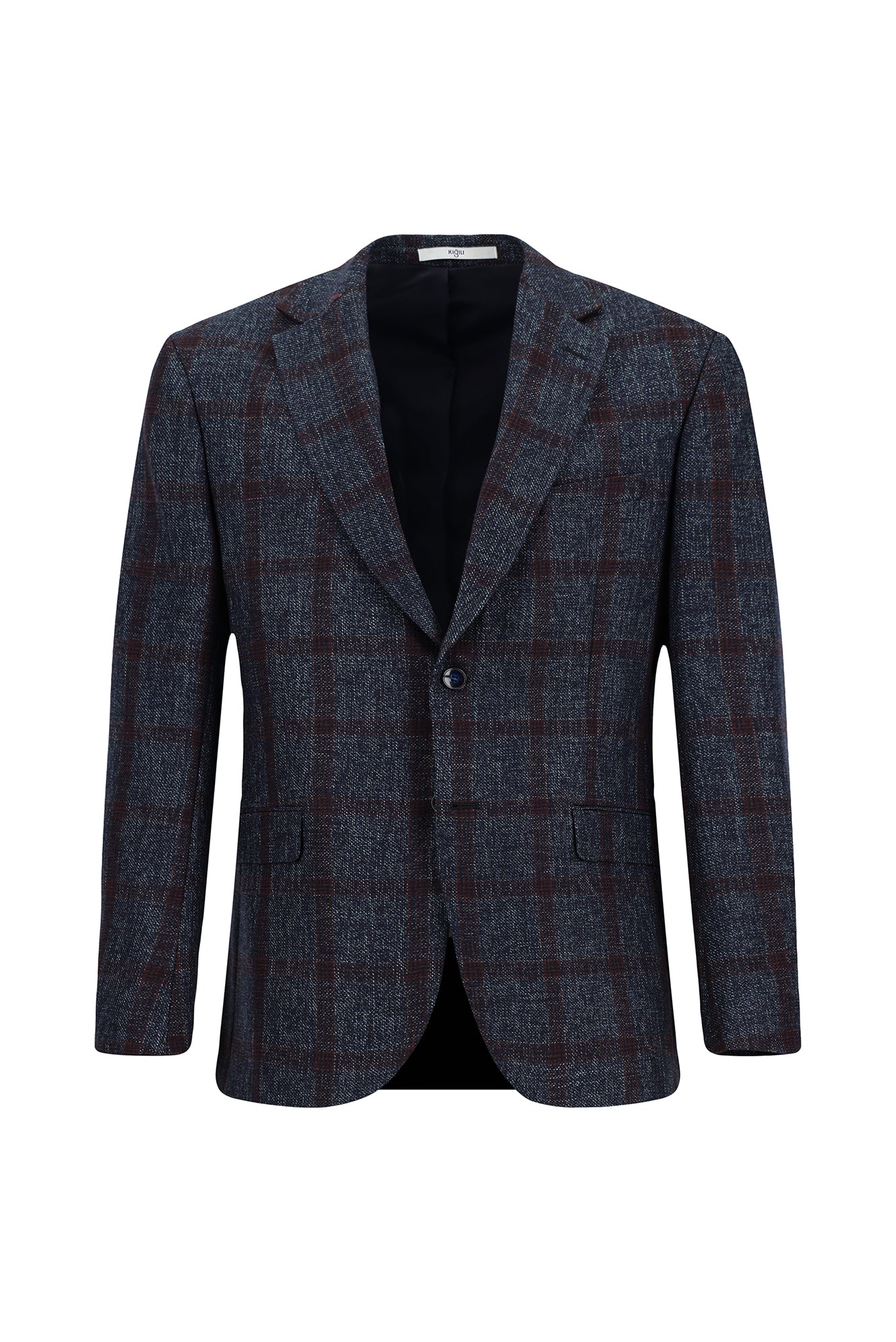 Koyu Lacivert Muscle Fit Ekose Yünlü Ceket