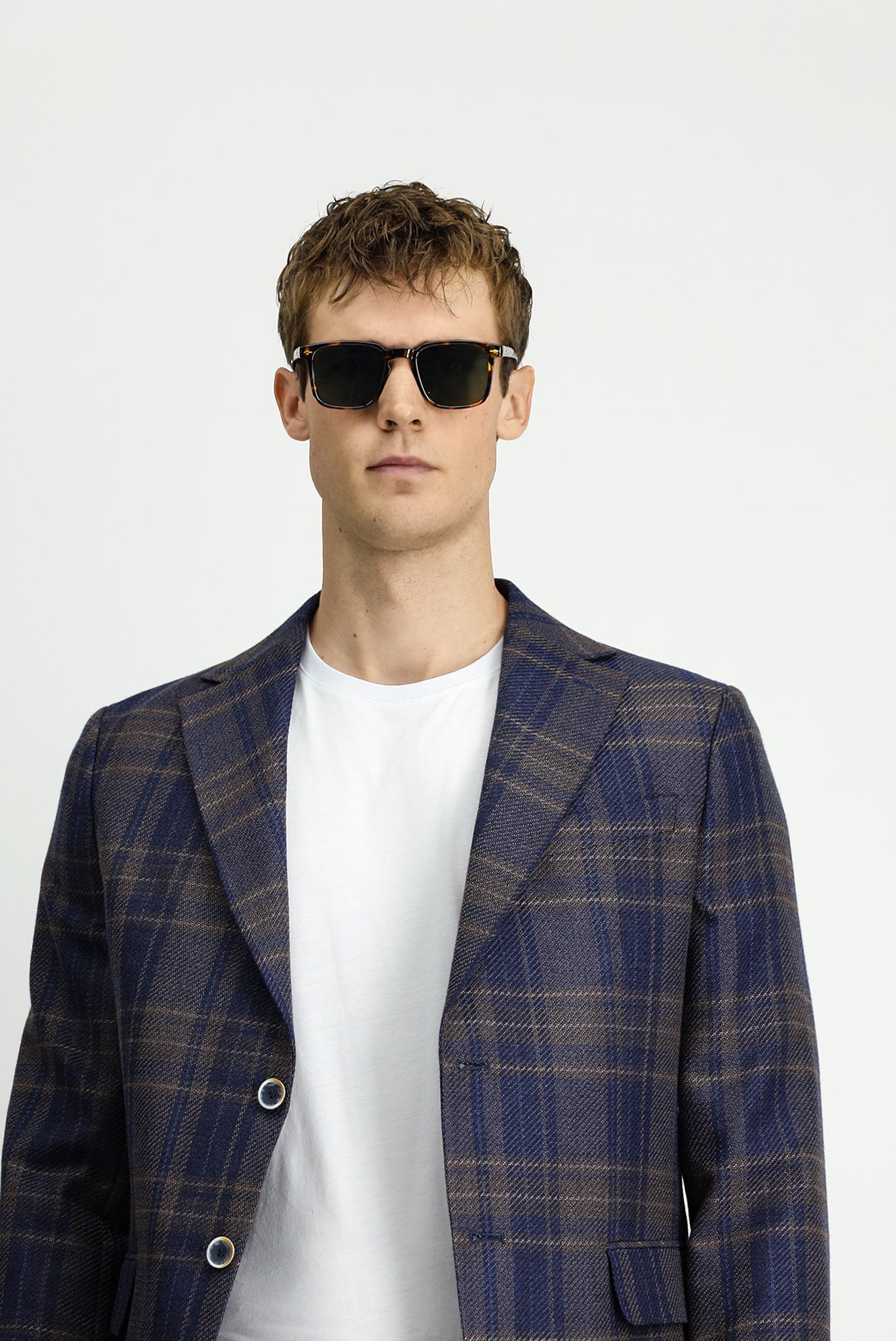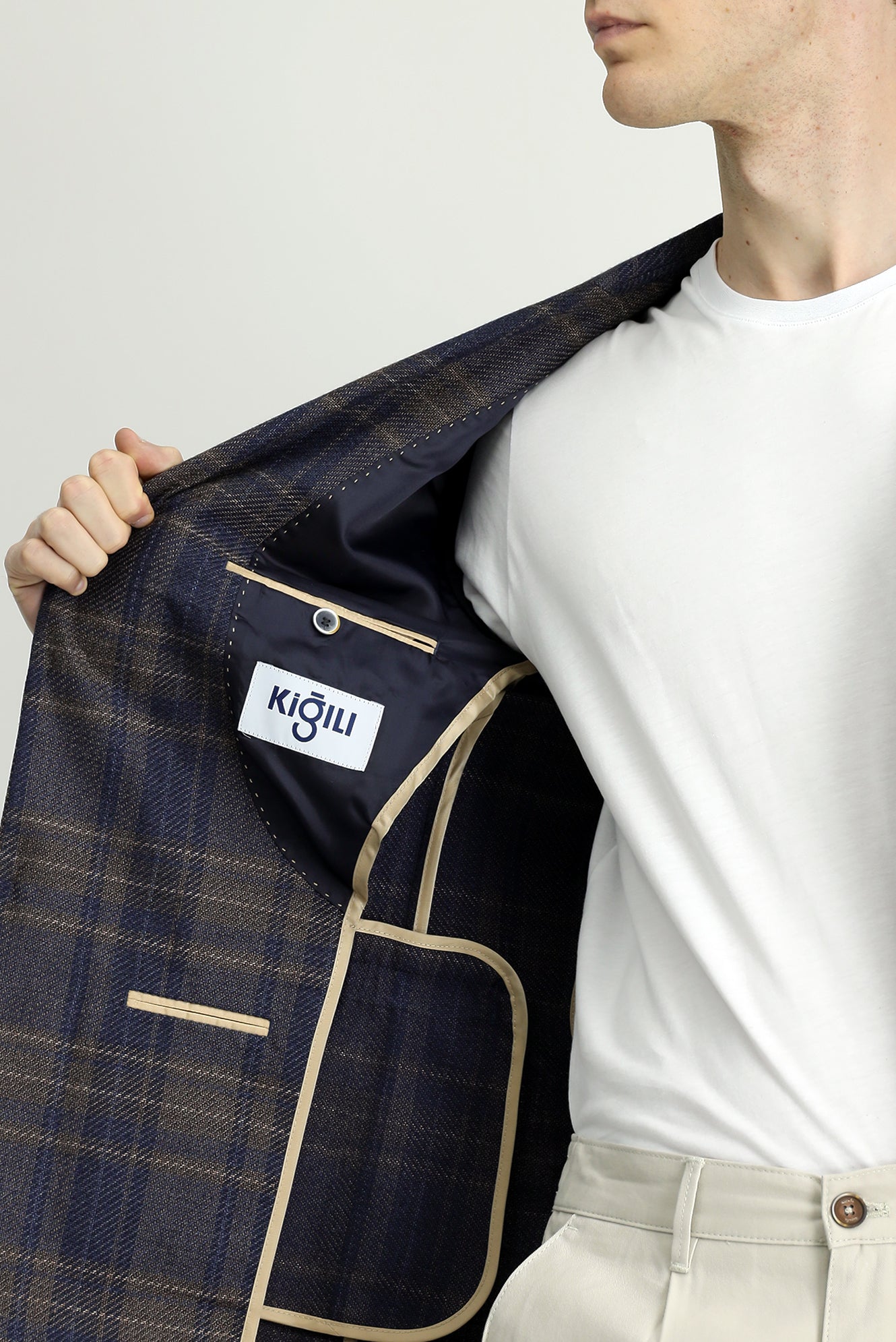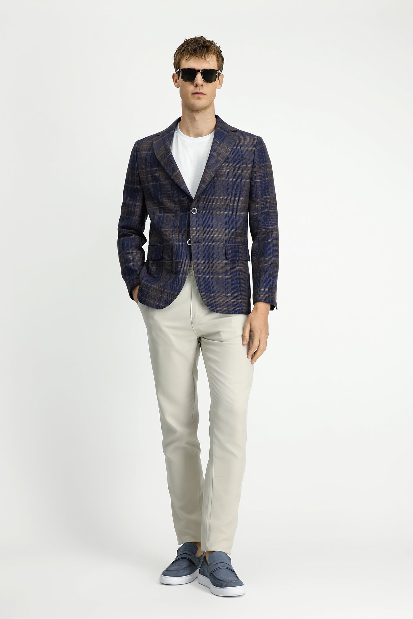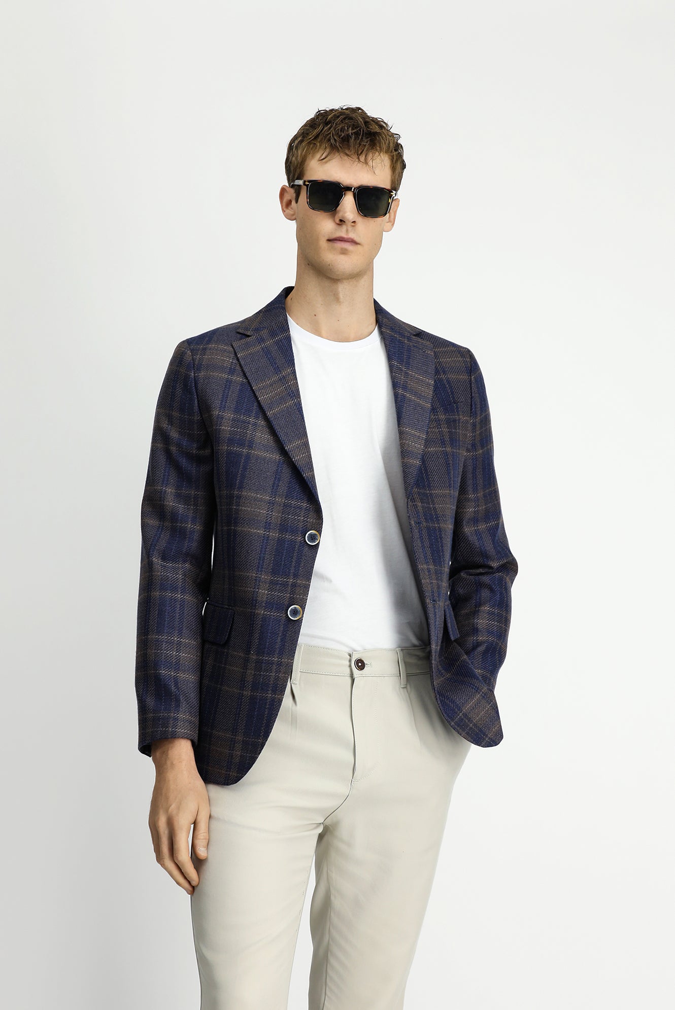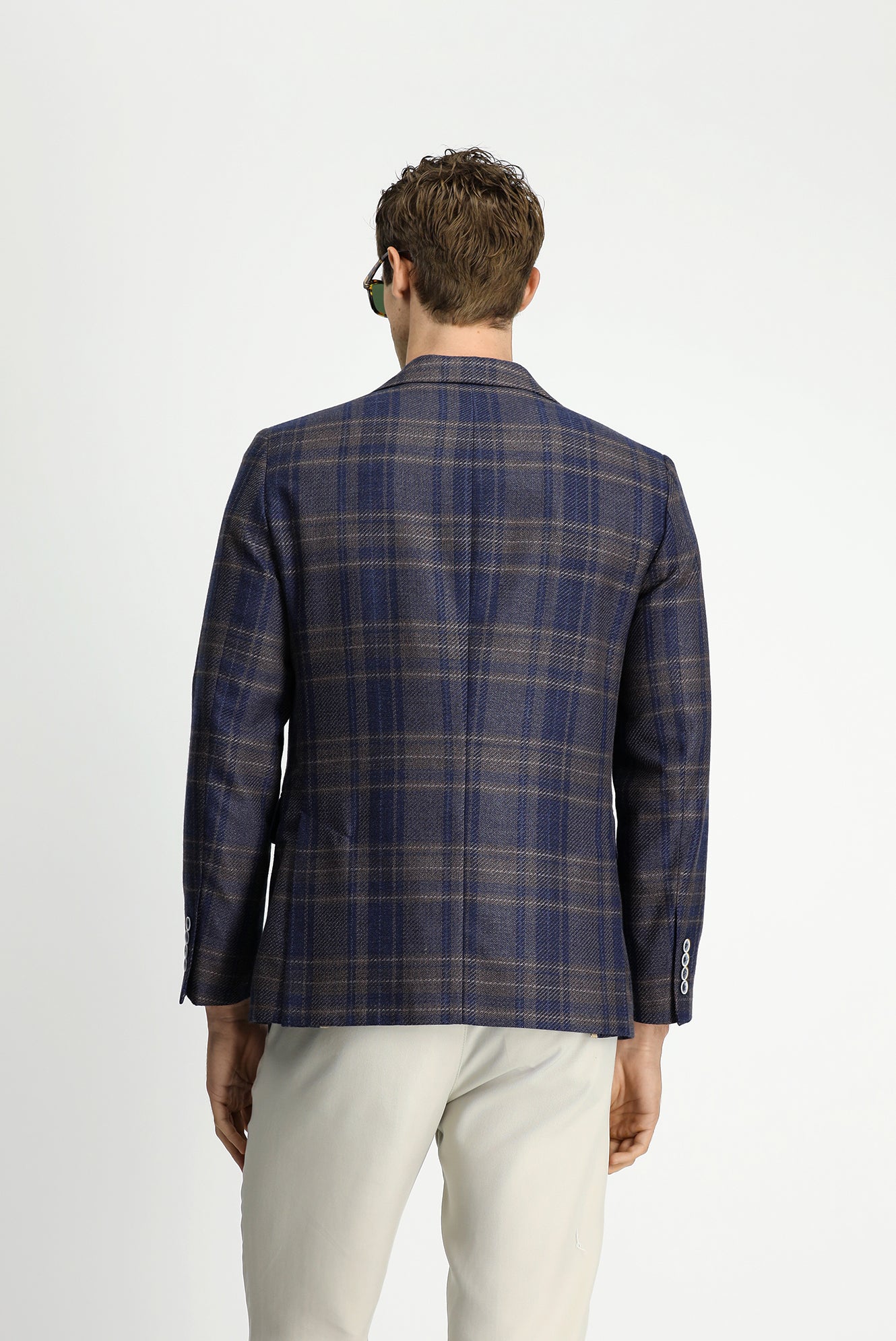 Koyu Lacivert Regular Fit Ekose Yünlü Ceket