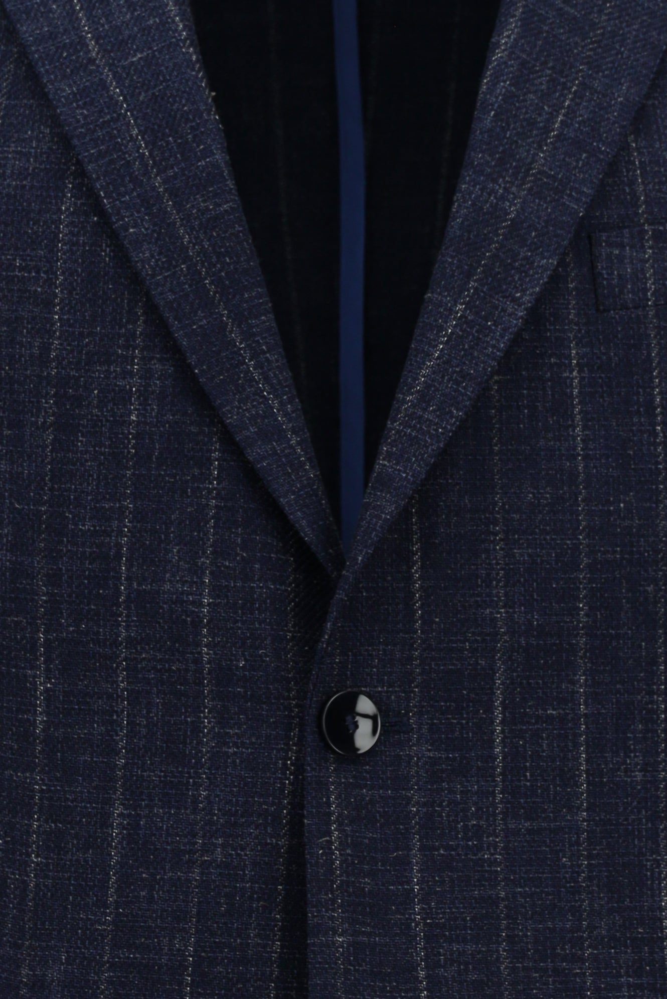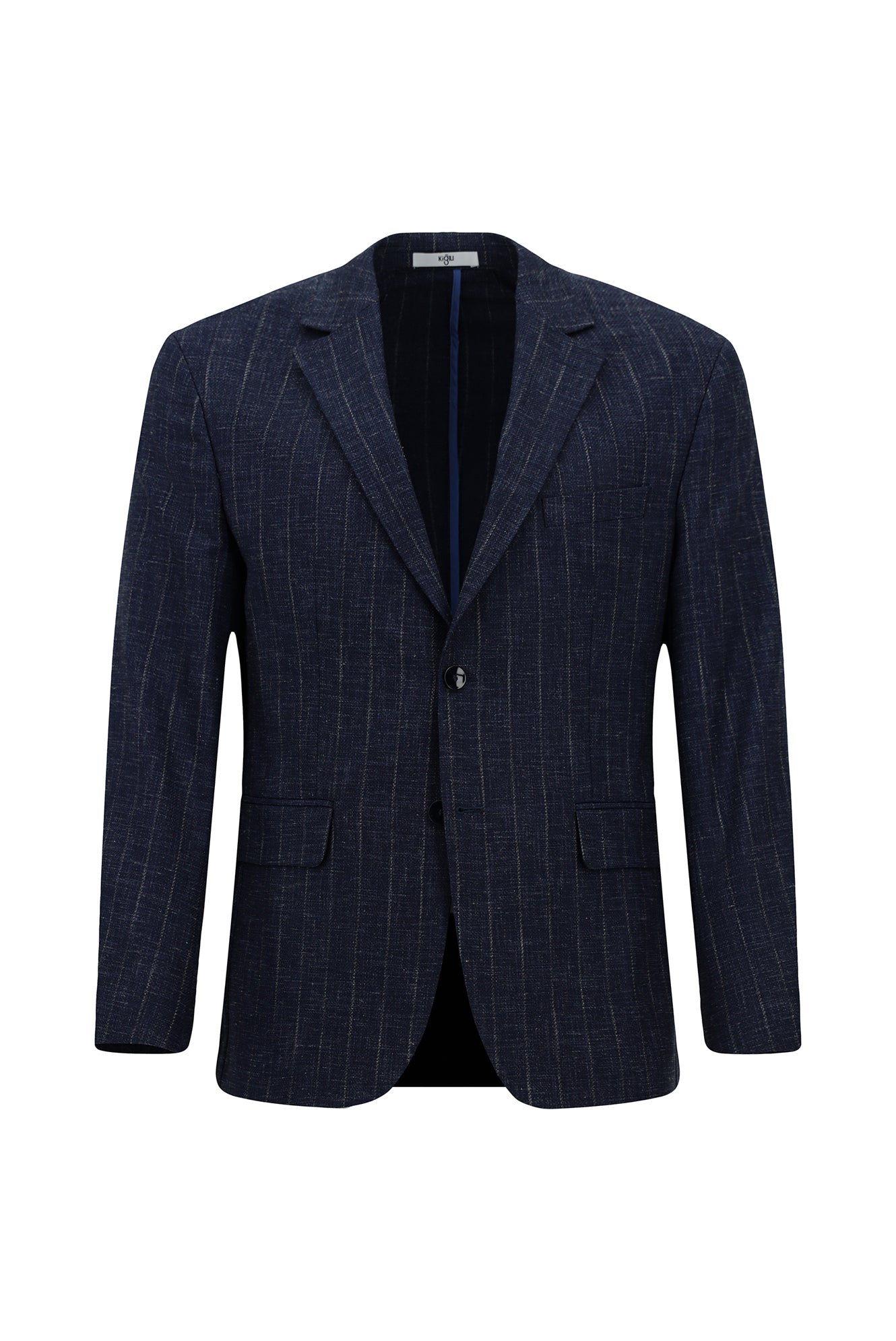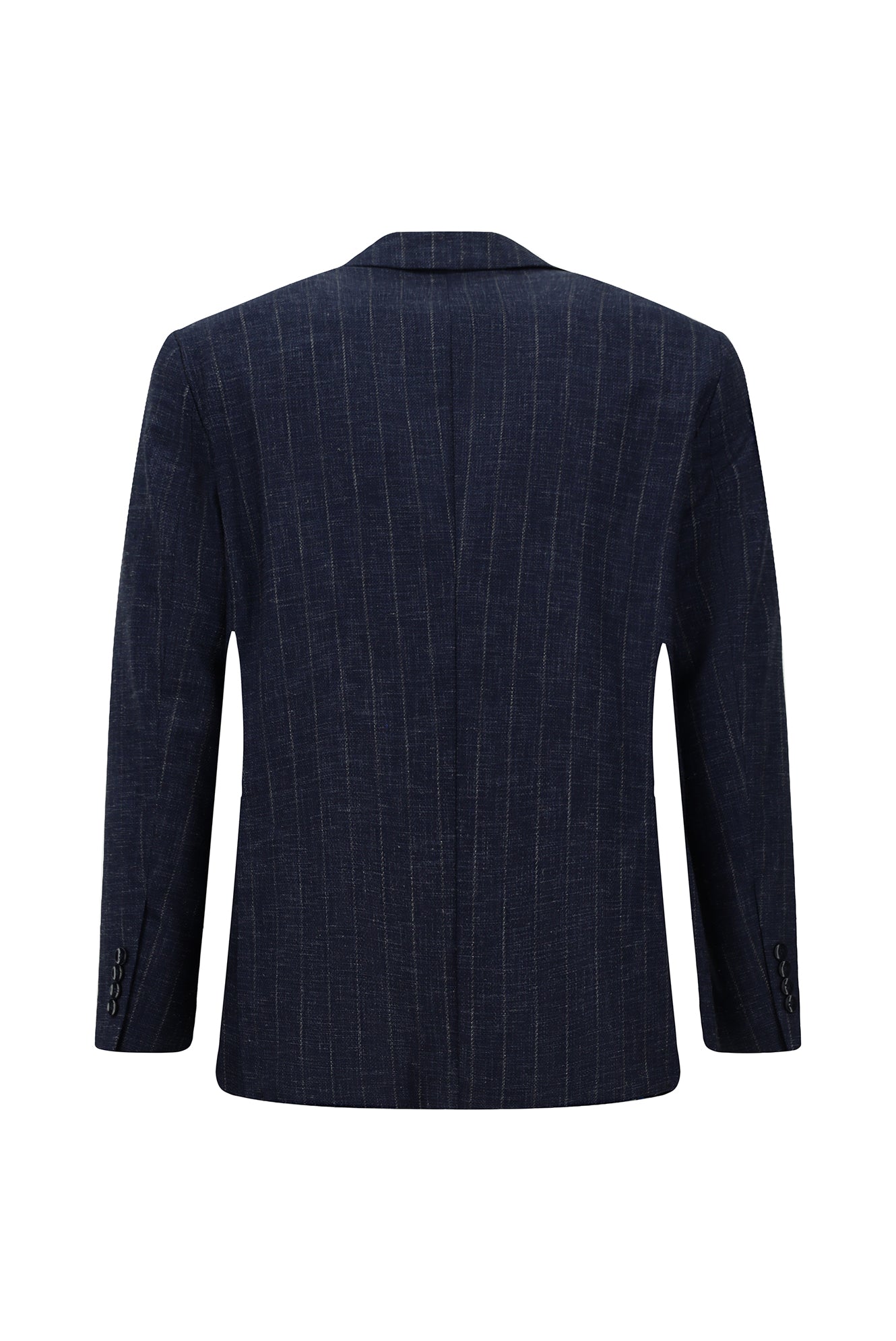 Koyu Lacivert Relaxed Fit Rahat Kesim Keten Karışımlı Çizgili Klasik Ceket