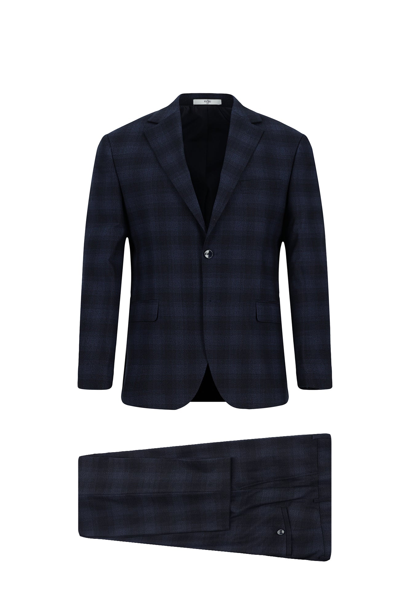 Koyu Lacivert Slim Fit Dar Kesim Ekose Klasik Takım Elbise