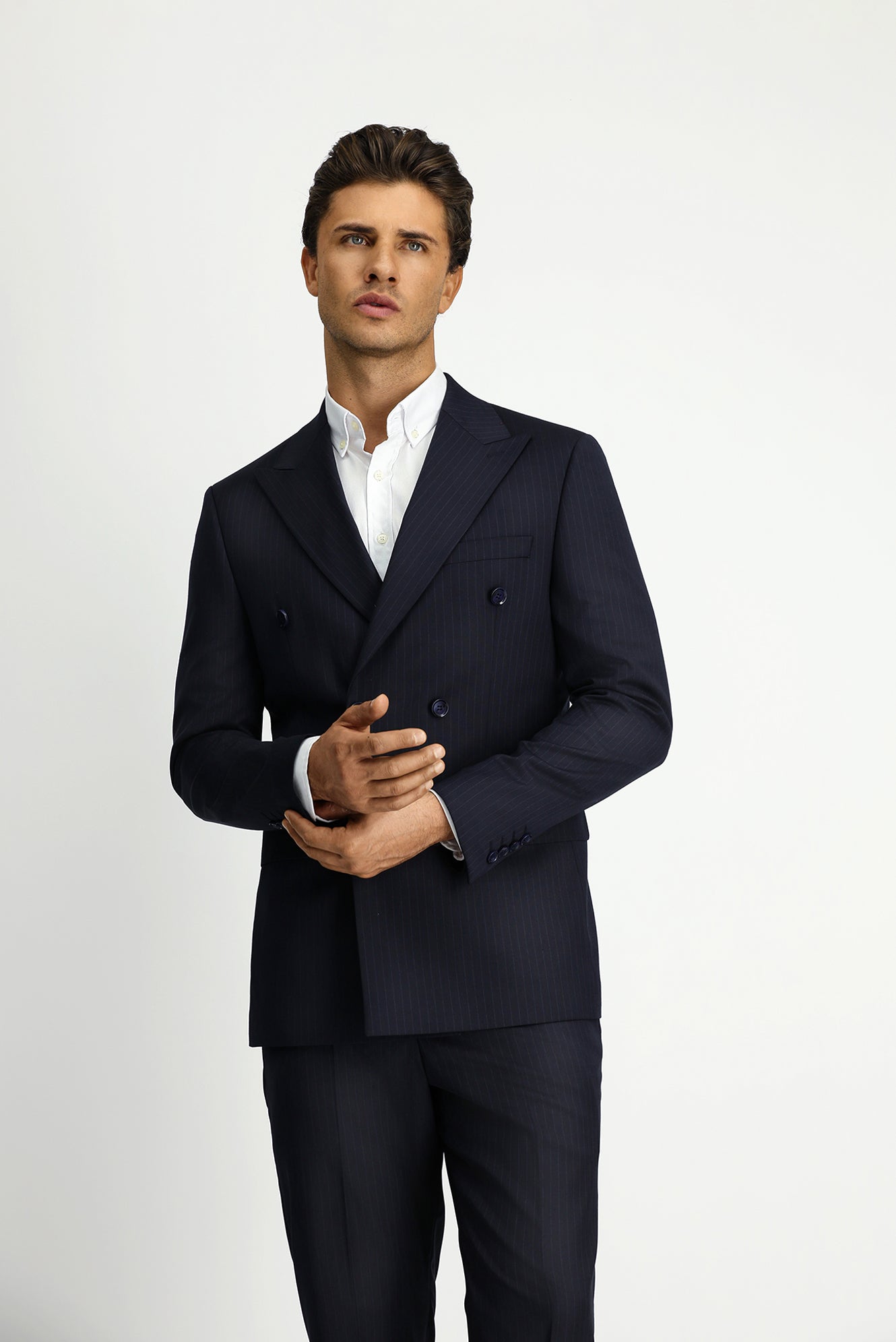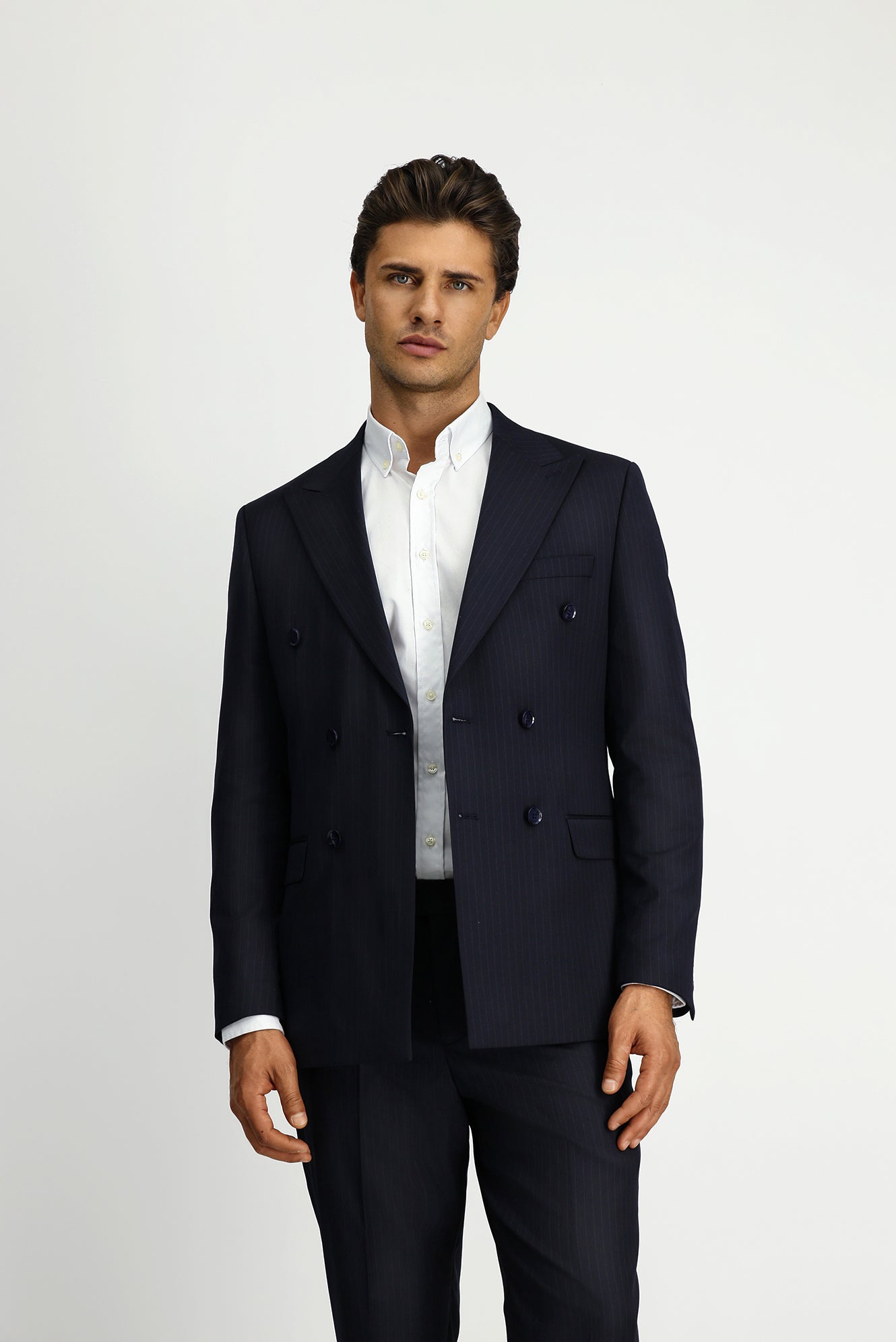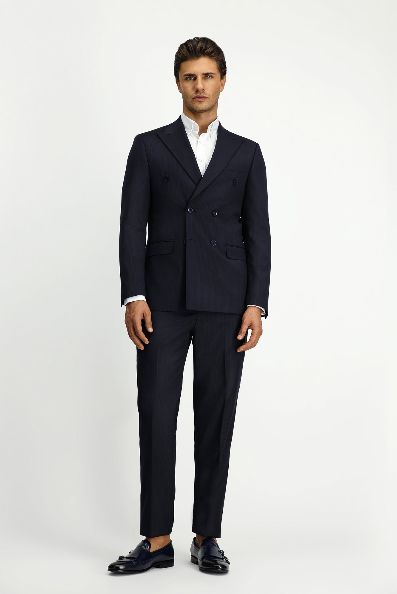 Koyu Lacivert Regular Fit Yünlü Çizgili Kruvaze Takım Elbise