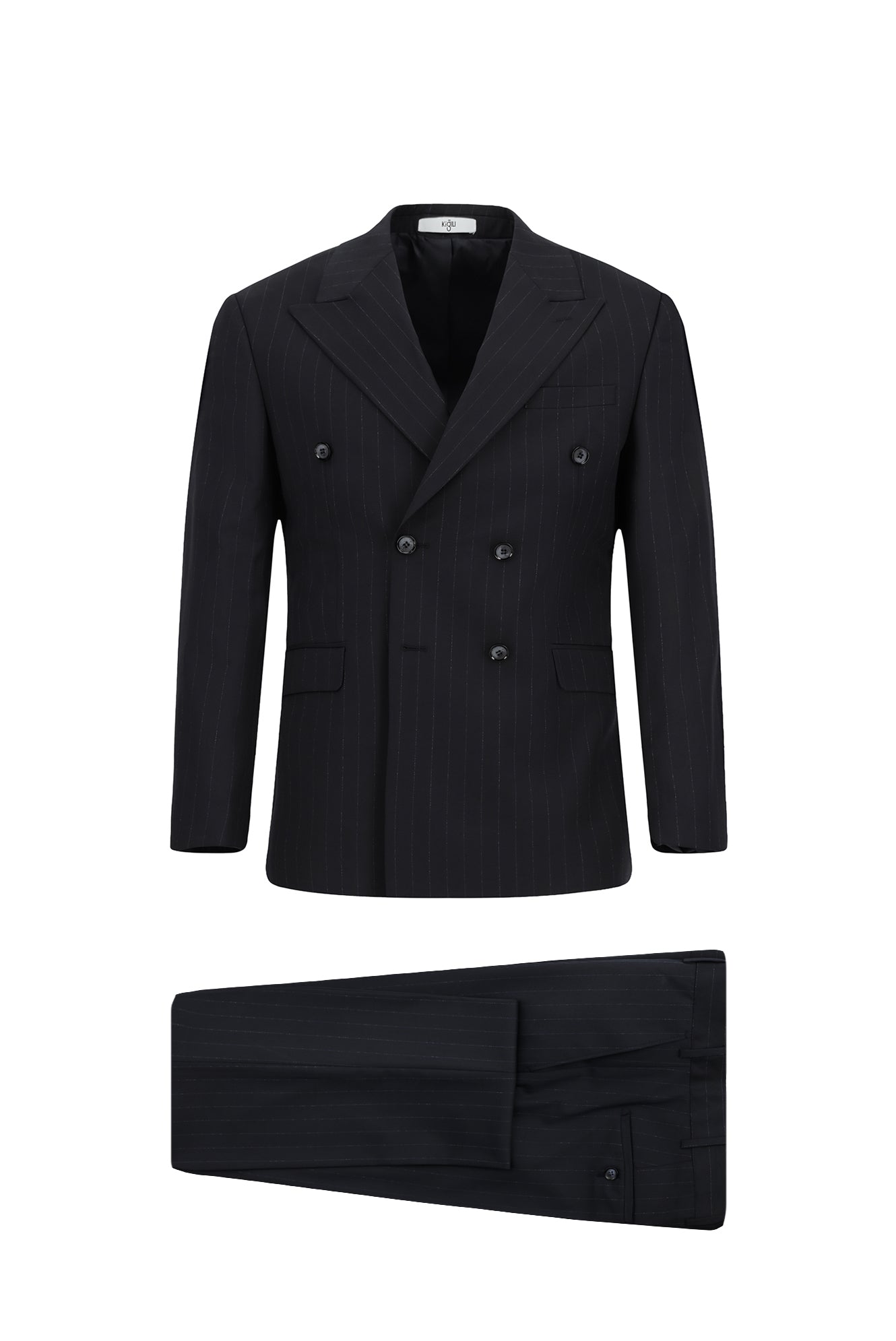 Koyu Lacivert Regular Fit Çizgili Yünlü Kruvaze Takım Elbise