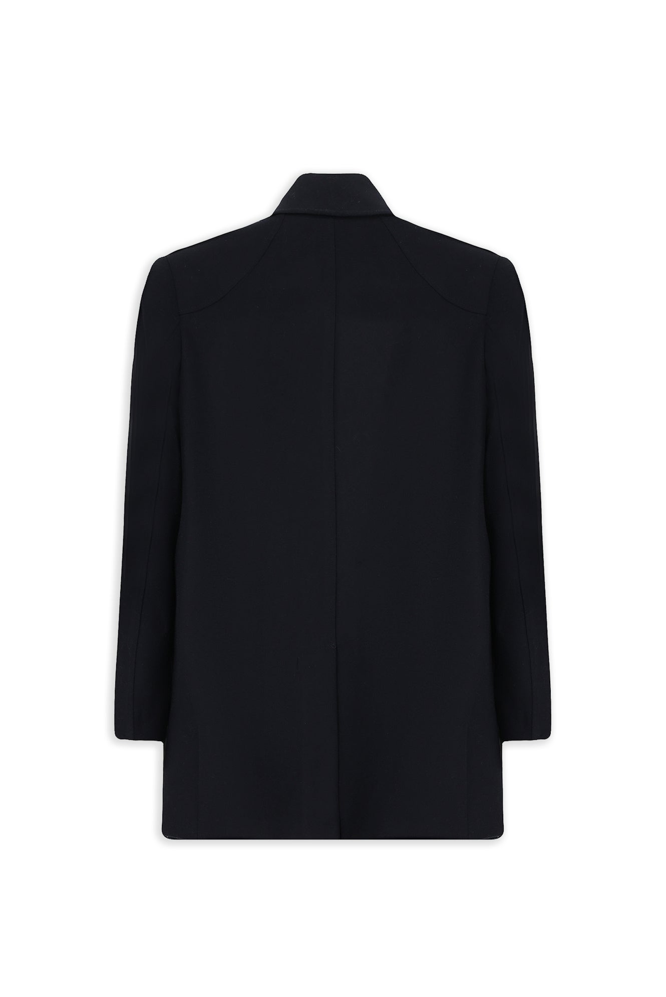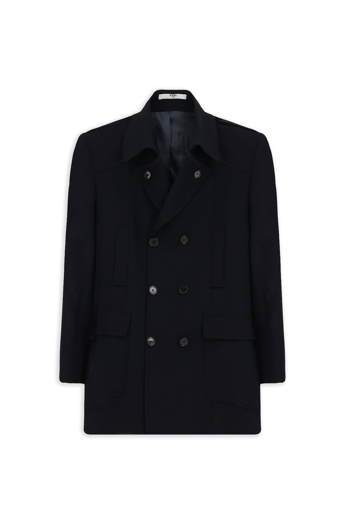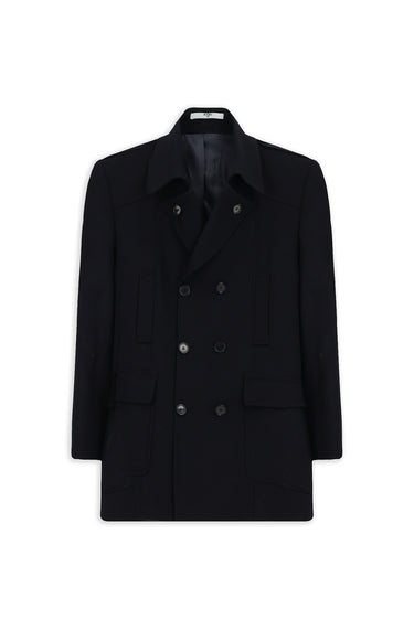 Koyu Lacivert Yünlü Cepli Düğmeli Kruvaze Palto