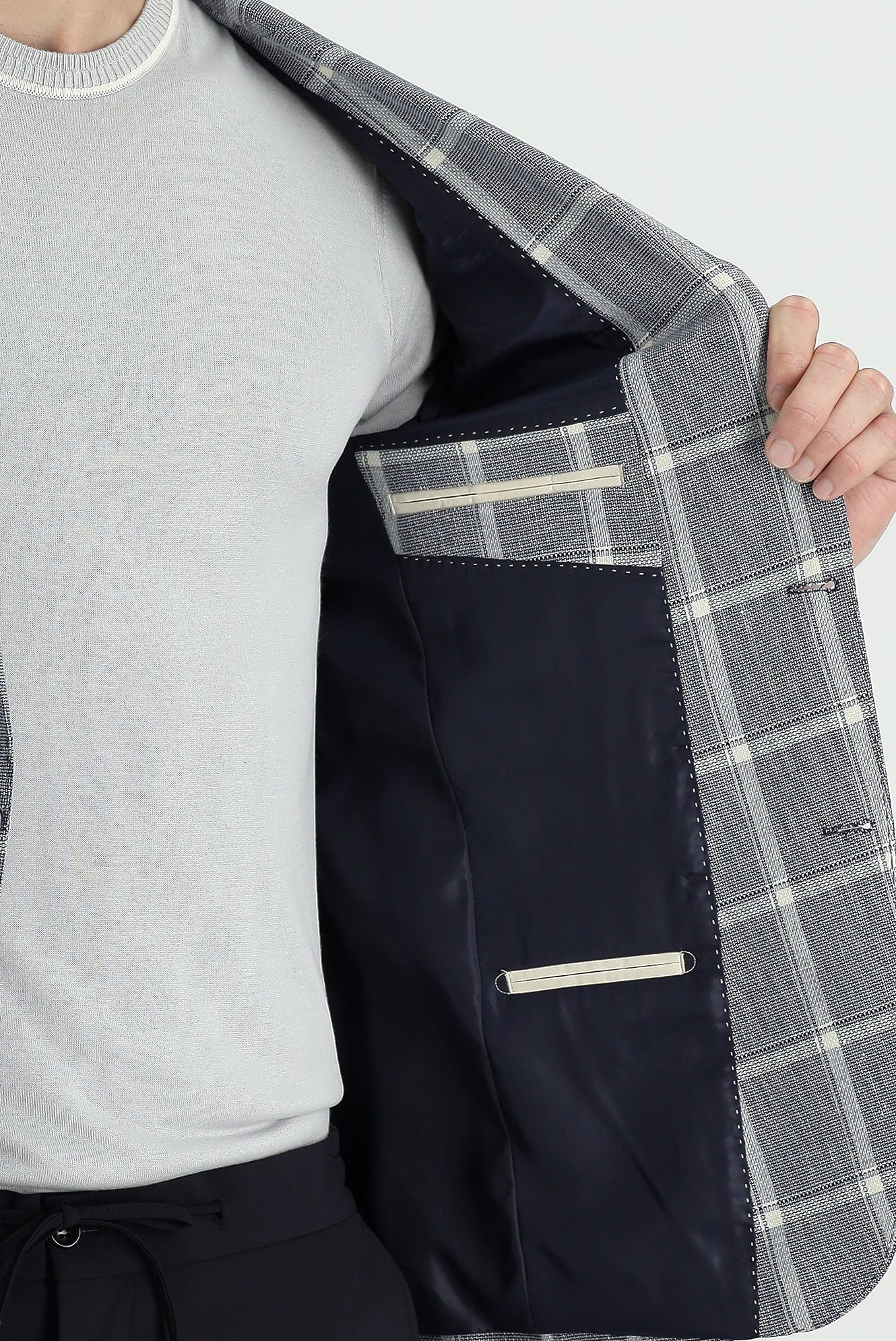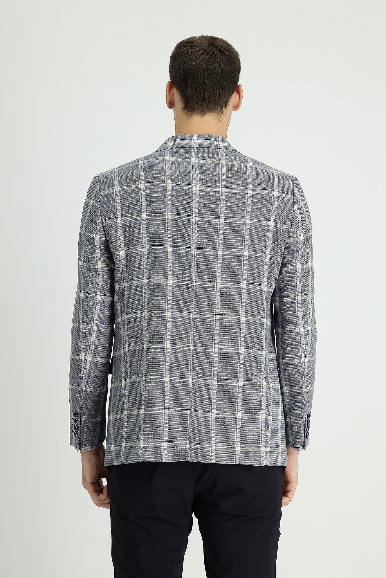 Koyu Lacivert Relaxed Fit Rahat Kesim Ekose Keten Karışımlı Ceket