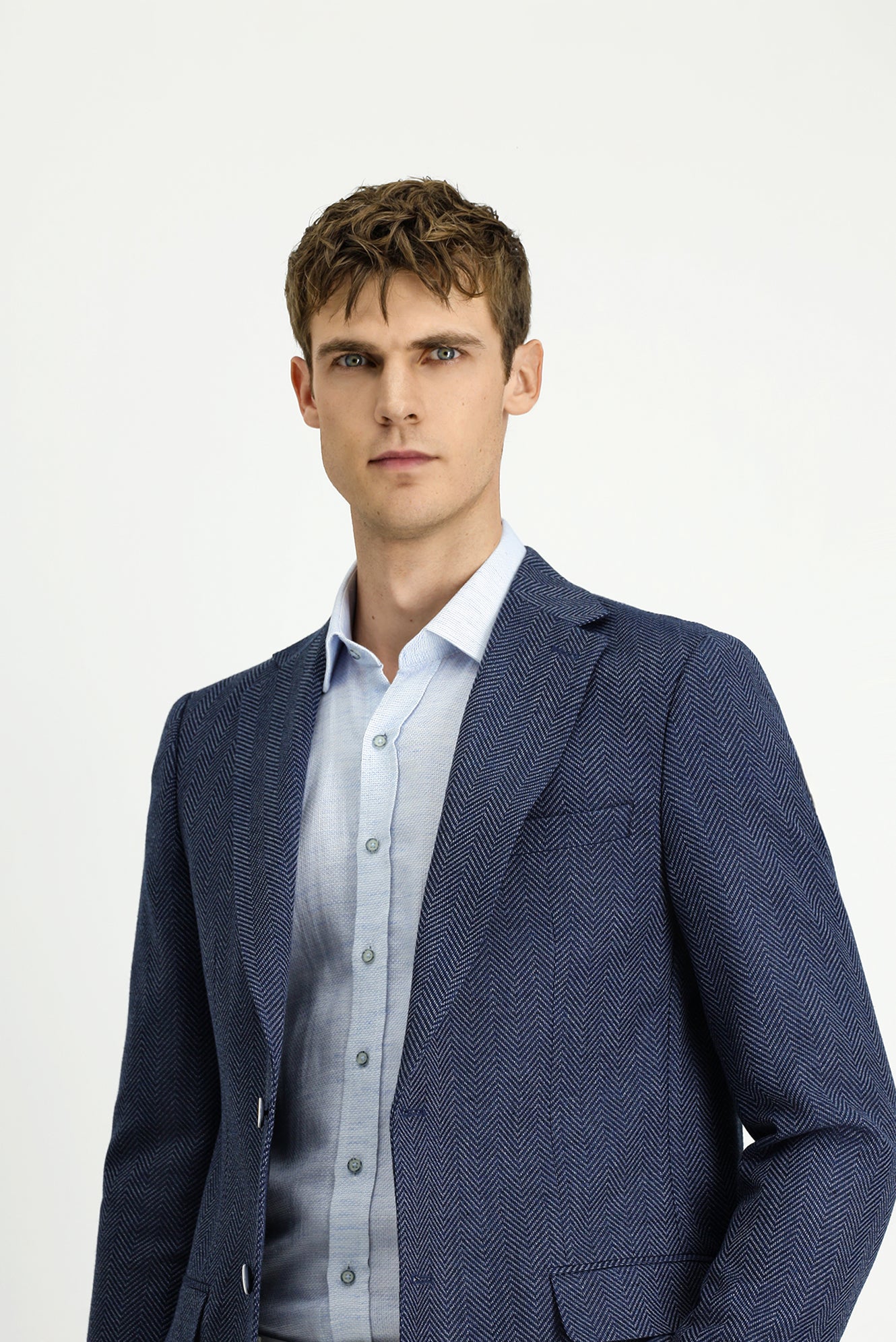 Koyu Lacivert Relaxed Fit Rahat Kesim Yünlü Desenli Ceket