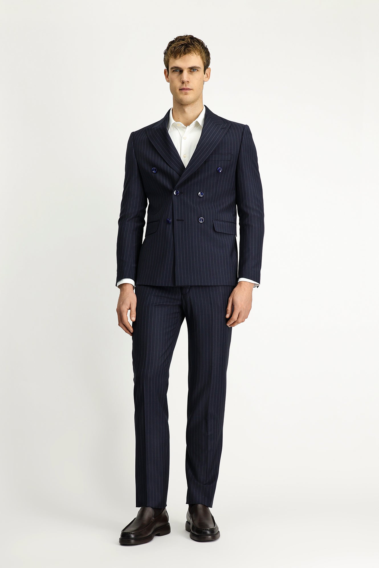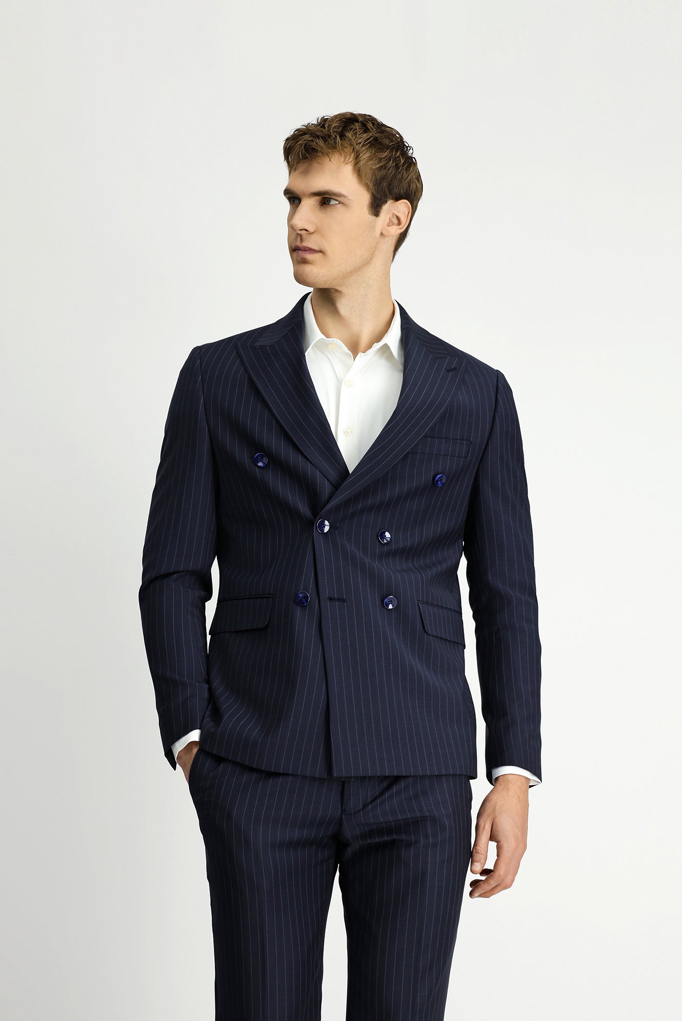 Koyu Lacivert 7 Drop Slim Fit Dar Kesim Çizgili Yünlü Beli Lastikli Kruvaze Takım Elbise