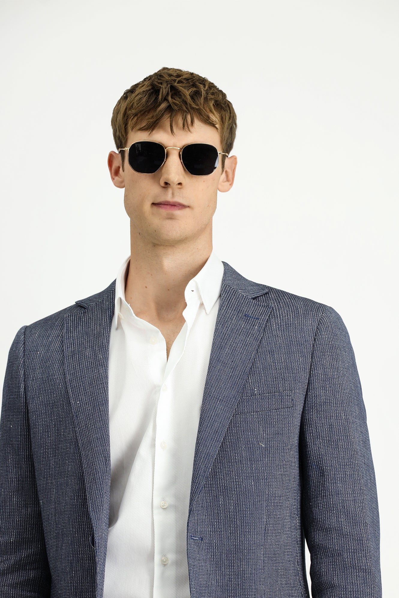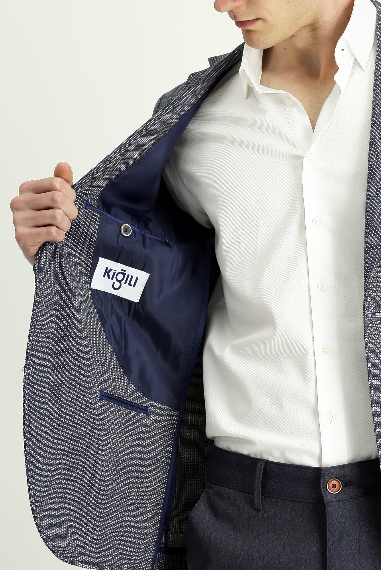 Koyu Lacivert Slim Fit Dar Kesim Keten Karışımlı Çizgili Spor Ceket