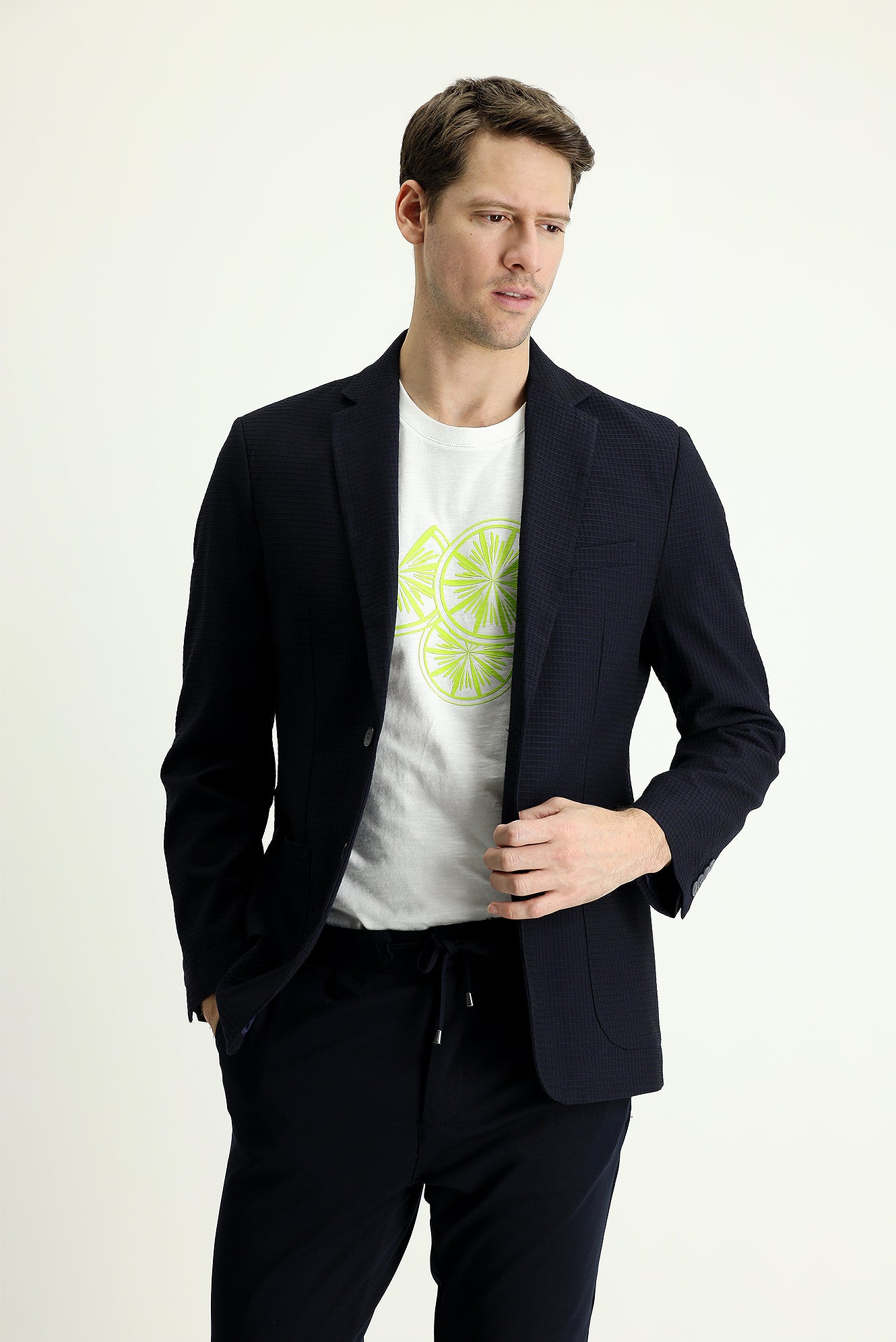 Koyu Lacivert Slim Fit Dar Kesim Klasik Kareli Ceket