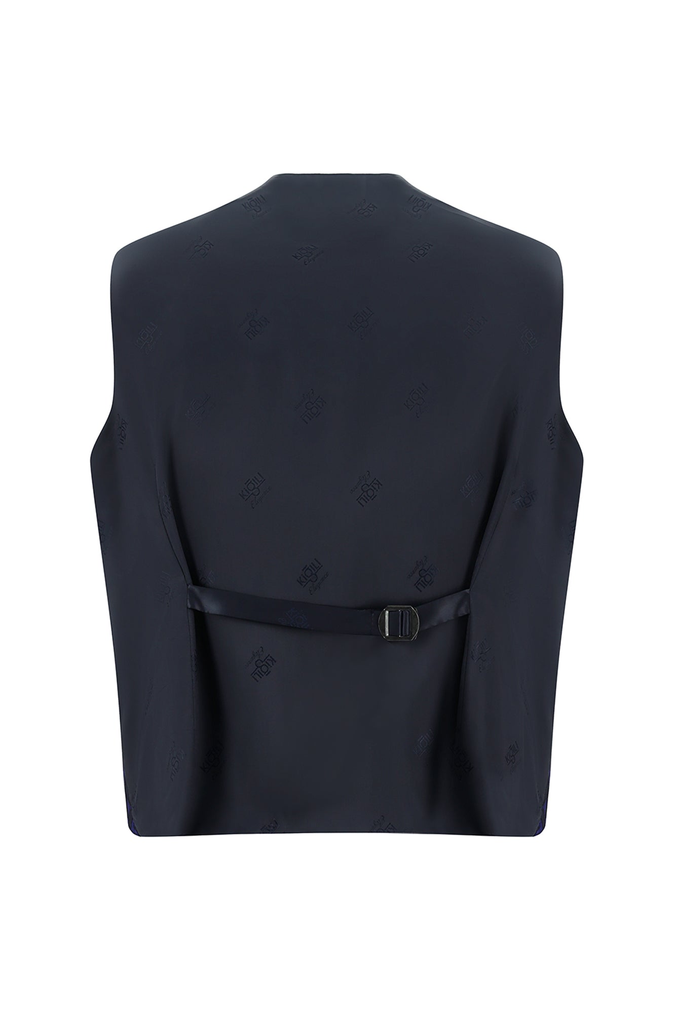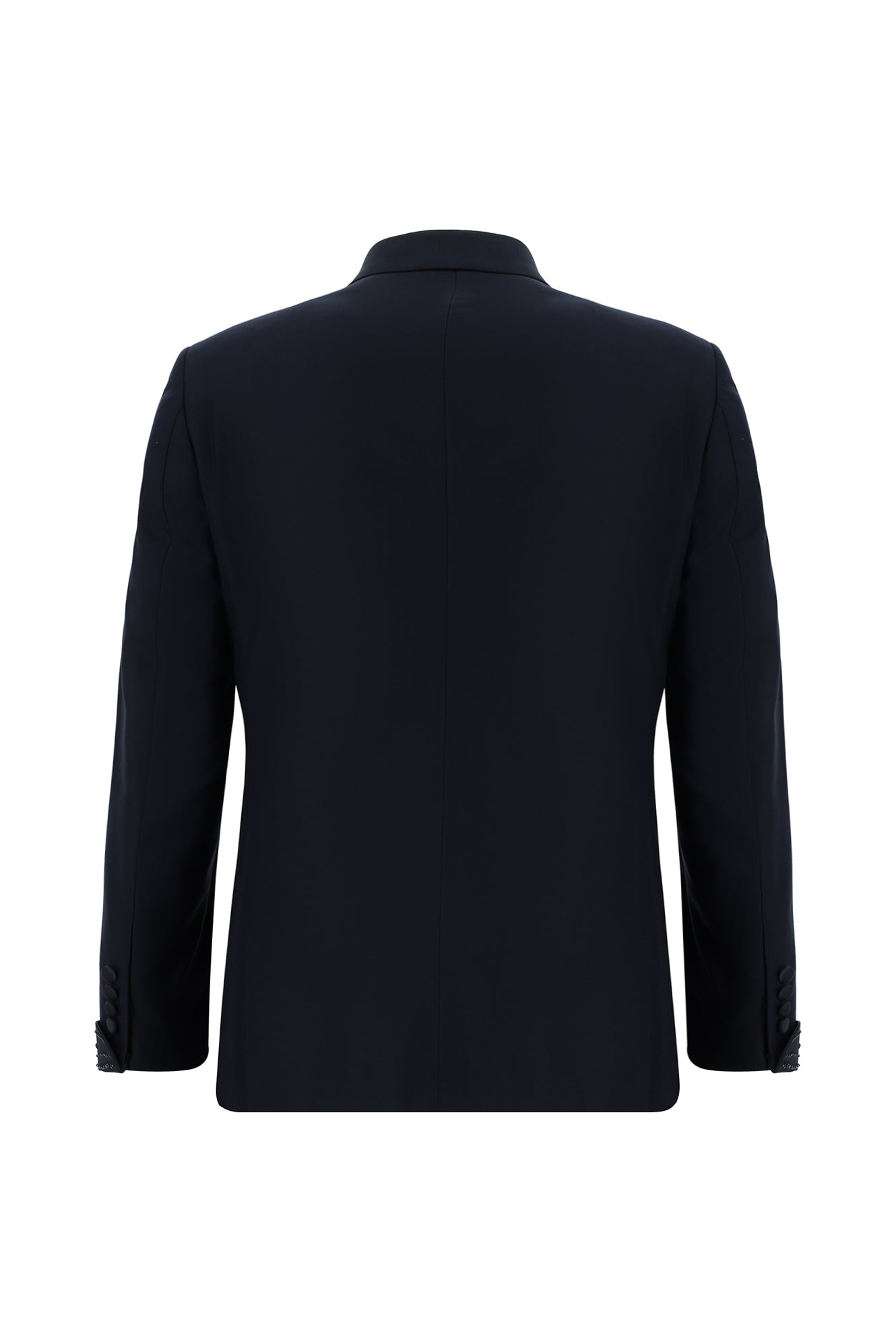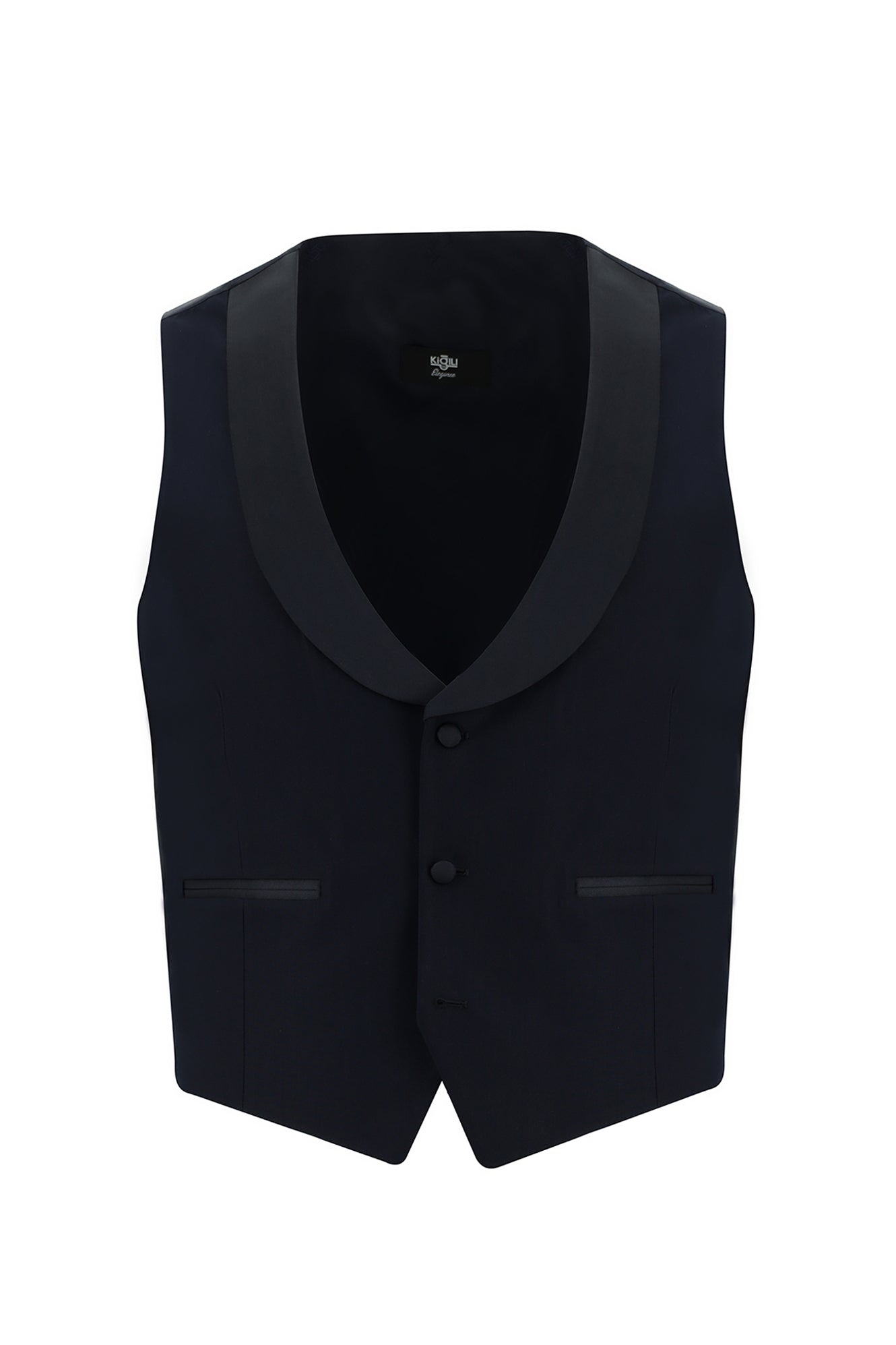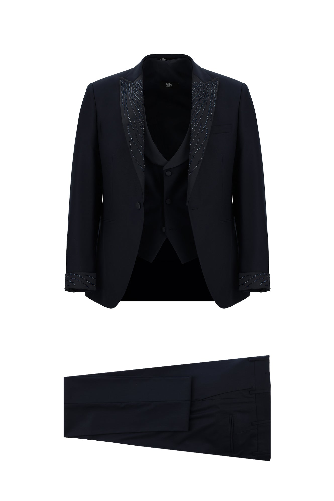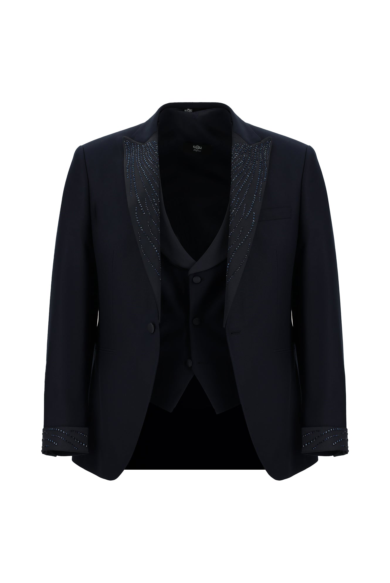 Koyu Lacivert Slim Fit Dar Kesim Sivri Yaka Yelekli Smokin & Damatlık