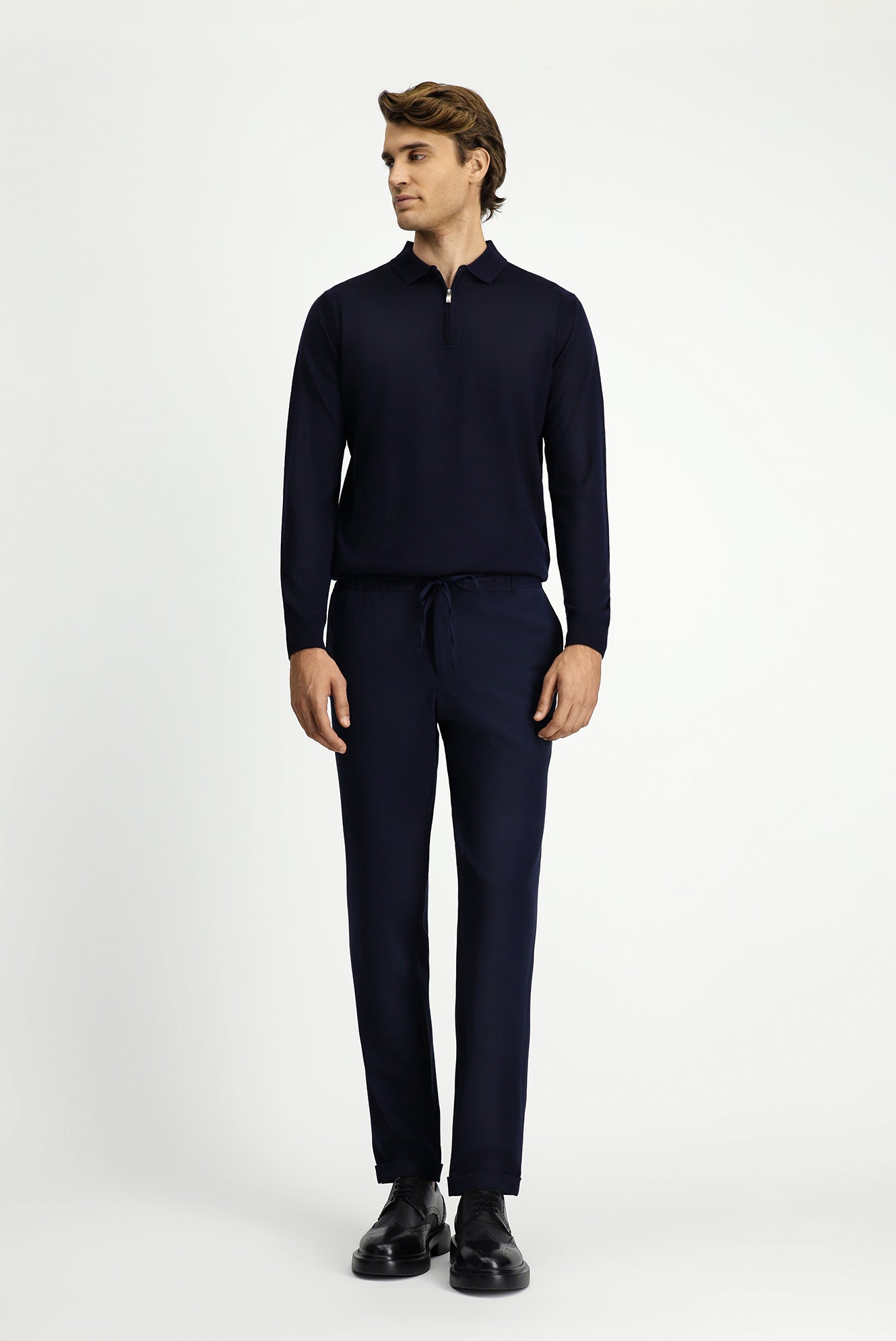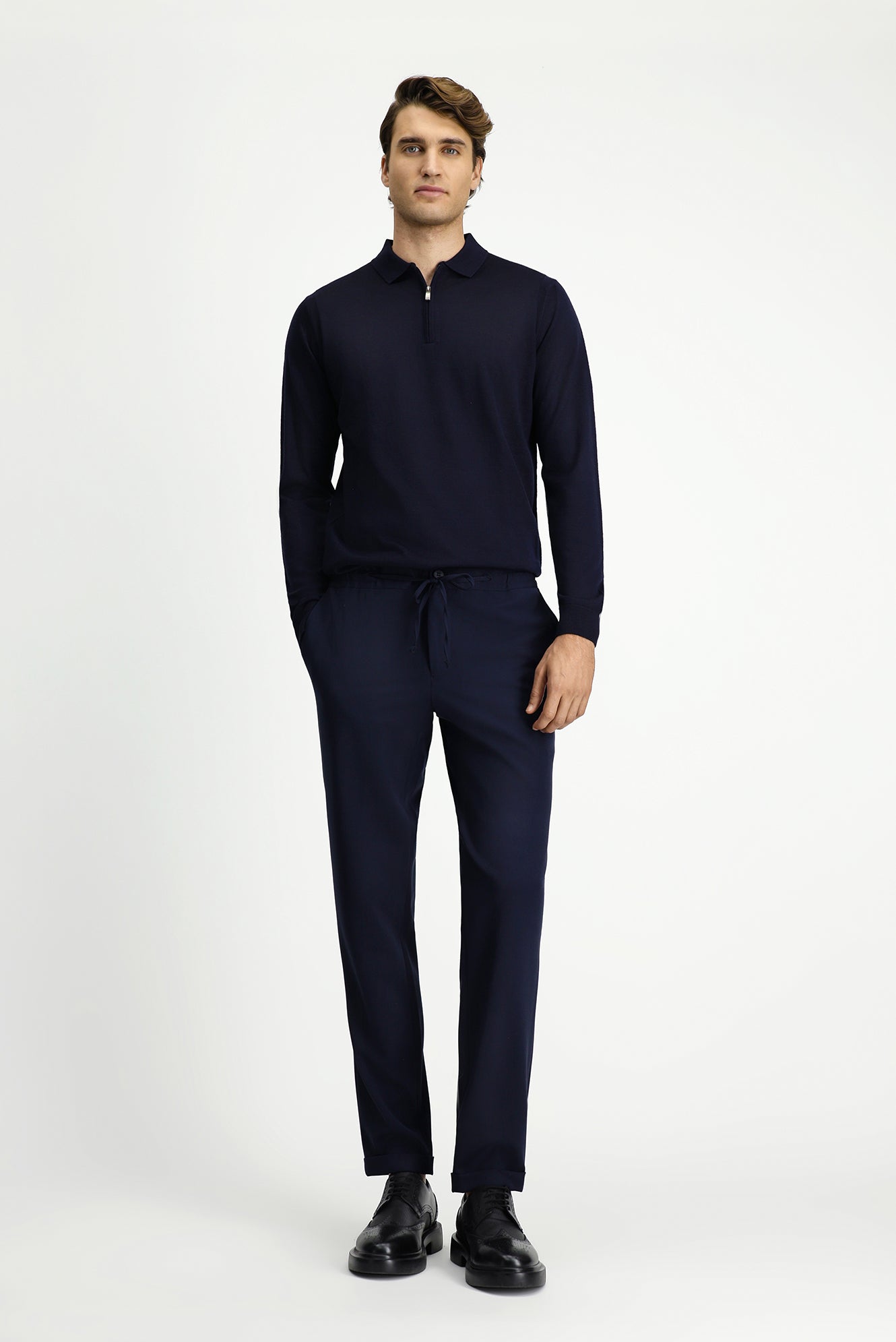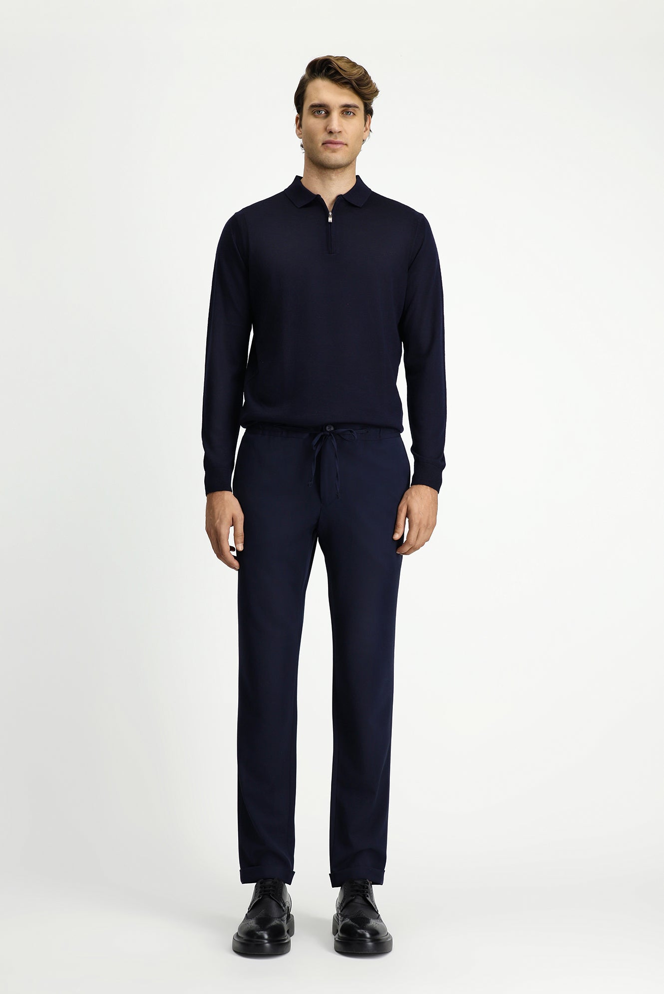 Koyu Lacivert Slim Fit Dar Kesim Likralı Beli Lastikli İpli Klasik Kumaş Pantolon