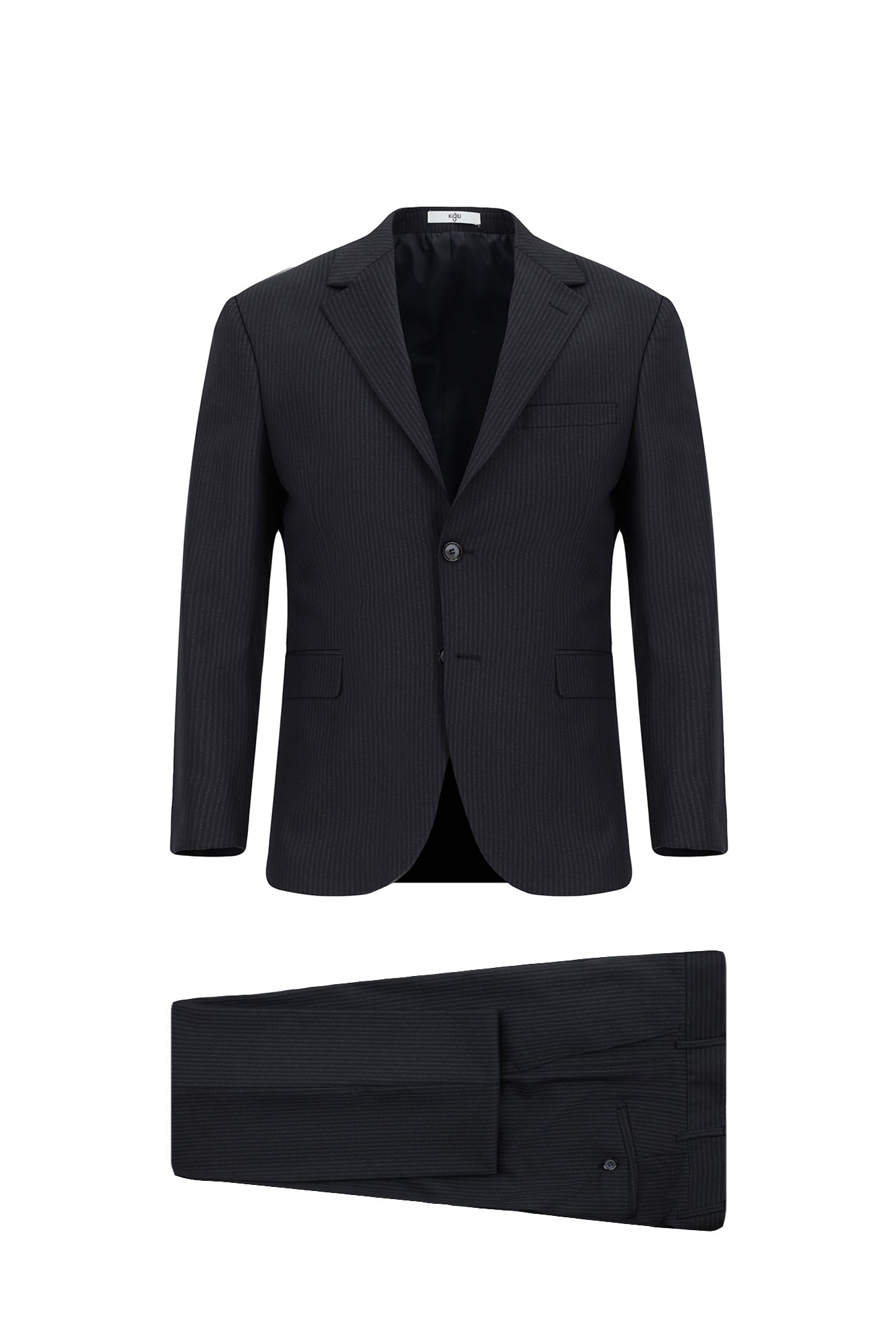 Koyu Lacivert Slim Fit Dar Kesim Yünlü Çizgili Klasik Takım Elbise