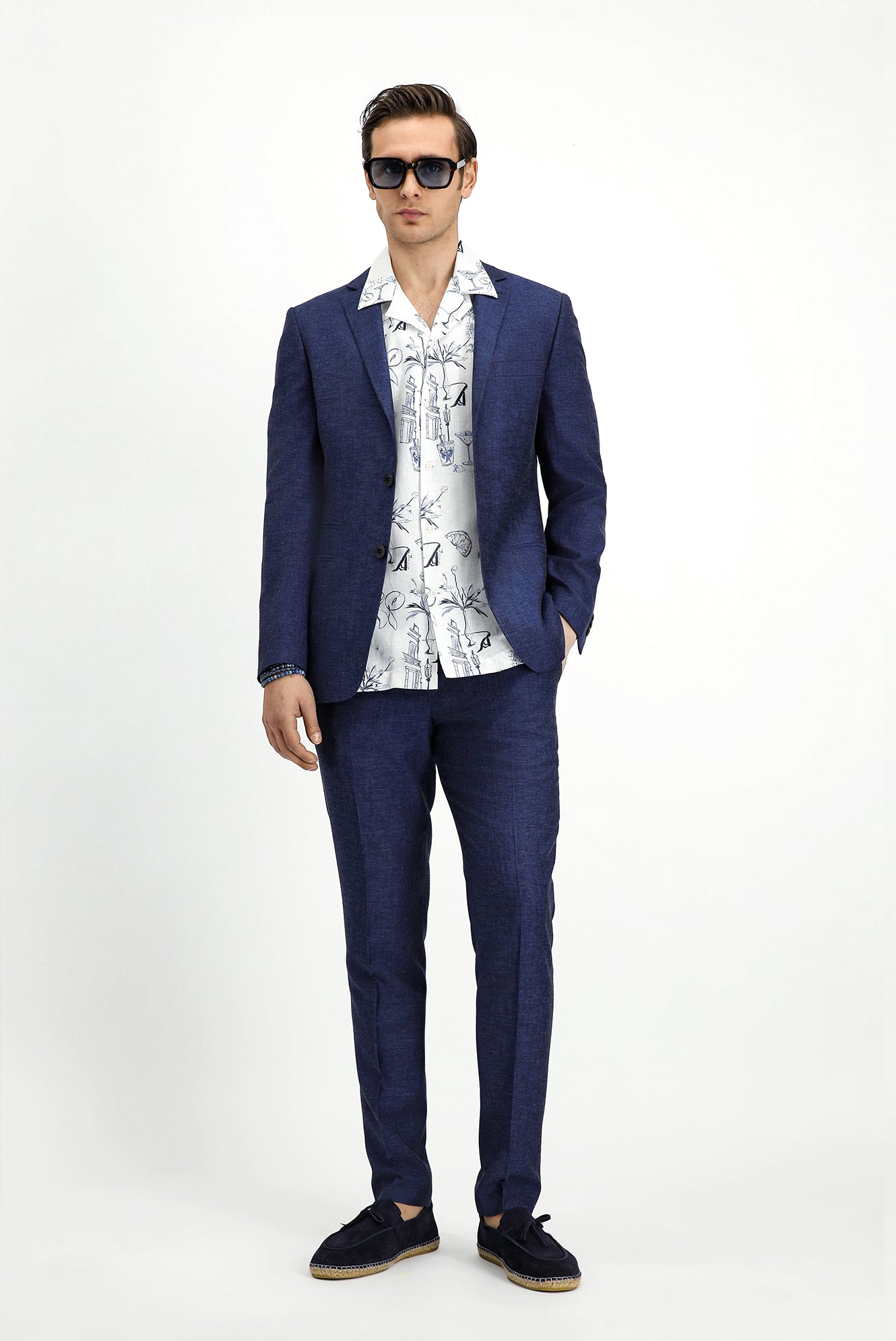 Koyu Lacivert 7 Drop Super Slim Fit Eksra Dar Kesim Beli Lastikli İpli Çizgili Ketenli Takım Elbise