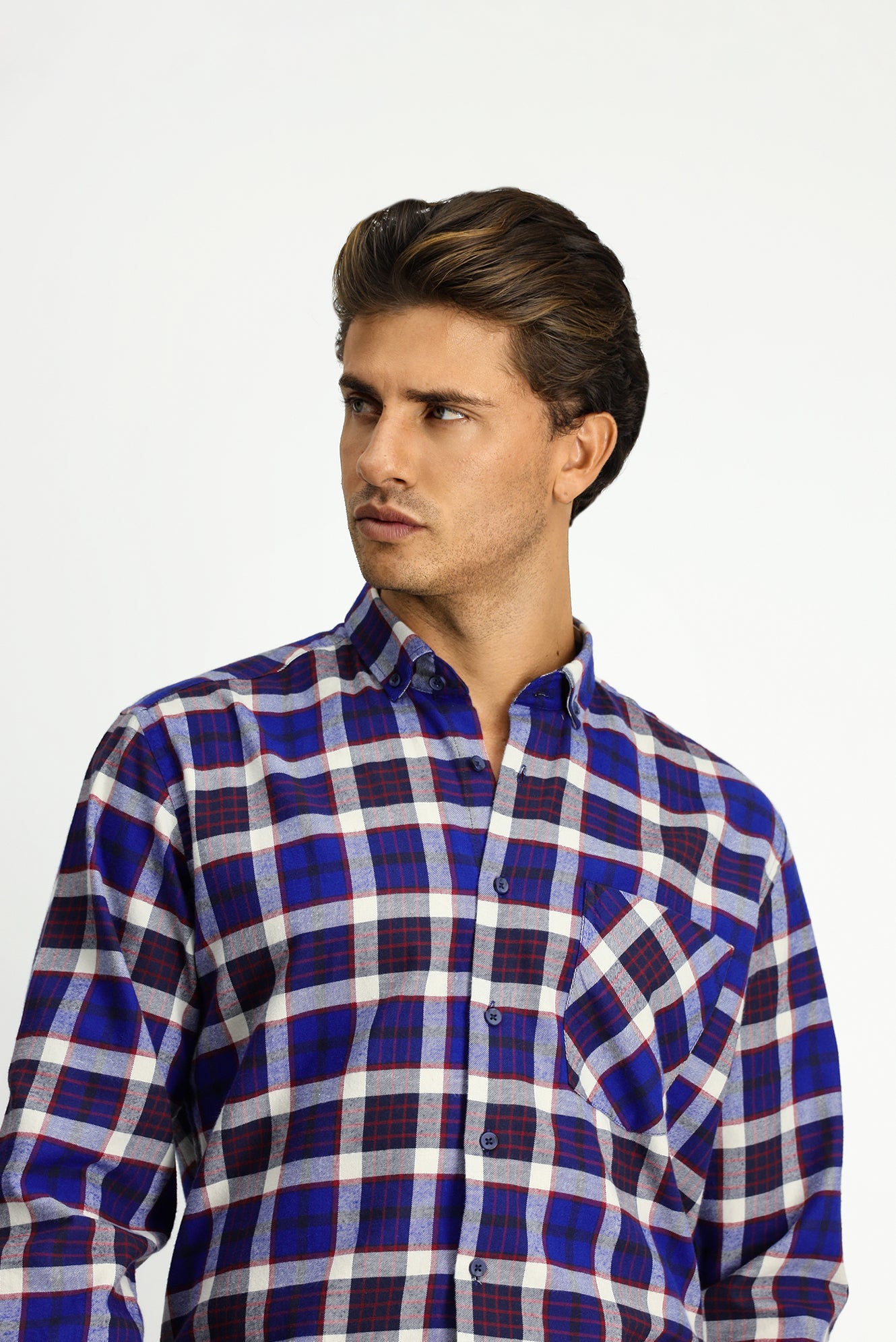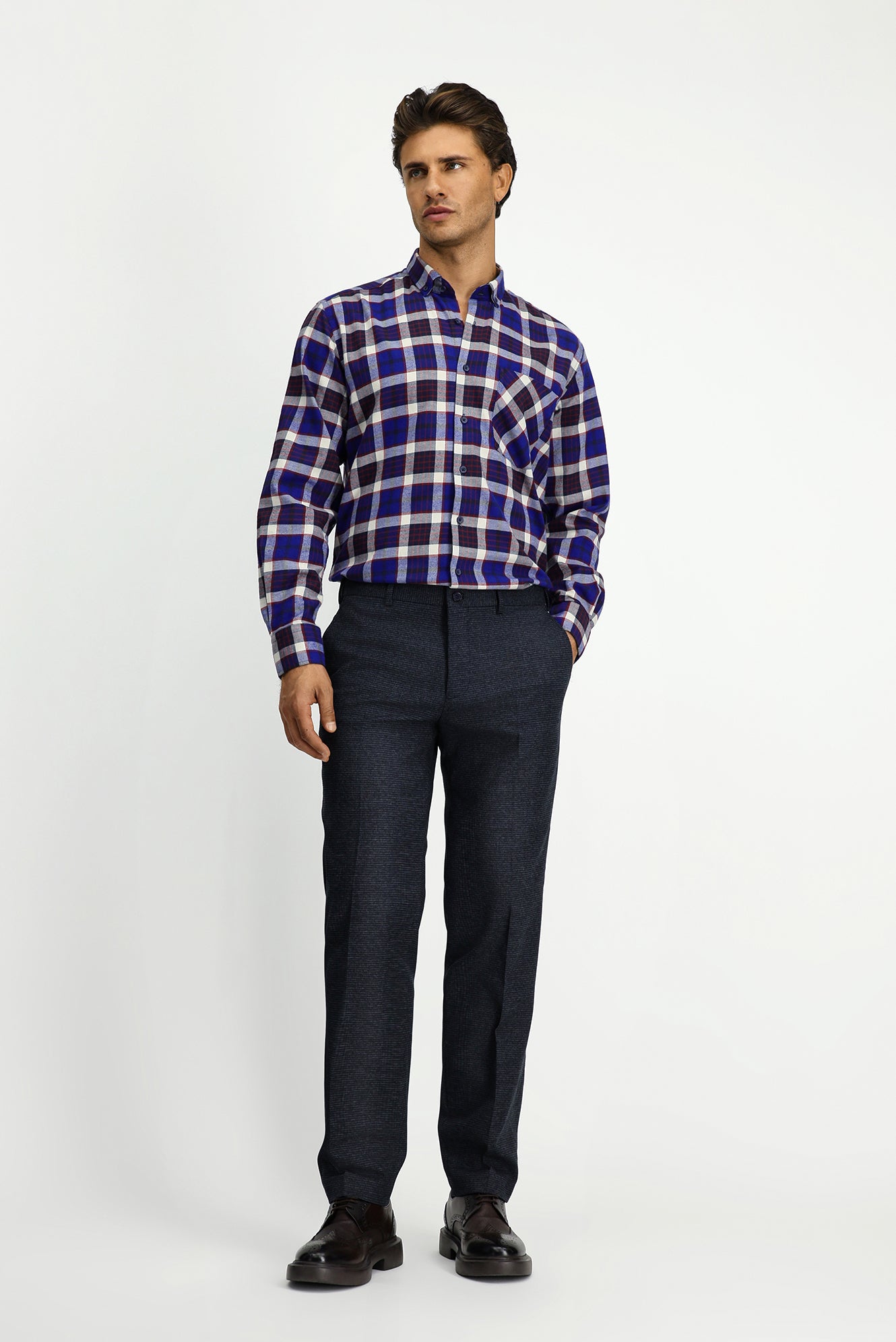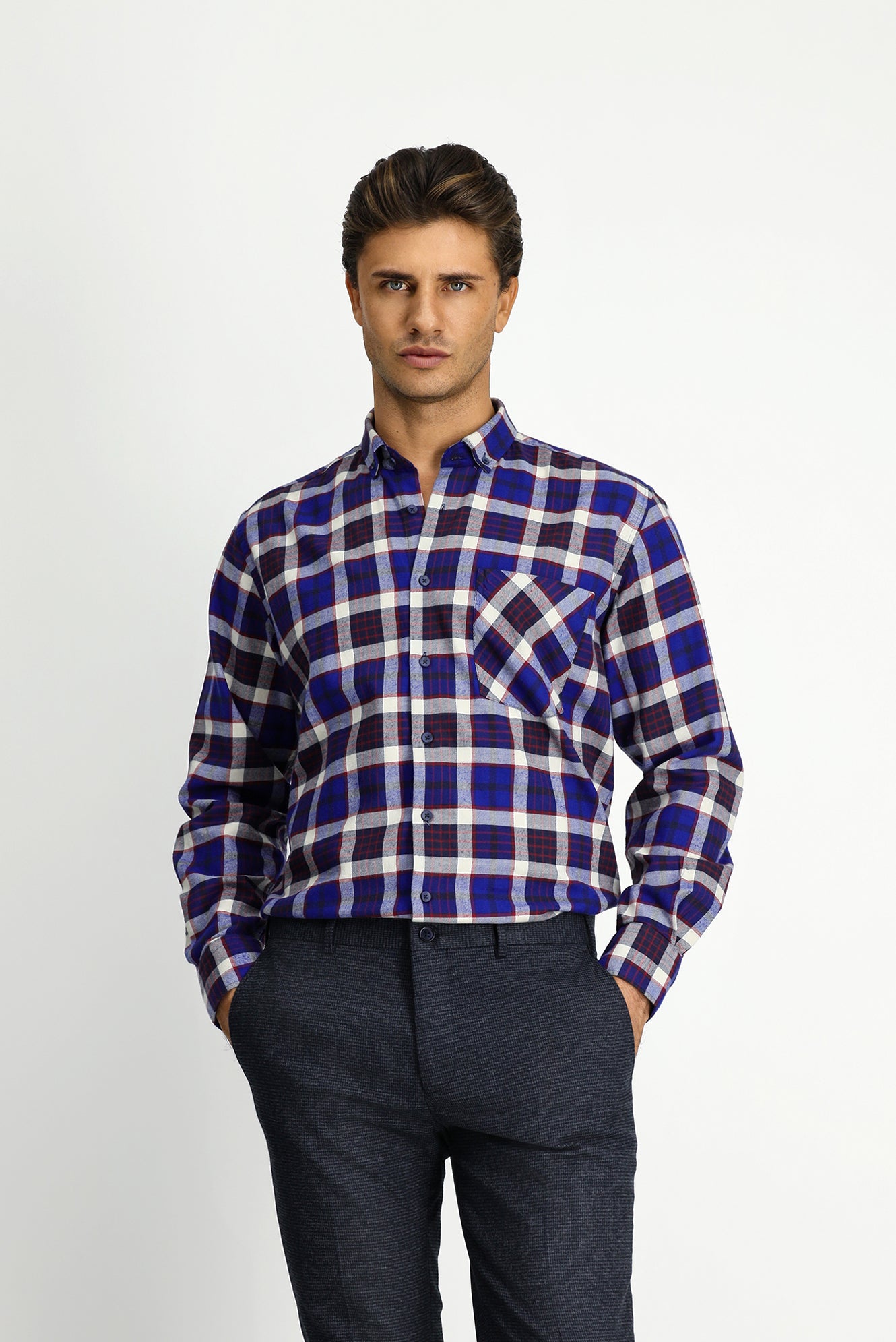 Koyu Lacivert Uzun Kol Regular Fit Ekose Cepli Düğmeli Yaka Pamuk Gömlek