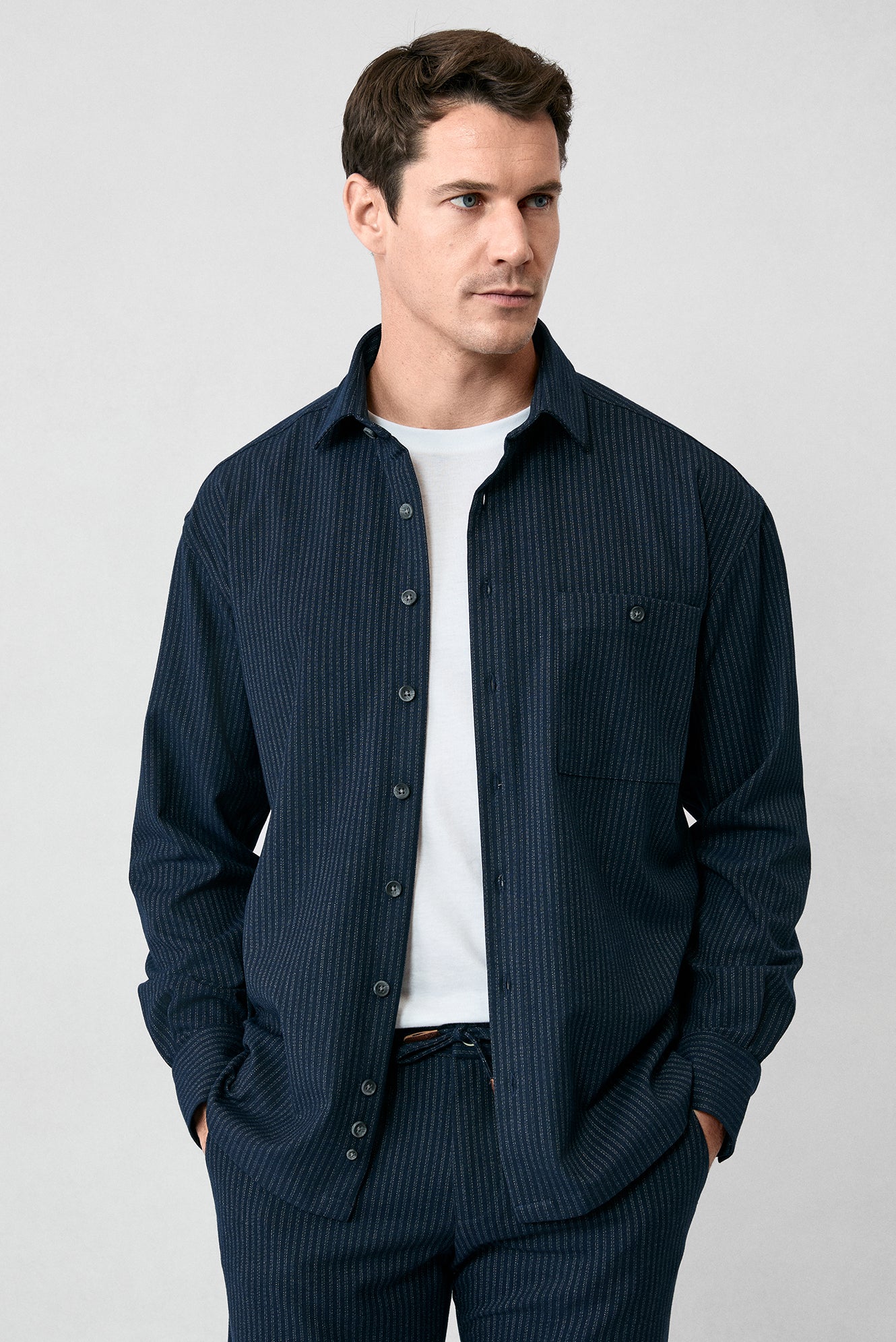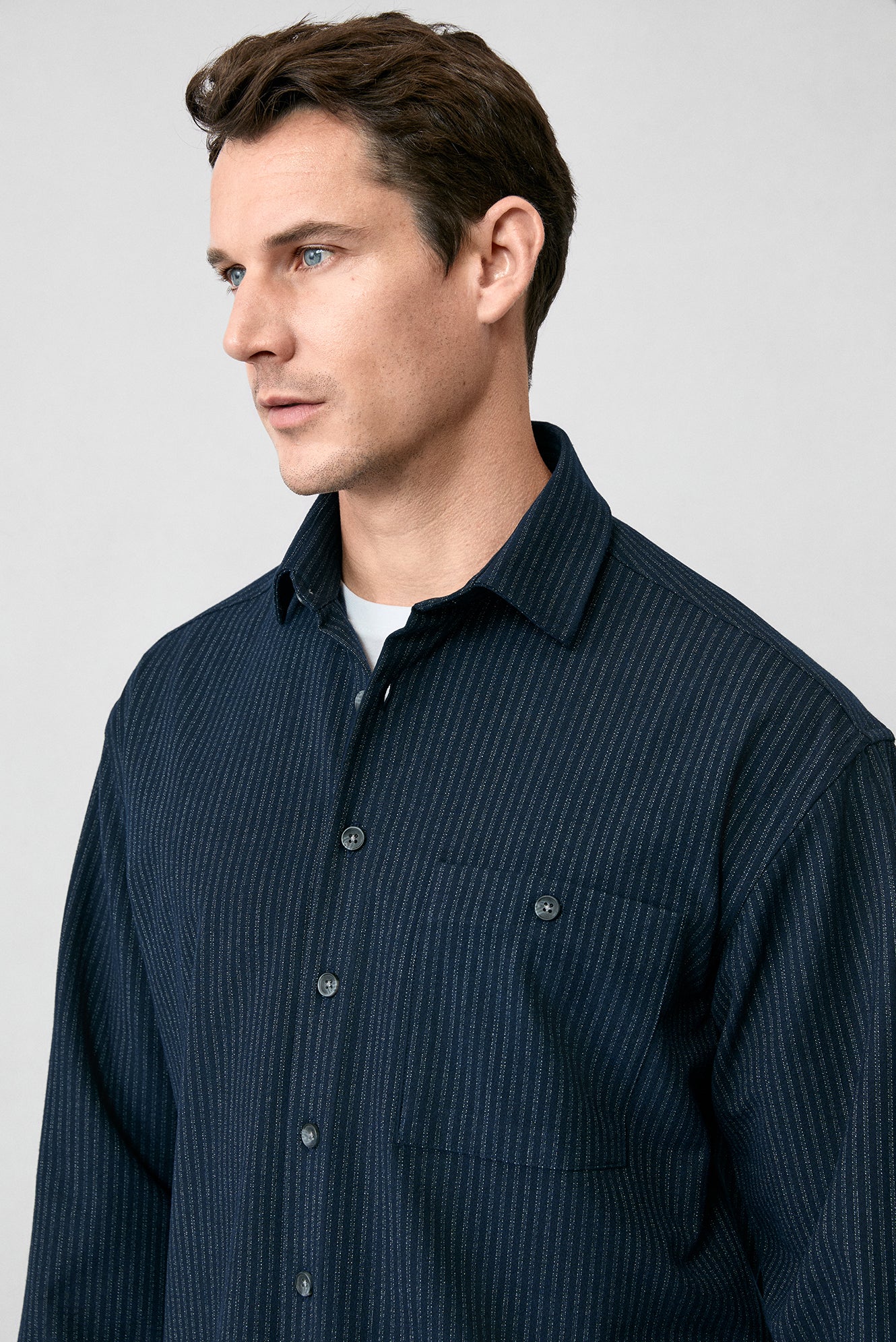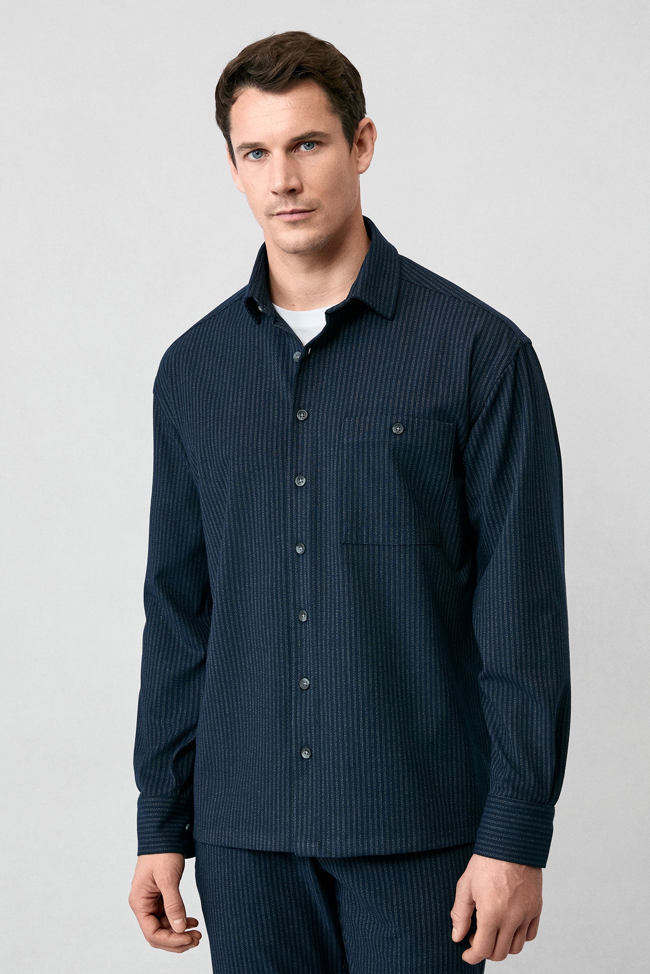Koyu Lacivert Uzun Kol Oversize Ekstra Rahat Kesim Fit Çizgili Spor Gömlek