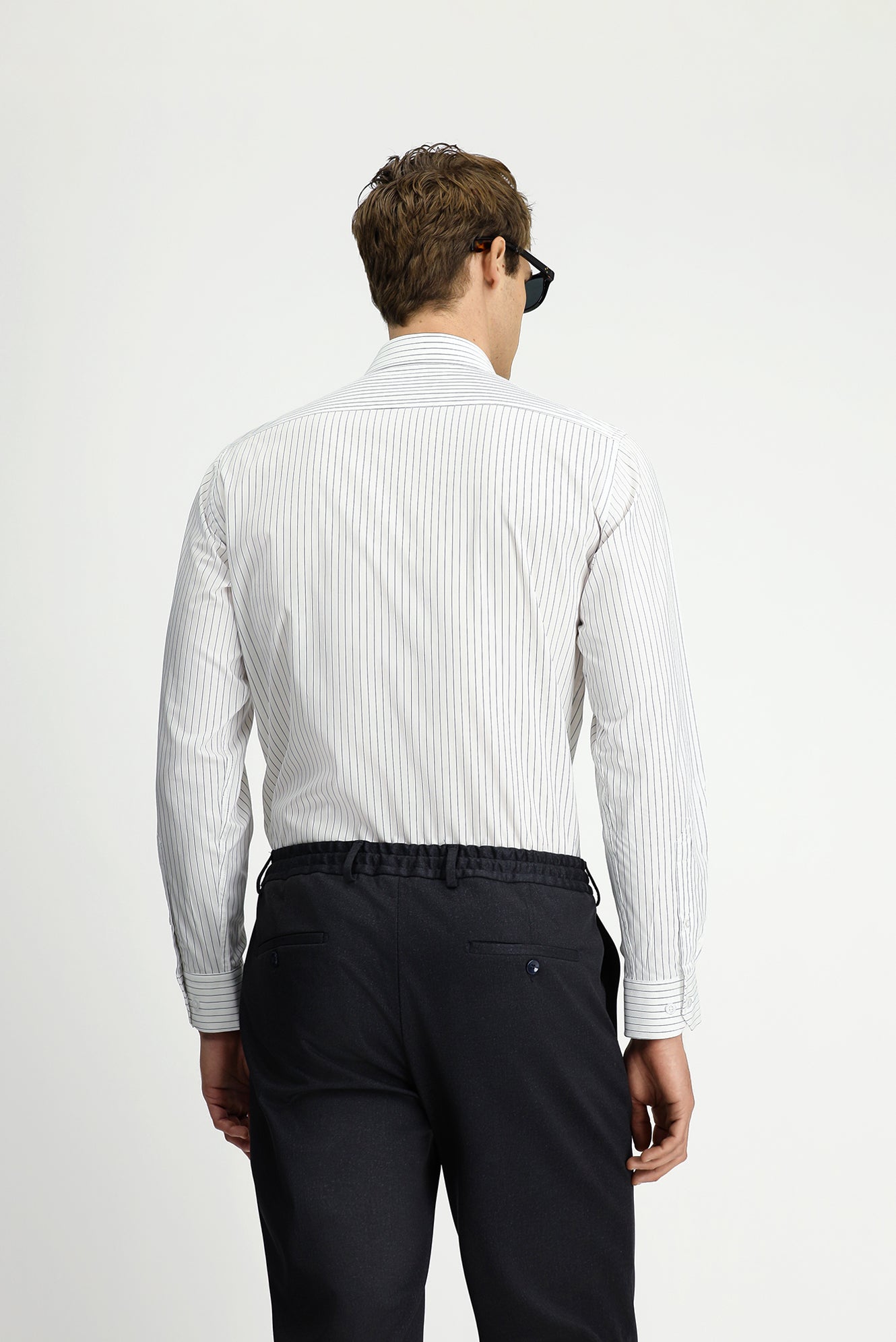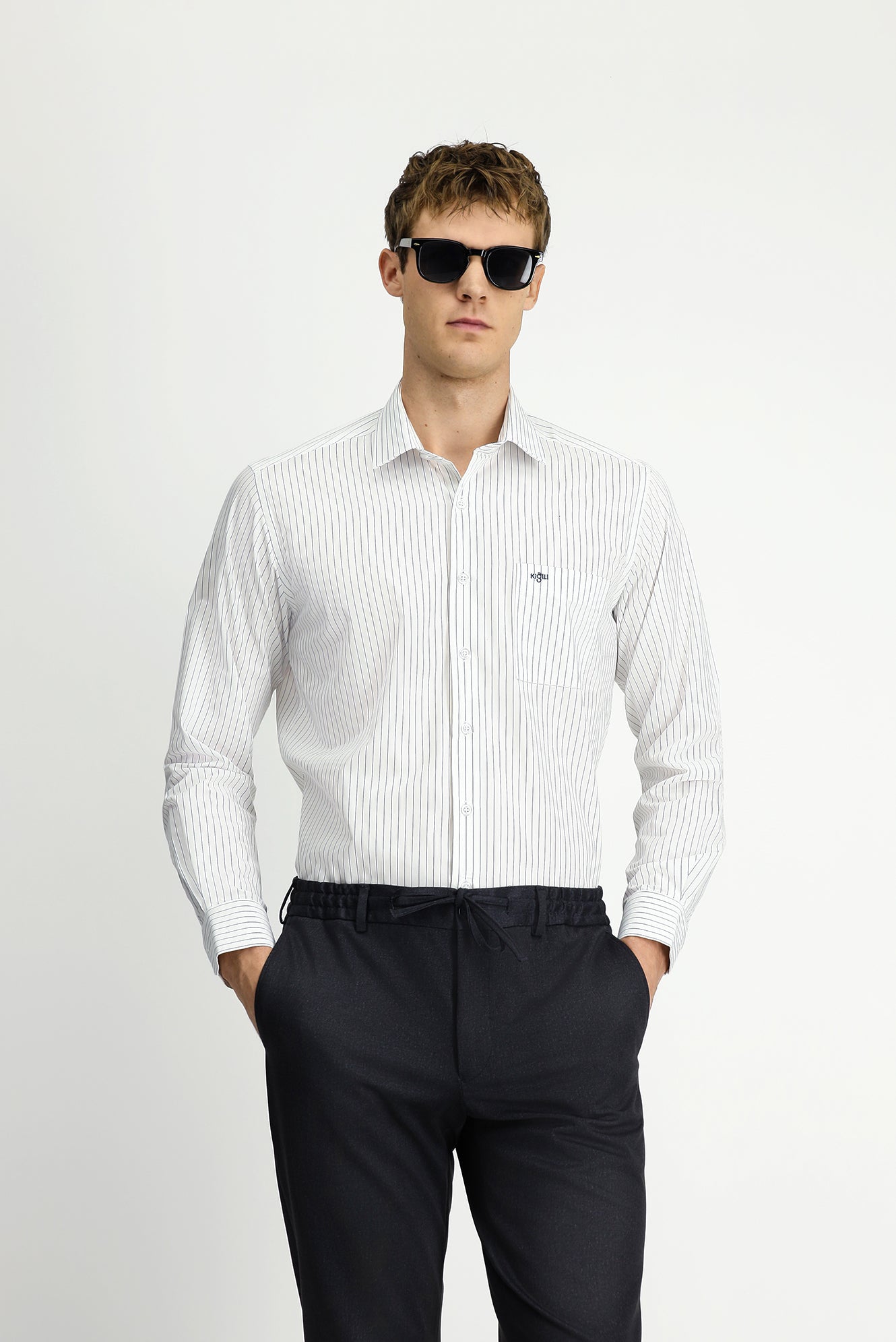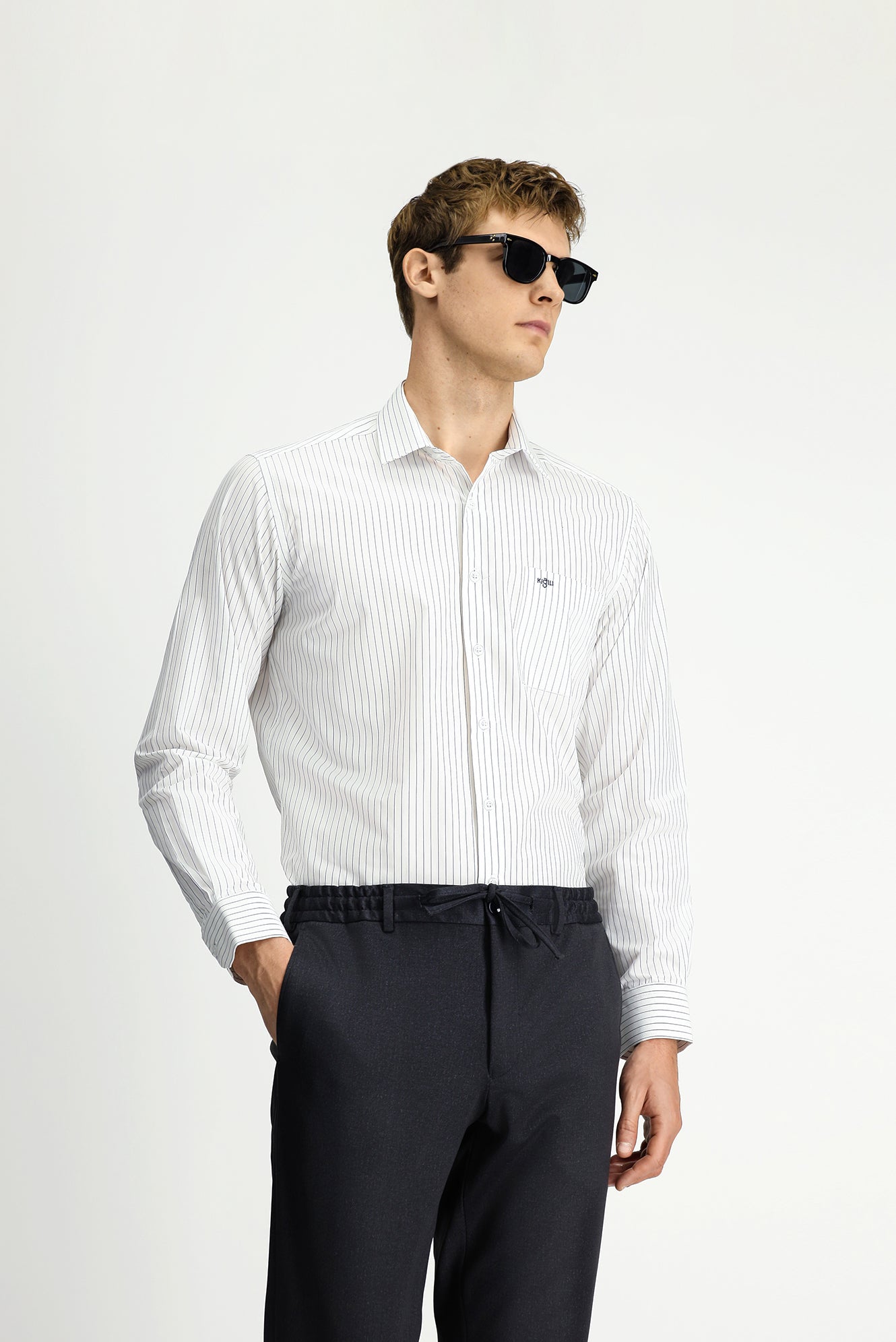 Koyu Lacivert Uzun Kol Klasik Cepli Çizgili Pamuklu Kolay Ütülenebilir Gömlek